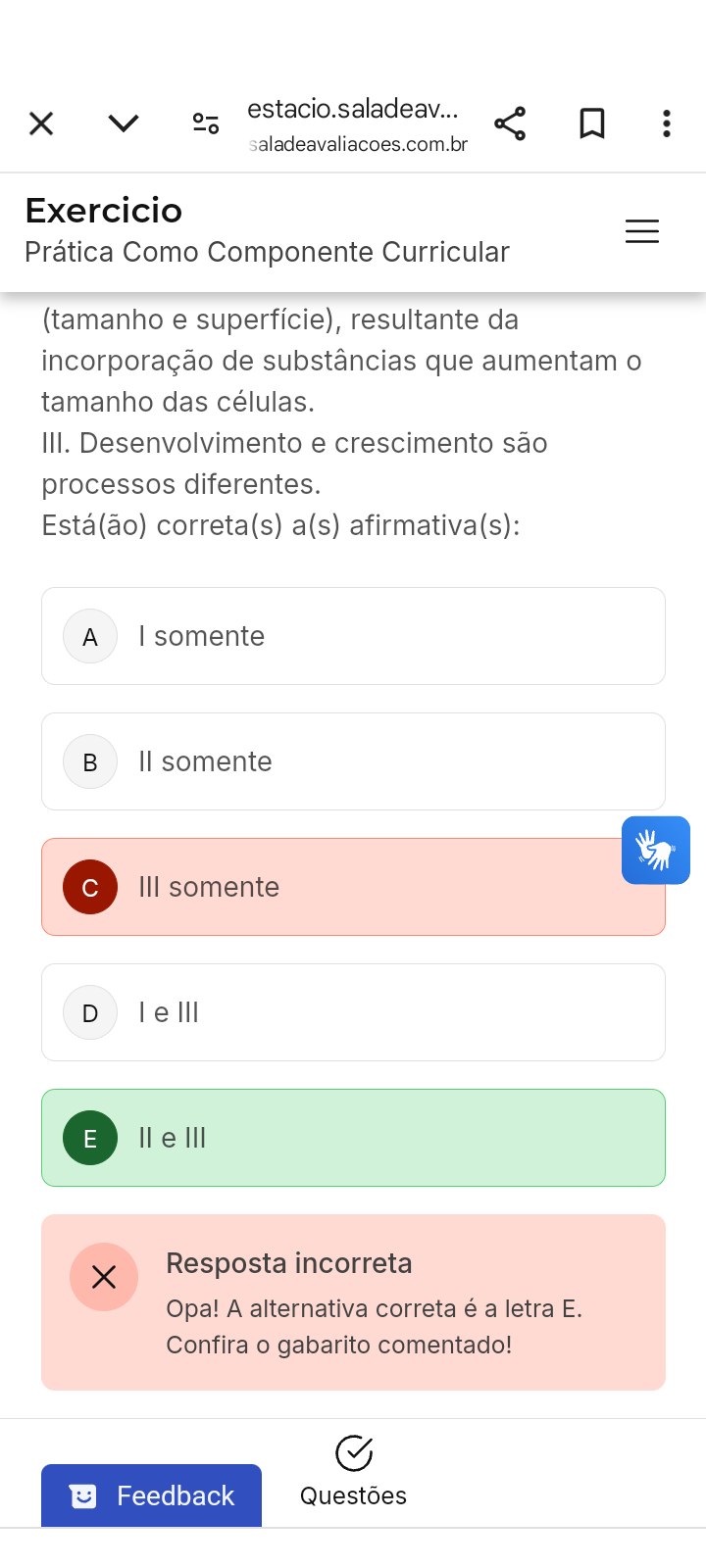 <p>X : saladeavaliacoes.com.br Exercicio Prática Como Componente Curricular (tamanho e superfície), resultante da incorporação de substâncias que aumentam o tamanho das células. III. Desenvolvimento e crescimento são processos diferentes. Está(ão) correta(s) a(s) afirmativa(s): A somente B somente C III somente D e III E e III X Resposta incorreta Opa! A alternativa correta é a letra E. Confira o gabarito comentado! Feedback Questões</p>