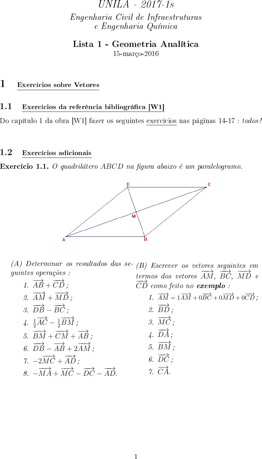 <p>UNILA - 2017-1s</p><p>Engenharia Civil de Infraestruturas</p><p>e Engenharia Química</p><p>Lista 1 - Geometria Analítica</p><p>15-março-2016</p><p>1 Exercícios sobre Vetores</p><p>1.1 Exercícios da referência bibliográ�ca [W1]</p><p>Do capítulo 1 da obra [W1] fazer os seguintes exercícios nas páginas 14-17 : todos !</p><p>1.2 Exercícios adicionais</p><p>Exercício 1.1. O quadrilátero ABCD na �gura abaixo é um paralelogramo.</p><p>(A) Determinar os resultados das se-</p><p>guintes operações :</p><p>1.</p><p>−→</p><p>AB +</p><p>−−→</p><p>CD ;</p><p>2.</p><p>−−→</p><p>AM +</p><p>−−→</p><p>MD ;</p><p>3.</p><p>−−→</p><p>DB −</p><p>−−→</p><p>BC ;</p><p>4. 1</p><p>2</p><p>−→</p><p>AC − 1</p><p>2</p><p>−−→</p><p>BM ;</p><p>5.</p><p>−−→</p><p>BM +</p><p>−−→</p><p>CM +</p><p>−→</p><p>AB ;</p><p>6.</p><p>−−→</p><p>DB −</p><p>−→</p><p>AB + 2</p><p>−−→</p><p>AM ;</p><p>7. −2</p><p>−−→</p><p>MC +</p><p>−−→</p><p>AD ;</p><p>8. −</p><p>−−→</p><p>MA+</p><p>−−→</p><p>MC −</p><p>−−→</p><p>DC −</p><p>−−→</p><p>AD.</p><p>(B) Escrever os vetores seguintes em</p><p>termos dos vetores</p><p>−−→</p><p>AM ,</p><p>−−→</p><p>BC,</p><p>−−→</p><p>MD e−−→</p><p>CD como feito no exemplo :</p><p>1.</p><p>−−→</p><p>AM = 1</p><p>−−→</p><p>AM + 0</p><p>−−→</p><p>BC + 0</p><p>−−→</p><p>MD + 0</p><p>−−→</p><p>CD ;</p><p>2.</p><p>−−→</p><p>BD ;</p><p>3.</p><p>−−→</p><p>MC ;</p><p>4.</p><p>−−→</p><p>DA ;</p><p>5.</p><p>−−→</p><p>BM ;</p><p>6.</p><p>−−→</p><p>DC ;</p><p>7.</p><p>−→</p><p>CA.</p><p>1</p><p>Exercício 1.2. Os vetores ~u, ~v e ~w da �gura seguinte são coplanares. Determinar os</p><p>vetores ~x = 2~u− 3~v + 3</p><p>2</p><p>~w e ~y = −~u+ 1</p><p>2</p><p>~v + 2~w.</p><p>Exercício 1.3. Efetuar as operações solicitadas.</p><p>Exercício 1.4. Na �gura seguinte M e N são pontos médios dos lados. Provar que−−→</p><p>MN ‖</p><p>−−→</p><p>BC e que ||</p><p>−−→</p><p>MN || = 1</p><p>2</p><p>· ||</p><p>−−→</p><p>BC||.</p><p>2</p><p>Exercício 1.5. Dado o hexaedro 1 ABCDEFGH na �gura abaixo</p><p>escrever os vetores seguintes em termos dos vetores</p><p>−→</p><p>AB,</p><p>−→</p><p>AC e</p><p>−→</p><p>AF :</p><p>1.</p><p>−−→</p><p>BF ;</p><p>2.</p><p>−→</p><p>AG ;</p><p>3.</p><p>−→</p><p>AE ;</p><p>4.</p><p>−−→</p><p>BG ;</p><p>5.</p><p>−→</p><p>AB +</p><p>−→</p><p>FG ;</p><p>6.</p><p>−−→</p><p>AD +</p><p>−−→</p><p>HG ;</p><p>7. 2</p><p>−−→</p><p>AD −</p><p>−→</p><p>FG−</p><p>−−→</p><p>BH +</p><p>−−→</p><p>GH.</p><p>Exercício 1.6. Dado o hexágono regular ABCDEF na �gura abaixo</p><p>escrever os vetores seguintes em termos dos vetores</p><p>−−→</p><p>DC e</p><p>−−→</p><p>DE :</p><p>1.</p><p>−−→</p><p>DF ;</p><p>2.</p><p>−−→</p><p>DA ;</p><p>3.</p><p>−−→</p><p>DB ;</p><p>4.</p><p>−−→</p><p>DO ;</p><p>5.</p><p>−−→</p><p>EC ;</p><p>6.</p><p>−−→</p><p>EB ;</p><p>7.</p><p>−−→</p><p>OB.</p><p>Exercício 1.7. Provar que : para cada vetor ~u existe um único vetor que é o</p><p>seu oposto.</p><p>1. Ou paralelepípedo.</p><p>3</p><p>2 Fontes bibliográ�cas.</p><p>Todas as referências aqui citadas referem-se às seguintes obras :</p><p>[W1] WINTERLE, Paulo. VETORES E GEOMETRIA ANALÍTICA. Editora Pearson Makron</p><p>Books, 2000, reimpressão de 2013. (*)</p><p>[LL1] LEITHOLD, Louis. O CÁLCULO COM GEOMETRIA ANALÍTICA, volume I. Editora</p><p>Harbra, 3a edição, 1994. (*)</p><p>[LL2] LEITHOLD, Louis.O CÁLCULO COMGEOMETRIA ANALÍTICA, volume II. Editora</p><p>Harbra, 3a edição, 1994. (*)</p><p>[A1] ÁVILA, Geraldo Severo de Souza. CÁLCULO DAS FUNÇÕES DE UMA VARIÁVEL, volume I. Editora LTC, 7a edição, 2012.</p><p>[BCa] BOULOS, Paulo ; CAMARGO, Ivan de. GEOMETRIA ANALÍTICA : UM TRATAMENTO VETORIAL. Editora Pearson,</p><p>3a edição, 2005. (*) (Ou sua versão mais antiga : [BCb] BOULOS, Paulo ; CAMARGO, Ivan de. GEOMETRIA ANALÍTICA :</p><p>UM TRATAMENTO VETORIAL. Editora McGraw-Hill, 1986.)</p><p>[CCF] CAROLI, Alésio de ; CALLIOLI, Carlos A. ; FEITOSA, Miguel O. MATRIZES, VETORES E GEOMETRIA ANALÍTICA.</p><p>Editora Nobel, 1986. (*)</p><p>[E] EFIMOV, N.. ELEMENTOS DE GEOMETRIA ANALÍTICA. Editora Livraria Cultural Brasileira, Coleção Didática Moderna,</p><p>volume 9, 1972, tradução de David Jardim Júnior e Mário de Oliveira. (Ou sua versão em espanhol : [E-Es] EFIMOV, N.. CURSO</p><p>BREVE DE GEOMETRIA ANALITICA. Editorial Paz, Moscu, s/d., traduccion de la 7a edición rusa por Emiliano Aparicio</p><p>Bernardo. (*))</p><p>[I7a] IEZZI, Gelson. FUNDAMENTOS DE MATEMÁTICA ELEMENTAR - GEOMETRIA ANALÍTICA, volume VII. Editora</p><p>Atual, 5a edição, 2005. (*) (Ou sua versão mais antiga : [I7b] IEZZI, Gelson. FUNDAMENTOS DE MATEMÁTICA ELEMENTAR</p><p>- GEOMETRIA ANALÍTICA, volume VII. Editora Atual, 1a edição, 1977.)</p><p>[K1] KINDLE, Joseph H.. TEORIA Y PROBLEMAS DE GEOMETRIA ANALITICA, PLANA Y DEL ESPACIO. Serie de</p><p>compendios Schaum, McGral-Hill, 1987, traduccion y adaptacion de Luis Gutiérrez Díez y Angel Gutiérrez Vazquez.</p><p>[K2] KLÉTÉNIC, D.. PROBLEMAS DE GEOMETRIA ANALÍTICA. Editora Livraria Cultura Brasileira, Coleção Didática Mo-</p><p>derna, volume 8, 1984, tradução de Regina Régis Junqueira e Mário de Oliveira. (Ou sua versão em espanhol : [K2-Es] KLÉTÉNIC,</p><p>D.. PROBLEMAS DE GEOMETRÍA ANALÍTICA. Editorial Mir, 1968, traducción de Emiliano Aparicio Bernardo.)</p><p>[L1] LEHMANN, Charles H.. GEOMETRIA ANALÍTICA. Editora Globo, 9a edição, 1998, tradução de Ruy Pinto da Silva Siecz-</p><p>kowski. (Ou sua versão em espanhol : [L1-Es] LEHMANN, Charles H.. GEOMETRÍA ANALÍTICA. Limusa Noriega Editores,</p><p>decimetercera reimpresión, 1989, traducción al espa