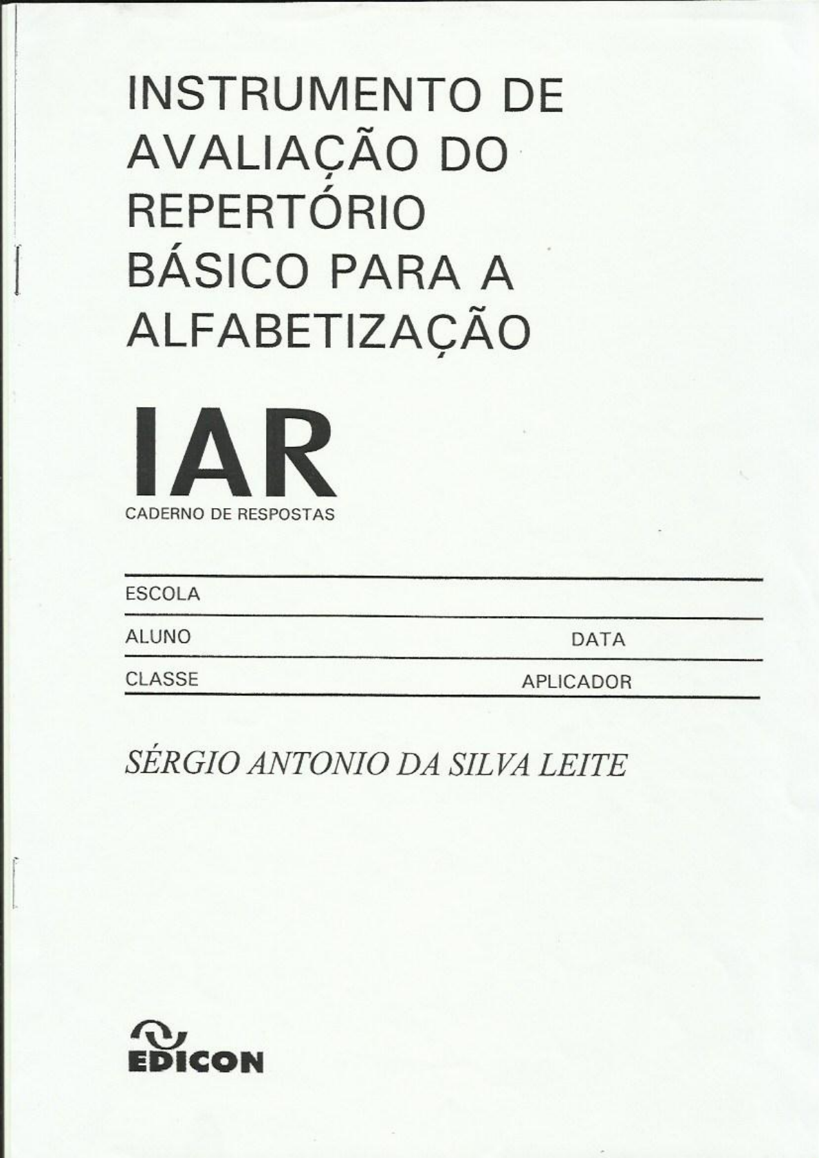 <p>INSTRUMENTO DE DO BÁSICO PARA A ALFABETIZAÇÃO IAR CADERNO DE RESPOSTAS ESCOLA ALUNO DATA CLASSE APLICADOR SERGIO ANTONIO DA SILVA LEITE EDICON</p><p>Esquema corporal AVALIAÇÃO: 1) Pintar a cabeça de amarelo: 2) Pintar os braços de vermelho: 3) Pintar as pernas de verde: 4) Desenhar os olhos: 5) Desenhar o nariz: 6) Desenhar a boca: [ 2</p><p>II Lateralidade AVALIAÇÃO: 1) Pintar a árvore que está à direita: 2) Pintar o carro que está à esquerda: 3) Pintar de amarelo o que a menina tem na mão direita: 4) Pintar de vermelho o que a menina tem na mão esquerda: 3</p><p>III Posição AVALIAÇÃO: 1) Pintar de vermelho a bola que está abaixo do gato: 2) Pintar de verde a bola que está em cima do gato: 3) Pintar de vermelho a flor que está dentro do vaso: 4) Pintar de amarelo a flor que está ao lado do vaso: 5) Pintar de verde o carro que está em frente da garagem: 6) Pintar de amarelo o carro que está atrás da garagem: 4</p><p>IV Direção AVALIAÇÃO: 1) Pintar de vermelho o caminhão que está indo para cima: 2) Pintar de verde o caminhão que está indo para baixo: V Espaço AVALIAÇÃO: 1) Marcar um X no pintinho que está mais perto da mãe: 2) Fazer uma bola em volta do pintinho que está mais longe da mãe: 5</p><p>VI Tamanho AVALIAÇÃO: 1) Marcar com X o pato menor: 2) Pintar o pato maior: 3) Marcar com X o lápis grande: 4) Fazer uma bola no lápis pequeno: 5) Pintar o livro mais grosso: 6) Marcar com X o livro mais fino: 6</p><p>7) 8) 1</p><p>VII Quantidade AVALIAÇÃO: 1) Marcar com um X a bola onde tem mais borboletas: 2) Pintar a bola onde tem menos borboletas: 3) Marcar com um X o copo mais cheio: 4) Pintar o copo vazio: 5) Marcar com um X a bola com muitas bandeiras: 6) Pintar a bola com nenhuma bandeira: 8</p><p>VIII Forma AVALIAÇÃO: 1) Marcar com X o círculo: 2) Fazer uma bola em volta de retângulo: 3) Pintar de vermelho o quadrado: 4) Pintar de verde o triângulo: IX Discriminação visual AVALIAÇÃO: 1) Marcar com um X o desenho diferente: 9</p><p>2) Fazer uma bola em volta da palavra diferente: fogo figo fogo fogo 3) Ligar as palavras iguais: bico EXEMPLO pato pato bico gato dado pato sapo dado gato sapo pato 4) Fazer uma bola em volta das sílabas iguais ao modelo: EXEMPLO VA NA TA VA DA ME NE EM EN ME be de be eb ce 10</p><p>5) Fazer uma bola em volta da palavra igual ao modelo: bola bolo bola boa panela janela canela panela 6) Fazer uma bola em volta das letras iguais ao modelo: EXEMPLO R R A FU R CA R TA CA R b cubo bode d boa m mato cama 11</p><p>X Discriminação auditiva AVALIAÇÃO: 1) Faça uma bola em volta da figura que comeca com a mesma sílaba do modelo: EXEMPLO (MODELO) 12</p><p>2) Faça uma bola nas figuras que começam com a mesma sílaba: EXEMPLO // // 13</p><p>3) Faça uma bola em volta da figura que termina com a mesma sílaba do modelo: EXEMPLO 00 00 (MODELO) 14</p><p>4) Faça uma bola em volta das figuras que terminam com a mesma sílaba: EXEMPLO 0.0 15</p><p>XI Verbalização da palavra AVALIAÇÃO: 1) Repetir as palavras: - casa - gato - cabide - carro - caro - faca - vaca - sapato - xarope - zazá - cutuca - caduca - carta - porta - - irmã - escola - biscoito - janela - chave - chinelo - gilete - sol - canal - soldado - cama - cana - campo - tinta - fita - vida - folha - linha - problema - planta - flor - queijo - guerra - pão - bom - prato - briga - livro - trator XII Análise Síntese AVALIAÇÃO: 1) Marcar um com um X o conjunto que contém todas as partes do modelo: EXEMPLO (MODELO) 16</p><p>(MODELO) (MODELO) 2) Marcar com X o conjunto que corresponde ao modelo: ba p d b q a a a a 17</p><p>3) Marcar com X o conjunto que corresponde ao modelo: MALUCO LE LA MA TA MU TA LU LO MA CO MA CA 4) Marcar com X o conjunto que corresponde ao modelo: pe ta te tapado tapete topete tacape 5) Complete o que falta de acordo com o modelo: galo caneta ga ca ta 18</p><p>6) Pronunciar as palavras dividindo-as em sílabas (aplicação individual): GATO BALA DEDO FACA CANETA BONECA PANELA MACACO XIII Coordenação Motora Fina AVALIAÇÃO: Cobrir e completar a lápis os movimentos abaixo: 19</p>