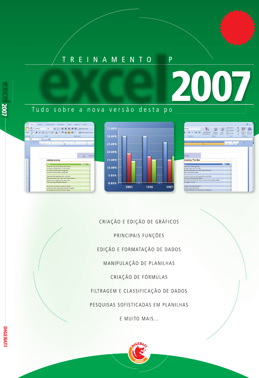 <p>T u d o s o b r e a n o v a v e r s ã o d e s t a p o d e r o s a f e r r a m e n t a</p><p>Eduardo Moraz</p><p>T R E I N A M E N T O P R Á T I C O E M</p><p>B</p><p>O</p><p>O</p><p>K</p><p>S</p><p>TREIN</p><p>A</p><p>M</p><p>EN</p><p>TO</p><p>PRÁ</p><p>TICO</p><p>EM</p><p>O novo Microsoft Excel 2007</p><p>Neste livro você encontrará um guia completo para usar os novos recursos</p><p>da mais recente versão do Microsoft Excel. Além disso, terá acesso a um guia</p><p>profissional voltado para o mercado de trabalho e ideal para quem atua nas</p><p>áreas de administração, vendas, engenharia, finanças, bancos, publicidade, pro-</p><p>gramação, entre outras.</p><p>Nas páginas deste livro você aprenderá de maneira prática e descomplicada</p><p>a usar os mais importantes recursos oferecidos por esta ferramenta indispen-</p><p>sável no dia-a-dia de trabalho, incluindo:</p><p>• Criação de gráficos</p><p>• Edição de planilhas</p><p>• Inserção e remoção de planilhas</p><p>• Uso de diferentes tipos de dados</p><p>• Formatação de dados</p><p>• Localização e substituição de dados</p><p>• Cálculos em planilhas</p><p>• Cálculo de média e autosoma</p><p>• Inclusão de fórmulas no Excel</p><p>• Classificação simples de dados</p><p>• Filtragem simples de dados</p><p>excelexcel</p><p>Conheça</p><p>os novos</p><p>recursos da</p><p>versão 2007</p><p>do Excel!</p><p>Untitled-1 1Untitled-1 1 08/02/2007 15:01:5108/02/2007 15:01:51</p><p>Eduardo Moraz</p><p>T R E I N A M E N T O P R Á T I C O E M</p><p>excel</p><p>iniciais.indd 1iniciais.indd 1 8/2/2007 17:51:578/2/2007 17:51:57</p><p>© 2007 by Digerati Books</p><p>Todos os direitos reservados e protegidos pela Lei 9.610 de 19/02/1998.</p><p>Nenhuma parte deste livro, sem autorização prévia por escrito da editora,</p><p>poderá ser reproduzida ou transmitida sejam quais forem os meios emprega-</p><p>dos: eletrônicos, mecânicos, fotográfi cos, gravação ou quaisquer outros.</p><p>Dados Internacionais de Catalogação na Publicação (CIP)</p><p>(Câmara Brasileira do Livro, SP, Brasil)</p><p>Diretor Editorial</p><p>Luis Matos</p><p>Assistência Editorial</p><p>Monalisa Neves</p><p>Erika Sá</p><p>Preparação dos originais</p><p>Ricardo Dino de Freitas</p><p>Revisão</p><p>Eduardo Moreira</p><p>Projeto Gráfi co</p><p>Daniele Fátima</p><p>Diagramação</p><p>Rogério Chagas</p><p>Daniele Fátima</p><p>Capa</p><p>Laboratório do Livro</p><p>Universo dos Livros Editora Ltda.</p><p>Rua Tito, 1.609</p><p>CEP 05051-001 • São Paulo/SP</p><p>Telefone: (11) 3648-9090 • Fax: (11) 3648-9083</p><p>www.universodoslivros.com.br</p><p>e-mail: editor@universodoslivros.com.br</p><p>Conselho Administrativo: Alessandro Gerardi, Alessio Fon Melozo,</p><p>Luis Afonso G. Neira, Luis Matos e William Nakamura.</p><p>M832t Moraz, Eduardo.</p><p>Treinamento Prático em Excel 2007 / Eduardo</p><p>Moraz. –– São Paulo : Digerati Books, 2007.</p><p>128 p.</p><p>ISBN 978-85-60480-15-9</p><p>1. Excel (Programa de computador).</p><p>2. Planilhas eletrônicas. I. Título.</p><p>CDD 005.3</p><p>iniciais.indd 2iniciais.indd 2 8/2/2007 17:52:038/2/2007 17:52:03</p><p>Sumário</p><p>Capítulo 1</p><p>Introdução ................................................................... 5</p><p>Iniciando o Excel 2007 .........................................................................6</p><p>Capítulo 2</p><p>A tela do Excel 2007 .................................................... 9</p><p>A área de trabalho .............................................................................10</p><p>Capítulo 3</p><p>Arquivos e compatibilidade ....................................... 21</p><p>Visualizando as extensões de arquivos ...........................................22</p><p>O formato de arquivos do Excel 2007 ..............................................25</p><p>O Excel 2007 e o formato Adobe PDF ..............................................30</p><p>Arquivos temporários ....................................................................... 34</p><p>Histograma ........................................................................................ 34</p><p>Segurança de documentos ...............................................................36</p><p>Capítulo 4</p><p>Pasta de trabalho/planilhas ....................................... 39</p><p>Disposição de uma planilha ............................................................. 40</p><p>Seleção de células ............................................................................ 40</p><p>Alça de preenchimento .................................................................... 44</p><p>Ajustando o tamanho de linhas e colunas ...................................... 46</p><p>Inserindo, removendo e renomeando planilhas ............................. 48</p><p>Capítulo 5</p><p>Dados em planilhas .................................................... 51</p><p>Tipos de dados ...................................................................................52</p><p>Localização e substituição de dados ................................................62</p><p>Exclusão e inserção de linhas ou colunas .......................................66</p><p>Desfazendo e refazendo ações (Undo/Redo) ..................................69</p><p>Capítulo 6</p><p>Cálculos em planilhas ................................................. 71</p><p>Média e soma automáticas ...............................................................72</p><p>AutoSoma (Sum) ...............................................................................75</p><p>Fórmulas no Excel .............................................................................78</p><p>iniciais.indd 3iniciais.indd 3 8/2/2007 17:52:038/2/2007 17:52:03</p><p>Mensagens de erros em fórmulas ................................................... 83</p><p>Referências entre células contendo fórmulas ....................