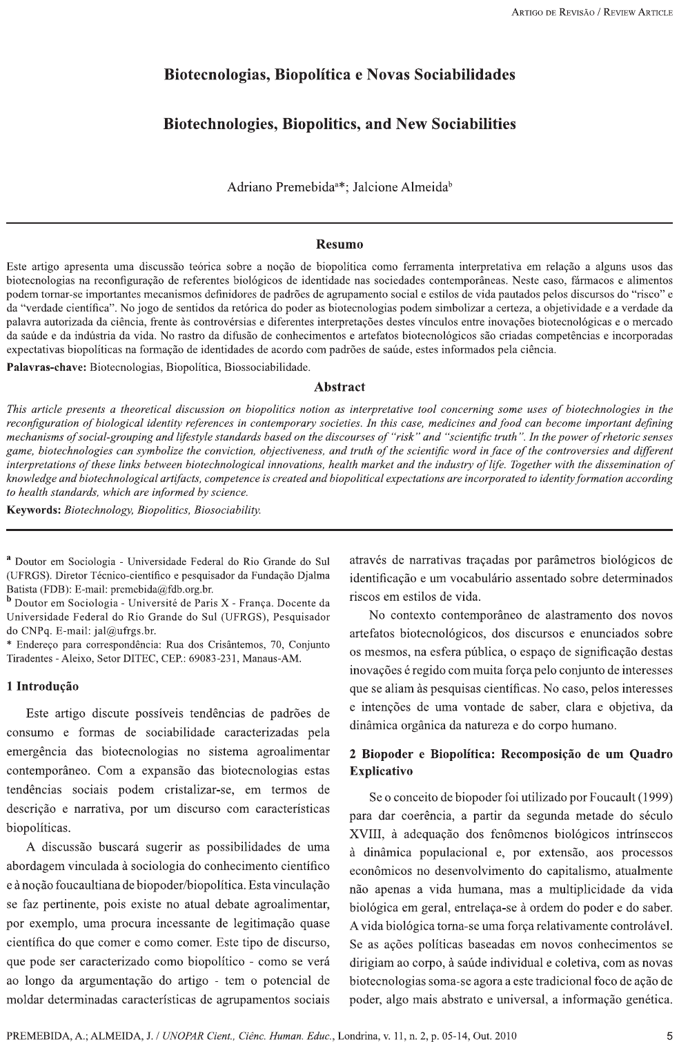 <p>ARTIGO DE REVISÃO / REVIEW ARTICLE Biotecnologias, Biopolítica e Novas Sociabilidades Biotechnologies, Biopolitics, and New Sociabilities Adriano Jalcione Resumo Este artigo apresenta uma discussão teórica sobre a noção de biopolítica como ferramenta interpretativa em relação a alguns usos das biotecnologias na reconfiguração de referentes biológicos de identidade nas sociedades Neste caso, fármacos e alimentos podem tornar-se importantes mecanismos definidores de padrões de agrupamento social e estilos de vida pautados pelos discursos do "risco" e da "verdade científica". No jogo de sentidos da retórica do poder as biotecnologias podem simbolizar a certeza. a objetividade e a verdade da palavra autorizada da ciência. frente às controvérsias e diferentes interpretações destes vínculos entre inovações biotecnológicas e o mercado da saúde e da indústria da vida. No rastro da difusão de conhecimentos e artefatos biotecnológicos são criadas competências e incorporadas expectativas biopolíticas na formação de identidades de acordo com padrões de saúde. estes informados pela ciência. Palavras-chave: Biotecnologias, Biopolítica, Biossociabilidade. Abstract This article presents a theoretical discussion on biopolitics notion as interpretative tool concerning some uses of biotechnologies in the reconfiguration of biological identity references in contemporary societies In this case, medicines and food can become important defining mechanisms of social-grouping and lifestyle standards based on the discourses of "risk" and "scientific truth" In the power of rhetoric senses game, biotechnologies can symbolize the conviction, objectiveness, and truth of the scientific word in face of the controversies and different interpretations of these links between biotechnological innovations, health market and the industry of life. Together with the dissemination of knowledge and biotechnological artifacts, competence is created and biopolitical expectations are incorporated to identity formation according to health standards, which are informed by science. Keywords: Biotechnology, Biopolitics, a Doutor em Sociologia Universidade Federal do Rio Grande do Sul através de narrativas traçadas por parâmetros biológicos de (UFRGS). Diretor e pesquisador da Fundação Djalma identificação e um vocabulário assentado sobre determinados Batista (FDB): E-mail: premebida@fdb.org.br h riscos em estilos de vida. Doutor em Sociologia Université de Paris X Docente da Universidade Federal do Rio Grande do Sul (UFRGS), Pesquisador No contexto contemporâneo de alastramento dos novos do CNPq. E-mail: jal@ufrgs.br. artefatos biotecnológicos, dos discursos e enunciados sobre Endereço para correspondência: Rua dos 70. Conjunto os mesmos, na esfera pública, o espaço de significação destas Tiradentes Aleixo, Setor DITEC, 69083-231, inovações é regido com muita força pelo conjunto de interesses 1 Introdução que se aliam às pesquisas científicas. No caso, pelos interesses Este artigo discute possíveis tendências de padrões de e intenções de uma vontade de clara e objetiva, da dinâmica orgânica da natureza e do corpo humano. consumo e formas de sociabilidade caracterizadas pela emergência das biotecnologias no sistema agroalimentar 2 Biopoder e Biopolítica: Recomposição de um Quadro contemporâneo. Com a expansão das biotecnologias estas Explicativo tendências sociais podem cristalizar-se, em termos de Se o conceito de biopoder foi utilizado por Foucault (1999) descrição e narrativa, por um discurso com características para dar a partir da segunda metade do século biopolíticas. XVIII, à adequação dos fenômenos biológicos intrínsecos A discussão buscará sugerir as possibilidades de uma à dinâmica populacional por extensão, aos processos abordagem vinculada à sociologia do conhecimento científico econômicos no desenvolvimento do capitalismo, atualmente e à noção foucaultiana de Esta vinculação não apenas a vida humana. mas a multiplicidade da vida se faz pertinente, pois existe no atual debate agroalimentar, biológica em geral, entrelaça-se à ordem do poder e do saber. por exemplo, uma procura incessante de legitimação quase A vida biológica torna-se uma força relativamente controlável. científica do que comer e como comer. Este tipo de discurso, Se as ações políticas baseadas em novos conhecimentos se que pode ser caracterizado como biopolítico como se verá dirigiam ao corpo, à saúde individual e coletiva, com as novas ao longo da argumentação do artigo tem o potencial de biotecnologias soma-se agora a este tradicional foco de ação de moldar determinadas características de agrupamentos sociais poder, algo mais abstrato e universal, a informação genética. PREMEBIDA, ALMEIDA, UNOPAR Cient. Ciênc. Human. Educ.. Londrina, V. 11. n. 2. p. 05-14. Out. 2010 5</p><p>Biotecnologias, Biopolítica e Novas Sociabilidades As "tecnologias políticas que, a partir de então, vão 3 A Vida como Política investir sobre o corpo, a saúde, as maneiras de se alimentar e A politização da zoe, ou seja, a "vida nua" (AGAMBEN, de morar, as condições de vida, todo o espaço da existência" 2002), a vida compartilhada entre todos os seres vivos, não (FOUCAULT, 1999, p. 135), permitem um salto a mais se restringindo apenas à vida humana, mas à vida em geral, nesta direção de administração da vida. Esta sobreposição diferentemente de acordo com a designação aristotélica da e transição discursiva decorrente das possibilidades de bios, vida politicamente qualificada, própria da humanidade, controle e manipulação da vida biológica conferem formas vida acima das necessidades básicas, cumpre, segundo as interessantes e únicas (historicamente) de recomendação de estruturas e lógicas do sistema de poder contemporâneo, condutas de vida e formas de existência. com maior facilidade, as estratégias de potencializar, mold