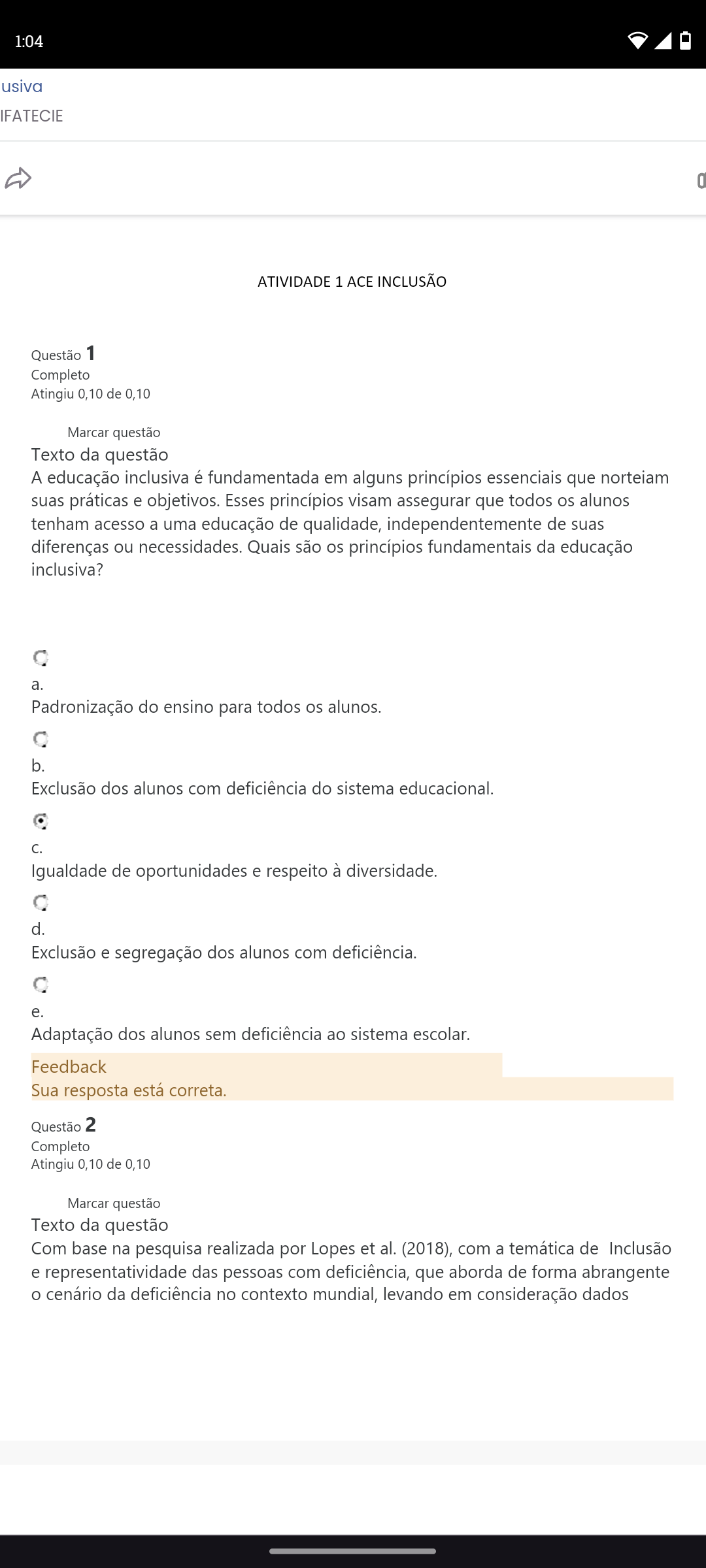 <p>usiva IFATECIE a ATIVIDADE 1 ACE INCLUSÃO Questão 1 Completo Atingiu 0,10 de 0,10 Marcar questão Texto da questão A educação inclusiva é fundamentada em alguns princípios essenciais que norteiam suas práticas e objetivos. Esses princípios visam assegurar que todos os alunos tenham acesso a uma educação de qualidade, independentemente de suas diferenças ou necessidades. Quais são os princípios fundamentais da educação inclusiva? a. Padronização do ensino para todos os alunos. b. Exclusão dos alunos com deficiência do sistema educacional. C. Igualdade de oportunidades e respeito à diversidade. d. Exclusão e segregação dos alunos com deficiência. e. Adaptação dos alunos sem deficiência ao sistema escolar. Feedback Sua resposta está correta. Questão 2 Completo Atingiu 0,10 de 0,10 Marcar questão Texto da questão Com base na pesquisa realizada por Lopes et al. (2018), com a temática de Inclusão e representatividade das pessoas com deficiência, que aborda de forma abrangente o cenário da deficiência no contexto mundial, levando em consideração dados</p>