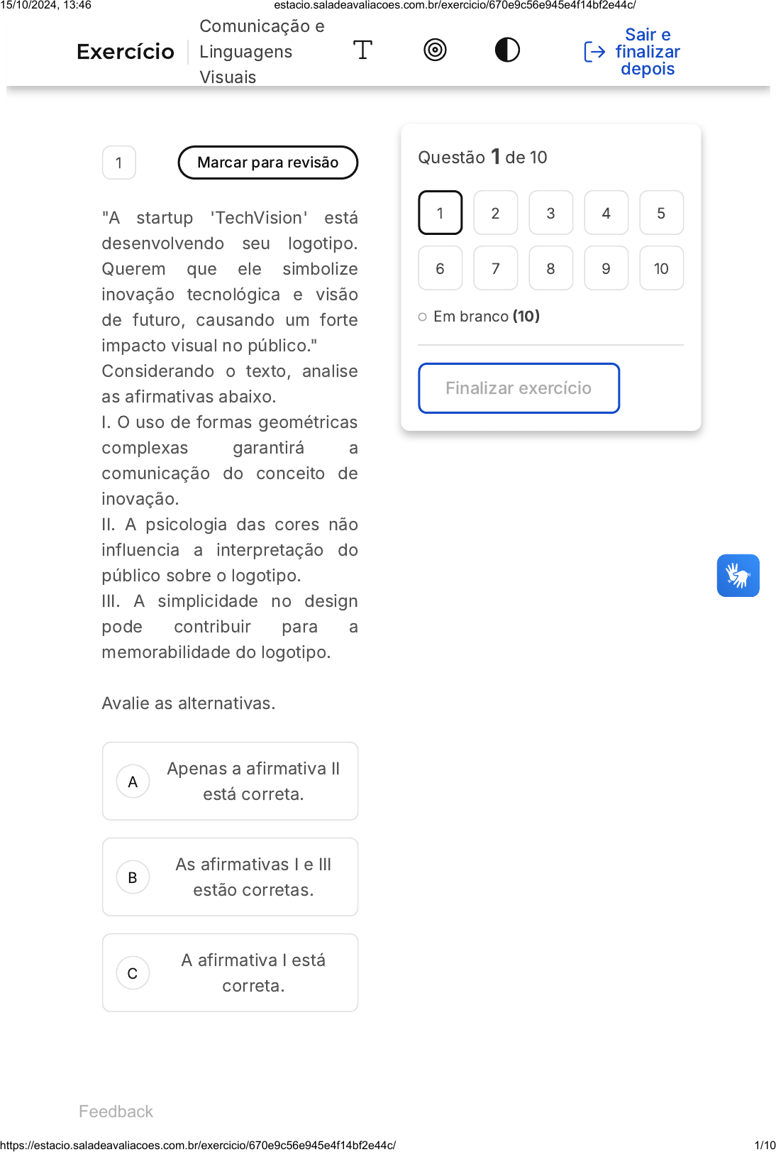 <p>A</p><p>B</p><p>C</p><p>1 Marcar para revisão</p><p>"A startup 'TechVision' está</p><p>desenvolvendo seu logotipo.</p><p>Querem que ele simbolize</p><p>inovação tecnológica e visão</p><p>de futuro, causando um forte</p><p>impacto visual no público."</p><p>Considerando o texto, analise</p><p>as afirmativas abaixo.</p><p>I. O uso de formas geométricas</p><p>complexas garantirá a</p><p>comunicação do conceito de</p><p>inovação.</p><p>II. A psicologia das cores não</p><p>influencia a interpretação do</p><p>público sobre o logotipo.</p><p>III. A simplicidade no design</p><p>pode contribuir para a</p><p>memorabilidade do logotipo.</p><p>Avalie as alternativas.</p><p>Apenas a afirmativa II</p><p>está correta.</p><p>As afirmativas I e III</p><p>estão corretas.</p><p>A afirmativa I está</p><p>correta.</p><p>Questão 1 de 10</p><p>Em branco �10�</p><p>Finalizar exercício</p><p>1 2 3 4 5</p><p>6 7 8 9 10</p><p>Feedback</p><p>Exercício</p><p>Comunicação e</p><p>Linguagens</p><p>Visuais</p><p>Sair e</p><p>finalizar</p><p>depois</p><p>15/10/2024, 13:46 estacio.saladeavaliacoes.com.br/exercicio/670e9c56e945e4f14bf2e44c/</p><p>https://estacio.saladeavaliacoes.com.br/exercicio/670e9c56e945e4f14bf2e44c/ 1/10</p><p>D</p><p>E</p><p>A</p><p>B</p><p>C</p><p>Apenas a afirmativa III</p><p>está correta.</p><p>As afirmativas II e III</p><p>estão corretas.</p><p>2 Marcar para revisão</p><p>A gramática visual, quando</p><p>bem aplicada, serve como uma</p><p>ponte entre a intenção do</p><p>artista e a interpretação do</p><p>público. É um elemento-chave</p><p>na construção de mensagens</p><p>visuais que não só agradam</p><p>esteticamente, mas também</p><p>comunicam de forma clara e</p><p>eficaz.</p><p>O que é mais importante ao</p><p>aplicar a gramática visual no</p><p>design de comunicações?</p><p>Usar um único tipo de</p><p>fonte para</p><p>simplicidade.</p><p>Aplicar cores</p><p>aleatoriamente para</p><p>diversidade.</p><p>Ignorar os princípios</p><p>de espaço e</p><p>contraste.</p><p>15/10/2024, 13:46 estacio.saladeavaliacoes.com.br/exercicio/670e9c56e945e4f14bf2e44c/</p><p>https://estacio.saladeavaliacoes.com.br/exercicio/670e9c56e945e4f14bf2e44c/ 2/10</p><p>D</p><p>E</p><p>A</p><p>B</p><p>C</p><p>D</p><p>E</p><p>Entender e aplicar</p><p>adequadamente os</p><p>signos visuais.</p><p>Evitar padrões para</p><p>prevenir a</p><p>previsibilidade.</p><p>3 Marcar para revisão</p><p>Ana, uma designer gráfica, foi</p><p>contratada para criar um pôster</p><p>para um festival de música. Ela</p><p>deseja usar um padrão que</p><p>possua uma sensação de</p><p>movimento e fluidez, sem</p><p>repetições contínuas.</p><p>Qual conceito de design Ana</p><p>deve empregar em sua</p><p>composição?</p><p>Padronagem contínua.</p><p>Ritmo constante.</p><p>Equilíbrio assimétrico.</p><p>Ritmos pontuados por</p><p>mudanças e</p><p>variações.</p><p>Simetria horizontal.</p><p>15/10/2024, 13:46 estacio.saladeavaliacoes.com.br/exercicio/670e9c56e945e4f14bf2e44c/</p><p>https://estacio.saladeavaliacoes.com.br/exercicio/670e9c56e945e4f14bf2e44c/ 3/10</p><p>A</p><p>B</p><p>C</p><p>D</p><p>E</p><p>4 Marcar para revisão</p><p>Indique uma importante</p><p>contribuição da época</p><p>renascentista para a história da</p><p>linguagem visual:</p><p>A relação entre cores</p><p>opostas no círculo</p><p>cromático.</p><p>A descoberta da</p><p>tridimensionalidade.</p><p>A mobilidade dos</p><p>afrescos.</p><p>O desenvolvimento da</p><p>perspectiva.</p><p>O apelo mágico-</p><p>religioso dos</p><p>elementos visuais.</p><p>5 Marcar para revisão</p><p>O equilíbrio visual é alcançado</p><p>quando os elementos de uma</p><p>composição estão distribuídos</p><p>de forma que não pareçam</p><p>sobrecarregados ou</p><p>desalinhados. Esse princípio</p><p>ajuda a criar harmonia e</p><p>estabilidade em uma</p><p>apresentação gráfica.</p><p>15/10/2024, 13:46 estacio.saladeavaliacoes.com.br/exercicio/670e9c56e945e4f14bf2e44c/</p><p>https://estacio.saladeavaliacoes.com.br/exercicio/670e9c56e945e4f14bf2e44c/ 4/10</p><p>A</p><p>B</p><p>C</p><p>D</p><p>E</p><p>Qual dos seguintes pares de</p><p>elementos pode ser usado para</p><p>alcançar o equilíbrio visual em</p><p>uma composição?</p><p>Objetos grandes e</p><p>objetos pequenos.</p><p>Cores quentes e ritmo</p><p>rápido.</p><p>Simetria e ritmo de</p><p>repetição.</p><p>Padronagem contínua</p><p>e cores frias.</p><p>Harmonia e contraste</p><p>de forma.</p><p>6 Marcar para revisão</p><p>Ao desenvolver um cartaz para</p><p>um evento, João deseja que as</p><p>informações principais estejam</p><p>em equilíbrio, mas sem parecer</p><p>estático. Ele pensa em usar um</p><p>conceito de design para</p><p>alcançar esse efeito.</p><p>Qual estratégia João deve</p><p>adotar para obter um design</p><p>dinâmico, mas equilibrado?</p><p>15/10/2024, 13:46 estacio.saladeavaliacoes.com.br/exercicio/670e9c56e945e4f14bf2e44c/</p><p>https://estacio.saladeavaliacoes.com.br/exercicio/670e9c56e945e4f14bf2e44c/ 5/10</p><p>A</p><p>B</p><p>C</p><p>D</p><p>E</p><p>Usar ritmo contínuo.</p><p>Adotar simetria</p><p>horizontal.</p><p>Implementar equilíbrio</p><p>assimétrico.</p><p>Manter elementos</p><p>distantes.</p><p>Agrupar todos os</p><p>elementos no centro.</p><p>7 Marcar para revisão</p><p>Em relação à cor, leia as</p><p>afirmativas abaixo.</p><p>I. O tom é a alteração</p><p>qualitativa da cor, se relaciona</p><p>diretamente aos diversos</p><p>comprimentos de onda.</p><p>II. Uma cor com branco nos dá</p><p>um matiz; já uma com preto,</p><p>um sombreado.</p><p>III. A luminosidade é a</p><p>capacidade de qualquer cor</p><p>refletir a luz preta que há nela.</p><p>IV. Temos uma cor saturada</p><p>quando, em sua composição,</p><p>só entram o branco e o preto.</p><p>Dentre as afirmativas acima,</p><p>assinale a alternativa correta.</p><p>15/10/2024, 13:46 estacio.saladeavaliacoes.com.br/exercicio/670e9c56e945e4f14bf2e44c/</p><p>https://est