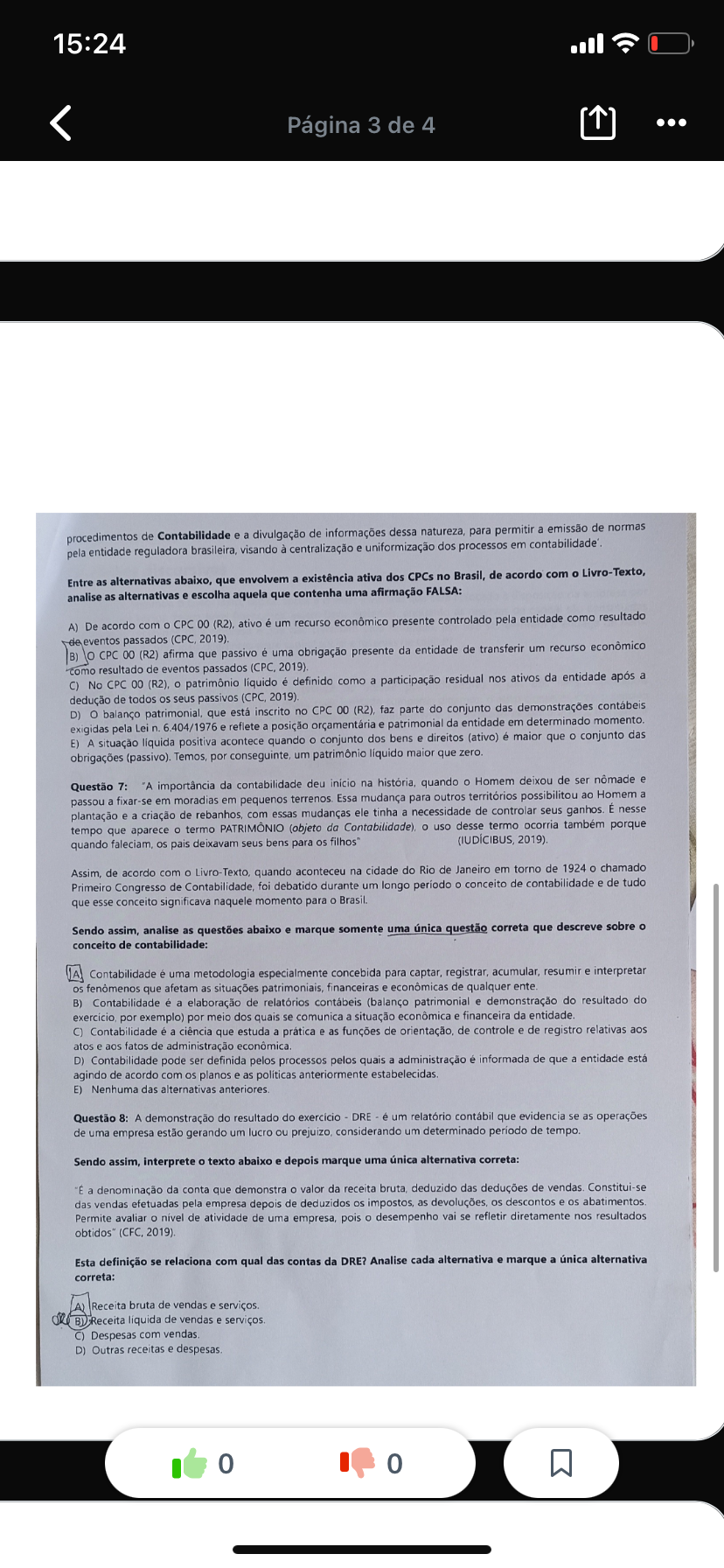 <p>Página 3 de 4 procedimentos de Contabilidade e a divulgação de informações dessa natureza, para permitir a emissão de normas pela entidade reguladora brasileira, visando à centralização e uniformização dos processos em Entre as alternativas abaixo, que envolvem a existência ativa dos CPCs no Brasil, de acordo com o Livro-Texto, analise as alternativas e escolha aquela que contenha uma afirmação FALSA: A) De acordo com CPC 00 ativo é um recurso econômico presente controlado pela entidade como resultado de eventos passados (CPC, 2019). B) CPC 00 (R2) afirma que passivo é uma obrigação presente da entidade de transferir um recurso econômico como resultado de eventos passados (CPC, 2019). C) No CPC 00 (R2), patrimônio é definido como a participação residual nos ativos da entidade após a dedução de todos os seus passivos (CPC, 2019). D) patrimonial, que está inscrito no CPC 00 (R2), faz parte do conjunto das demonstrações exigidas pela Lei n. 6.404/1976 e reflete a posição orçamentária e patrimonial da entidade em determinado E) A situação positiva acontece quando conjunto dos bens e direitos (ativo) é maior que conjunto das obrigações (passivo). Temos, por conseguinte, um patrimônio líquido maior que zero. Questão 7: "A importância da contabilidade deu inicio na história, quando Homem deixou de ser nômade e passou a fixar-se em moradias em pequenos Essa mudança para outros territórios possibilitou ao Homem a plantação e a criação de com essas mudanças ele tinha a necessidade de controlar seus ganhos. É nesse tempo que aparece termo PATRIMÔNIO (objeto da Contabilidade), uso desse termo ocorria também porque quando faleciam, os pais deixavam seus bens para os filhos" 2019). Assim, de acordo com o quando aconteceu na cidade do Rio de Janeiro em torno de 1924 chamado Primeiro Congresso de foi debatido durante um longo período conceito de contabilidade e de tudo que esse conceito significava naquele momento para Sendo assim, analise as questões abaixo e marque somente uma única questão correta que descreve sobre conceito de contabilidade: Contabilidade é uma metodologia especialmente concebida para captar, registrar, acumular, resumir e interpretar os que afetam as situações patrimoniais, financeiras e econômicas de qualquer ente. B) Contabilidade é a elaboração de relatórios contábeis (balanço patrimonial e demonstração do resultado do por exemplo) por meio dos quais se comunica a situação econômica e financeira da entidade. C) Contabilidade é a ciência que estuda a prática e as funções de orientação, de controle e de registro relativas aos atos e aos fatos de administração D) Contabilidade pode ser definida pelos processos pelos quais a administração é informada de que a entidade está agindo de acordo com os planos e as anteriormente E) Nenhuma das alternativas Questão 8: A demonstração do resultado do exercicio DRE é um relatório que evidencia se as operações de uma empresa estão gerando um lucro ou considerando um determinado de tempo. Sendo assim, interprete o texto abaixo e depois marque uma única alternativa correta: E a denominação da conta que demonstra valor da receita deduzido das deduções de Constitui-se das vendas efetuadas pela empresa depois de deduzidos os as os descontos e os Permite avaliar nível de atividade de uma empresa, pois desempenho vai se refletir diretamente nos resultados (CFC, Esta definição se relaciona com qual das contas da DRE? Analise cada alternativa e marque a única alternativa correta: Receita bruta de vendas e Receita líquida de vendas e Despesas com D) Outras receitas e 0 0</p>