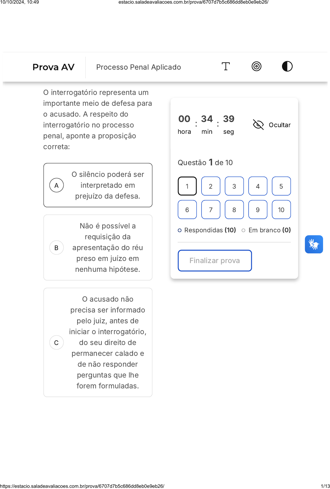 <p>A</p><p>B</p><p>C</p><p>1 Marcar para revisão</p><p>O interrogatório representa um</p><p>importante meio de defesa para</p><p>o acusado. A respeito do</p><p>interrogatório no processo</p><p>penal, aponte a proposição</p><p>correta:</p><p>O silêncio poderá ser</p><p>interpretado em</p><p>prejuízo da defesa.</p><p>Não é possível a</p><p>requisição da</p><p>apresentação do réu</p><p>preso em juízo em</p><p>nenhuma hipótese.</p><p>O acusado não</p><p>precisa ser informado</p><p>pelo juiz, antes de</p><p>iniciar o interrogatório,</p><p>do seu direito de</p><p>permanecer calado e</p><p>de não responder</p><p>perguntas que lhe</p><p>forem formuladas.</p><p>00</p><p>hora</p><p>: 34</p><p>min</p><p>: 39</p><p>seg</p><p>Ocultar</p><p>Questão 1 de 10</p><p>Respondidas �10� Em branco �0�</p><p>Finalizar prova</p><p>1 2 3 4 5</p><p>6 7 8 9 10</p><p>Prova AV Processo Penal Aplicado</p><p>10/10/2024, 10:49 estacio.saladeavaliacoes.com.br/prova/6707d7b5c686dd8eb0e9eb26/</p><p>https://estacio.saladeavaliacoes.com.br/prova/6707d7b5c686dd8eb0e9eb26/ 1/13</p><p>D</p><p>E</p><p>O silêncio importará</p><p>em confissão.</p><p>Em qualquer</p><p>modalidade de</p><p>interrogatório, o juiz</p><p>garantirá ao réu o</p><p>direito de entrevista</p><p>prévia e reservada</p><p>com o seu defensor;</p><p>se realizado por</p><p>videoconferência, fica</p><p>também garantido o</p><p>acesso a canais</p><p>telefônicos</p><p>reservados para</p><p>comunicação entre o</p><p>defensor que esteja</p><p>no presídio e o</p><p>advogado presente</p><p>na sala de audiência</p><p>do Fórum, e entre</p><p>este e o preso.</p><p>2 Marcar para revisão</p><p>A busca domiciliar deve ser</p><p>devidamente fundamentada e</p><p>depende de autorização</p><p>judicial, podendo objetivar</p><p>algumas situações. Sobre o</p><p>tema, analise os itens a seguir</p><p>e, em seguida, assinale a</p><p>alternativa que apresenta</p><p>corretamente situação(ões)</p><p>autorizativa(s) da busca</p><p>domiciliar.</p><p>I. Apreender coisas achadas ou</p><p>obtidas por meios criminosos.</p><p>10/10/2024, 10:49 estacio.saladeavaliacoes.com.br/prova/6707d7b5c686dd8eb0e9eb26/</p><p>https://estacio.saladeavaliacoes.com.br/prova/6707d7b5c686dd8eb0e9eb26/ 2/13</p><p>A</p><p>B</p><p>C</p><p>D</p><p>E</p><p>II. Apreender instrumentos de</p><p>falsificação ou de contrafação</p><p>e objetos falsificados ou</p><p>contrafeitos.</p><p>III. Apreender armas e</p><p>munições, instrumentos</p><p>utilizados na prática de crime</p><p>ou destinados a fim delituoso.</p><p>IV. apreender pessoas</p><p>testemunhas de crimes.</p><p>I e II</p><p>II e III</p><p>I e IV</p><p>II, III e IV</p><p>I, II e III</p><p>3 Marcar para revisão</p><p>�PC�CE � 2021 � IDECAN� O</p><p>Tribunal do Júri compreende</p><p>um procedimento especial em</p><p>relação ao procedimento</p><p>comum previsto pelo Código de</p><p>Processo Penal. Ao instituto do</p><p>júri penal é assegurado(a):</p><p>10/10/2024, 10:49 estacio.saladeavaliacoes.com.br/prova/6707d7b5c686dd8eb0e9eb26/</p><p>https://estacio.saladeavaliacoes.com.br/prova/6707d7b5c686dd8eb0e9eb26/ 3/13</p><p>A</p><p>B</p><p>C</p><p>D</p><p>E</p><p>A</p><p>B</p><p>C</p><p>a extensividade na</p><p>defesa.</p><p>o resguardo da</p><p>votação.</p><p>a autonomia dos</p><p>veredictos.</p><p>a competência para o</p><p>julgamento dos</p><p>crimes dolosos contra</p><p>a vida.</p><p>a irrecorribilidade dos</p><p>veredictos.</p><p>4 Marcar para revisão</p><p>�FCC/2007� Tício está</p><p>residindo na França, mas em</p><p>endereço desconhecido. Nesse</p><p>caso, a sua citação far-se-á</p><p>por:</p><p>por edital.</p><p>por carta precatória.</p><p>por carta rogatória.</p><p>10/10/2024, 10:49 estacio.saladeavaliacoes.com.br/prova/6707d7b5c686dd8eb0e9eb26/</p><p>https://estacio.saladeavaliacoes.com.br/prova/6707d7b5c686dd8eb0e9eb26/ 4/13</p><p>D</p><p>E</p><p>A</p><p>B</p><p>por carta com aviso</p><p>de recebimento.</p><p>por hora certa no</p><p>respectivo consulado.</p><p>5 Marcar para revisão</p><p>�PM�MT � 2021 � Banca</p><p>Própria) O artigo 76 da Lei nº</p><p>9.099/1995, ao dispor sobre a</p><p>fase preliminar ao oferecimento</p><p>da denúncia no Juizado</p><p>Especial Criminal, preceitua:</p><p>"Art. 76. Havendo</p><p>representação ou tratando-se</p><p>de crime de ação penal pública</p><p>incondicionada, não sendo</p><p>caso de arquivamento, o</p><p>Ministério Público poderá</p><p>propor a aplicação imediata de</p><p>pena restritiva de direitos ou</p><p>multas, a ser especificada na</p><p>proposta". Trata-se de hipótese</p><p>legal que autoriza a prevenção</p><p>ou extinção do conflito,</p><p>mediante o cumprimento de</p><p>uma pena consensualmente</p><p>ajustada ou pagamento de</p><p>multa, por meio de</p><p>perdão judicial.</p><p>contenda criminal.</p><p>10/10/2024, 10:49 estacio.saladeavaliacoes.com.br/prova/6707d7b5c686dd8eb0e9eb26/</p><p>https://estacio.saladeavaliacoes.com.br/prova/6707d7b5c686dd8eb0e9eb26/ 5/13</p><p>C</p><p>D</p><p>E</p><p>transação penal.</p><p>remissão penal.</p><p>remição da pena.</p><p>6 Marcar para revisão</p><p>�OAB/2018 - adaptada) Luiz foi</p><p>condenado, em primeira</p><p>instância, pela prática de crime</p><p>de homicídio qualificado em</p><p>razão de recurso que dificultou</p><p>a defesa da vítima. Durante seu</p><p>interrogatório em Plenário, Luiz</p><p>confessou a prática delitiva,</p><p>mas disse que não houve</p><p>recurso que dificultou a defesa</p><p>da vítima, tendo em vista que</p><p>ele estava discutindo com ela</p><p>quando da ação delitiva.</p><p>Insatisfeito com o</p><p>reconhecimento da</p><p>qualificadora pelos jurados, já</p><p>que, diferentemente do que</p><p>ocorreu em relação à autoria,</p><p>não haveria qualquer prova em</p><p>relação àquela, o advogado</p><p>apresentou, de imediato,</p><p>recurso de apelação.</p><p>Considerando apenas as</p><p>informações narrada