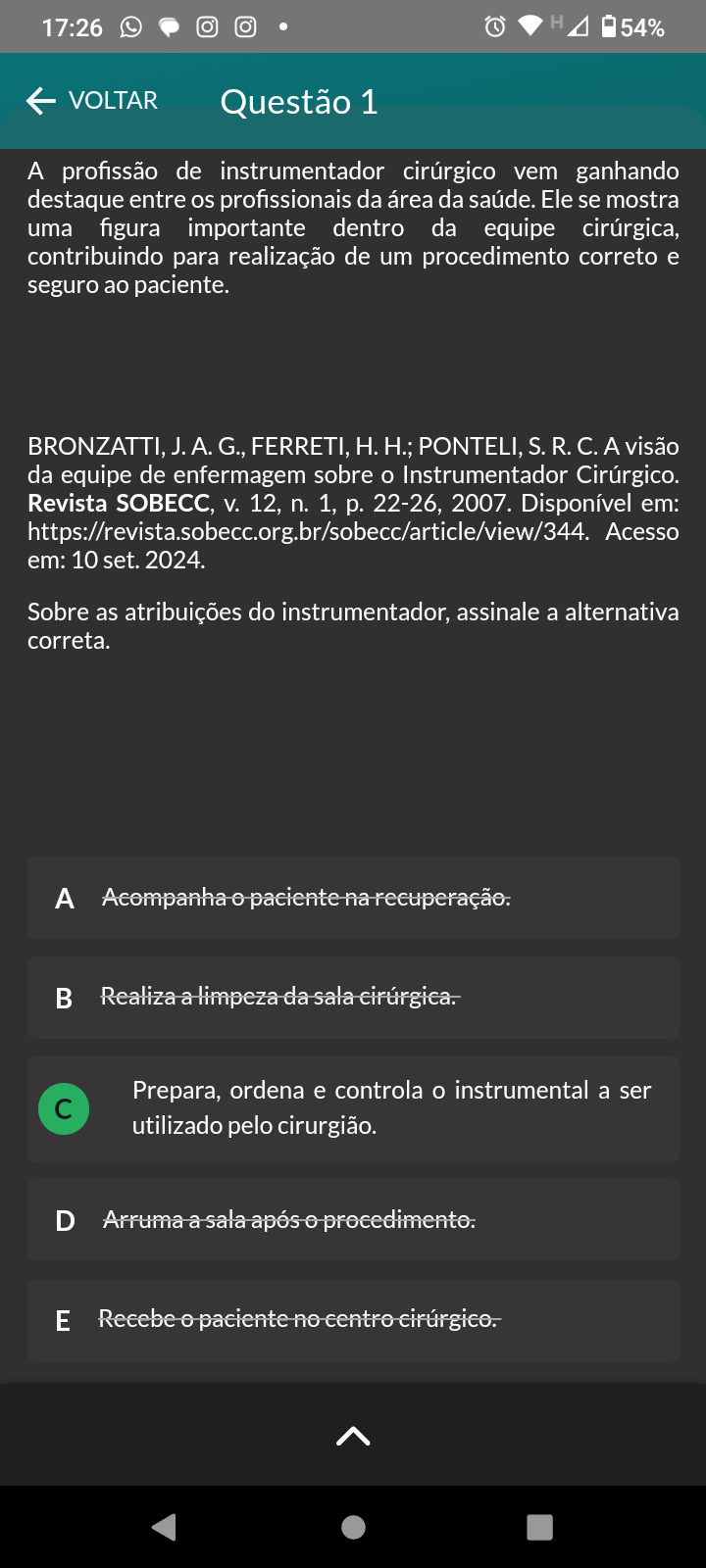 <p>17:26 H 54% VOLTAR Questão 1 A profissão de instrumentador cirúrgico vem ganhando destaque entre os profissionais da área da saúde. Ele se mostra uma figura importante dentro da equipe cirúrgica, contribuindo para realização de um procedimento correto e seguro ao paciente. BRONZATTI, J.A. G., FERRETI, H. H.; PONTELI, S. visão da equipe de enfermagem sobre Instrumentador Cirúrgico. Revista SOBECC, V. 12, n. 1, p. 22-26, 2007. Disponível em: https://revista.sobecc.org.br/sobecc/article/view/344.Acesso em: 10 set. 2024. Sobre as atribuições do instrumentador, assinale a alternativa correta. A Acompanha paciente na B Realiza a limpeza da sala cirúrgica. Prepara, ordena e controla instrumental a ser C utilizado pelo cirurgião. D Arruma a sala e procedimento. E Recebe e paciente centro cirúrgico.</p>