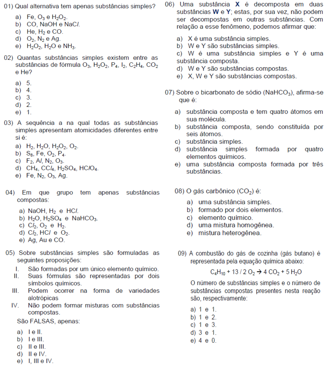 <p>Bateria de exercícios</p><p>10. Assinale a alternativa onde você encontra</p><p>somente substâncias compostas:</p><p>a) H2, P4, H2O, O2</p><p>b) Cl2, CO2, H2, H2O</p><p>c) CO2, H2O, H2, NaCl</p><p>d) H2O, H2, O2, H2SO4</p><p>e) CO2, H2O, H2SO4, NaCl</p><p>image1.png</p><p>image2.png</p><p>image3.png</p><p>image4.png</p><p>image5.png</p>