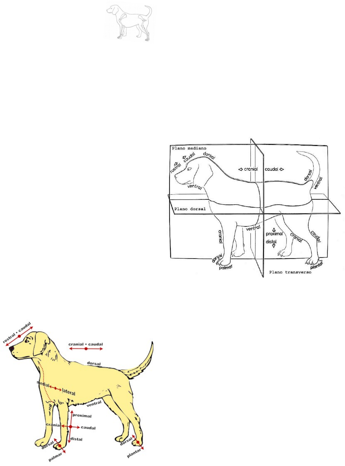 <p>Anatomia</p><p>Posição anatômica- o animal deve estar com os quatro membros estendidos firmemente sobre o solo, pescoço erguido formando um ângulo de 145° com o dorso, narinas voltadas para a frente, orelhas em pé e olhar para o horizonte. Em resumo, podemos dizer que o animal deve estar em posição de alerta.</p><p>Obs: a posição em que o animal não se encontra na posição anatômica, chama-se posição de decúbito.</p><p>PLANOS DE DELIMITAÇÃO</p><p>Linhas imaginárias que tangenciam o corpo do animal.</p><p>· Plano Ventral</p><p>· Plano Dorsal</p><p>· Plano Cranial</p><p>· Plano Caudal</p><p>· Plano Lateral (Direito e esquerdo)</p><p>EIXOS DE CONSTRUÇÃO</p><p>Linhas imaginárias que atravessam o centro do corpo.</p><p>· Eixo crâniocaudal – da cabeça até a calda (de lado)</p><p>· Eixo dorsoventral – do dorso até o ventre (em pé)</p><p>· Eixo laterolateral – de uma lateral a outra (de lado)</p><p>PLANOS DE CONSTRUÇÃO</p><p>Linhas imaginarias que dividem o corpo em duas metades.</p><p>· Plano sagital mediano- corta do dorso ao ventre, ou seja, separa em duas metades</p><p>· Plano sagital- corta do dorso ao ventre, não no meio do corpo do animal, mas sim direita e esquerda</p><p>· Plano dorsal- composto pelo eixo craniocaudal e laterolateral</p><p>· Plano transversal- divide a parte cranial da caudal. Composto pelo eixo dorsoventral e laterolateral</p><p>Além dos planos e eixos, temos também alguns termos de posição que auxiliam na localização de um órgão ou estrutura.</p><p>Rostral: Usado em substituição ao termo cranial para estruturas localizadas na cabeça</p><p>Superior e Inferior: Usado para lábios e pálpebras</p><p>Interno e Externo: Utilizado para designar cavidades ou órgãos ocos</p><p>Axial e Abaxial: Termo utilizados para ruminantes e suínos, cujo eixo funcional do membro passa entre o terceiro e o quarto dedo. A face do dedo voltada para o eixo é denominada Axial e a oposta é Abaxial</p><p>image4.gif</p><p>image1.jpeg</p><p>image2.png</p><p>image3.png</p>