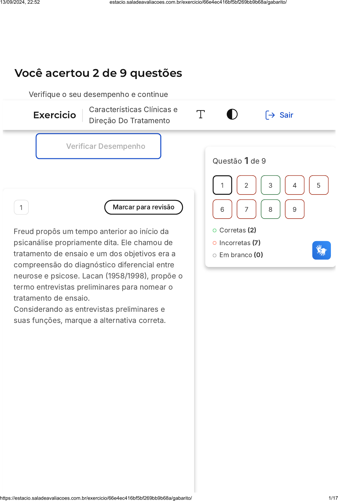 <p>Você acertou 2 de 9 questões</p><p>Verifique o seu desempenho e continue</p><p>treinando! Você pode refazer o exercício</p><p>quantas vezes quiser.</p><p>Verificar Desempenho</p><p>1 Marcar para revisão</p><p>Freud propôs um tempo anterior ao início da</p><p>psicanálise propriamente dita. Ele chamou de</p><p>tratamento de ensaio e um dos objetivos era a</p><p>compreensão do diagnóstico diferencial entre</p><p>neurose e psicose. Lacan �1958/1998�, propõe o</p><p>termo entrevistas preliminares para nomear o</p><p>tratamento de ensaio.</p><p>Considerando as entrevistas preliminares e</p><p>suas funções, marque a alternativa correta.</p><p>Questão 1 de 9</p><p>Corretas �2�</p><p>Incorretas �7�</p><p>Em branco �0�</p><p>1 2 3 4 5</p><p>6 7 8 9</p><p>Exercicio</p><p>Características Clínicas e</p><p>Direção Do Tratamento</p><p>Sair</p><p>13/09/2024, 22:52 estacio.saladeavaliacoes.com.br/exercicio/66e4ec416bf5bf269bb9b68a/gabarito/</p><p>https://estacio.saladeavaliacoes.com.br/exercicio/66e4ec416bf5bf269bb9b68a/gabarito/ 1/17</p><p>A</p><p>B</p><p>C</p><p>D</p><p>E</p><p>O termo proposto por Lacan indica um</p><p>trabalho psíquico também presente</p><p>nas entrevistas preliminares, trabalho</p><p>significante que visa um deslizamento</p><p>da queixa e a delimitação de uma</p><p>demanda analítica.</p><p>Nas entrevistas preliminares não há</p><p>elementos propriamente analíticos. No</p><p>que diz respeito à técnica, a posição</p><p>do analista deve ser mais ativa de</p><p>modo que favoreça a formulação da</p><p>demanda pelo paciente.</p><p>Segundo o termo proposto por Lacan</p><p>a passagem da queixa inicial à</p><p>demanda de análise é marcada por</p><p>trabalho de elaboração do paciente, e</p><p>por intervenções do analista cujo</p><p>objetivo é despertar o estado de</p><p>consciência daquele sobre seu</p><p>sintoma.</p><p>Há dois tempos que marcam as</p><p>entrevistas preliminares, um tempo de</p><p>compreender sobre a estrutura e um</p><p>tempo de concluir pela alta da análise.</p><p>No termo proposto por Lacan a</p><p>entrevista preliminar é marcada pela</p><p>suposição de saber dirigida ao analista</p><p>e pelo aumento das queixas que</p><p>denota uma angústia que precisa ser</p><p>contida.</p><p>13/09/2024, 22:52 estacio.saladeavaliacoes.com.br/exercicio/66e4ec416bf5bf269bb9b68a/gabarito/</p><p>https://estacio.saladeavaliacoes.com.br/exercicio/66e4ec416bf5bf269bb9b68a/gabarito/ 2/17</p><p>Resposta incorreta</p><p>Opa! A alternativa correta é a letra</p><p>A. Confira o gabarito comentado!</p><p>Gabarito Comentado</p><p>Lacan propõe o termo entrevistas</p><p>preliminares para retomar o tratamento de</p><p>ensaio em Freud. A escolha dessa</p><p>expressão demonstra um trabalho psíquico</p><p>já presente desde o início do tratamento.</p><p>Uma das funções desse trabalho a partir</p><p>do significante é levar o paciente a</p><p>formular uma demanda analítica</p><p>propriamente onde seu sintoma passa a ter</p><p>valor de enigma e o sujeito já se implica em</p><p>sua forma de mal-estar. Portanto, há</p><p>elementos de análise desde o início, sendo</p><p>a atenção flutuante e a associação livre as</p><p>regras fundamentais. O analista intervém,</p><p>mas sua posição não é ativa, de modo que</p><p>as intervenções são sempre calculadas e o</p><p>objetivo é estimular as associações. Não se</p><p>fala em estado de consciência em</p><p>psicanálise. Esse período inicial é marcado</p><p>por dois tempos, tempo de compreender o</p><p>diagnóstico e a demanda, e o tempo de</p><p>concluir no qual o analista decide se aceita</p><p>ou não o paciente em análise. Na entrada</p><p>em análise estão presentes a suposição de</p><p>saber ao analista e a delimitação de um</p><p>sintoma analisável.</p><p>2 Marcar para revisão</p><p>Em termos lacanianos podemos dizer que, na</p><p>perversão há uma inscrição da castração no</p><p>simbólico e em seguida uma recusa dela. Nesta</p><p>estrutura o que se nega é a diferença sexual. O</p><p>13/09/2024, 22:52 estacio.saladeavaliacoes.com.br/exercicio/66e4ec416bf5bf269bb9b68a/gabarito/</p><p>https://estacio.saladeavaliacoes.com.br/exercicio/66e4ec416bf5bf269bb9b68a/gabarito/ 3/17</p><p>A</p><p>B</p><p>C</p><p>D</p><p>E</p><p>perverso desloca a libido para uma outra coisa</p><p>- parte do corpo ou objeto. Ele torna essa parte</p><p>ou objeto como fálico fixando nele o encontro</p><p>com o prazer. Na perversão o mecanismo</p><p>defensivo utilizado é a denegação ou</p><p>renegação da castração. Marque a alternativa</p><p>que apresenta o sintoma característico nessa</p><p>estrutura.</p><p>Sintoma conversivo.</p><p>Pensamentos intrusivos e culpa.</p><p>Alucinações</p><p>Fetiche</p><p>Somatização</p><p>Resposta incorreta</p><p>Opa! A alternativa correta é a letra</p><p>D. Confira o gabarito comentado!</p><p>Gabarito Comentado</p><p>O sintoma conversivo é característico da</p><p>histeria clássica. Vemos pensamentos</p><p>intrusivos e culpa na neurose obsessiva. As</p><p>somatizações são estudados sem que se</p><p>liguem diretamente a uma das estruturas</p><p>clínicas, mas como fenômeno</p><p>psicossomático sem um sentido simbólico</p><p>que o sintoma histérico possui. As</p><p>alucinações são tipos de fenômenos</p><p>elementares da psicose. O fetiche é o</p><p>sintoma típico da perversa, implica em</p><p>tomar um objeto ou situação como sexual.</p><p>13/09/2024, 22:52 estacio.saladeavaliacoes.com.br/exercicio/66e4ec416bf5bf269bb9b68a/gabarito/</p><p>https://estacio.saladeavaliacoes.com.br/exercicio/66e4ec416bf5bf269bb9b68a/gabarito/ 4/17</p><p>A</p><p>B</p><p>C</p><p>D</p><p>E</p><p>O alvo não é o encontro sexual em si, mas</p><p>esse objeto de valor fálico.</p><p>3 Marcar para revisão</p><p>Na paranoia há um rompimento com um</p><p>fragmento da realidade. Nela o sujeito opera</p><p>uma defesa bem eficaz porque o conteúdo</p><p>con