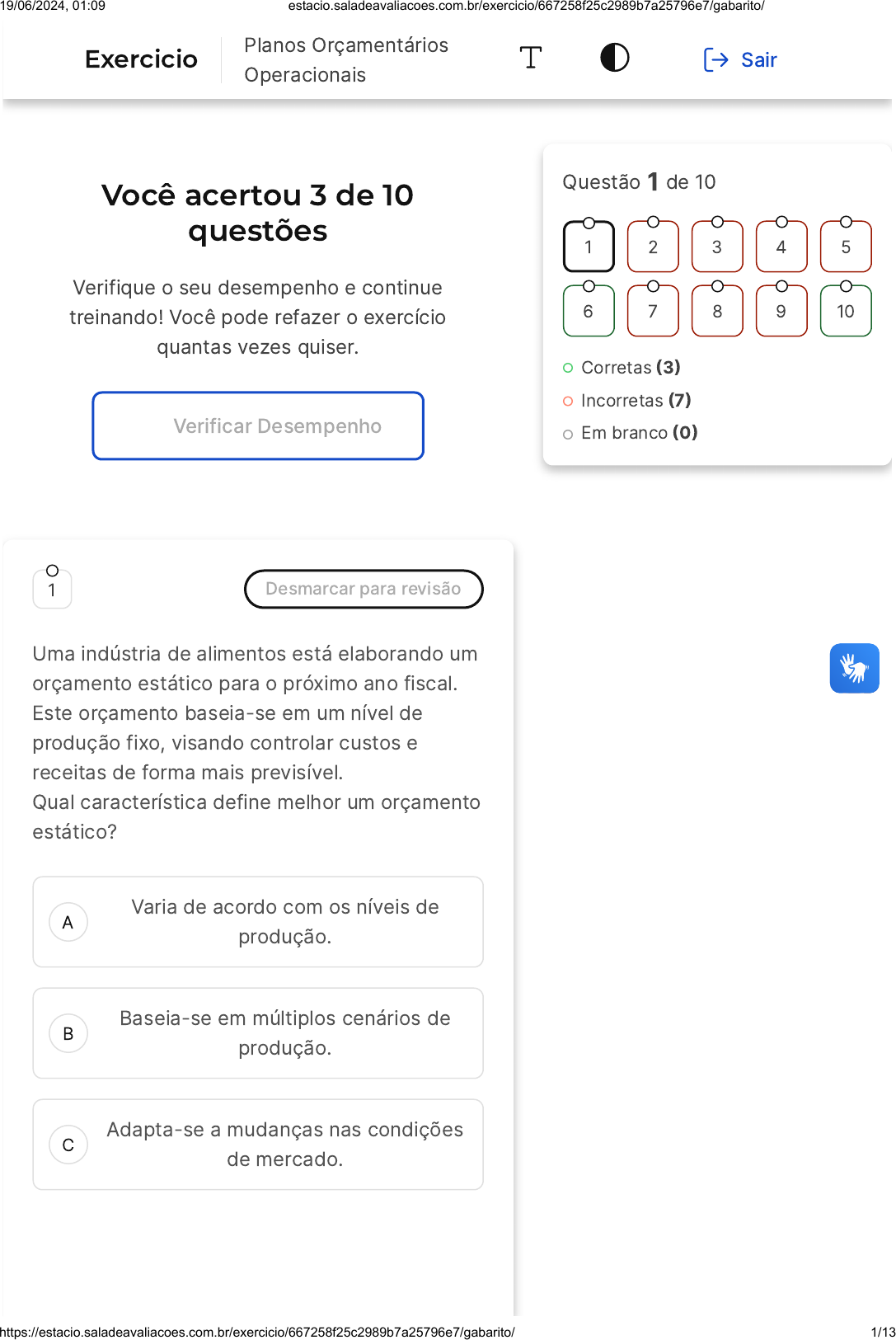 <p>Você acertou 3 de 10</p><p>questões</p><p>Verifique o seu desempenho e continue</p><p>treinando! Você pode refazer o exercício</p><p>quantas vezes quiser.</p><p>Verificar Desempenho</p><p>A</p><p>B</p><p>C</p><p>1 Desmarcar para revisão</p><p>Uma indústria de alimentos está elaborando um</p><p>orçamento estático para o próximo ano fiscal.</p><p>Este orçamento baseia-se em um nível de</p><p>produção fixo, visando controlar custos e</p><p>receitas de forma mais previsível.</p><p>Qual característica define melhor um orçamento</p><p>estático?</p><p>Varia de acordo com os níveis de</p><p>produção.</p><p>Baseia-se em múltiplos cenários de</p><p>produção.</p><p>Adapta-se a mudanças nas condições</p><p>de mercado.</p><p>Questão 1 de 10</p><p>Corretas �3�</p><p>Incorretas �7�</p><p>Em branco �0�</p><p>1 2 3 4 5</p><p>6 7 8 9 10</p><p>Exercicio</p><p>Planos Orçamentários</p><p>Operacionais</p><p>Sair</p><p>19/06/2024, 01:09 estacio.saladeavaliacoes.com.br/exercicio/667258f25c2989b7a25796e7/gabarito/</p><p>https://estacio.saladeavaliacoes.com.br/exercicio/667258f25c2989b7a25796e7/gabarito/ 1/13</p><p>D</p><p>E</p><p>Baseia-se em um nível fixo de</p><p>produção.</p><p>É revisado mensalmente para maior</p><p>precisão.</p><p>Resposta correta</p><p>Parabéns, você selecionou a</p><p>alternativa correta. Confira o</p><p>gabarito comentado!</p><p>Gabarito Comentado</p><p>O orçamento estático é ideal para</p><p>empresas que buscam maior</p><p>previsibilidade, pois é baseado em um nível</p><p>de produção fixo. Isso ajuda na gestão de</p><p>custos e receitas, facilitando o controle</p><p>financeiro.</p><p>2 Desmarcar para revisão</p><p>A empresa XYZ Ltda. fabrica e vende um</p><p>shampoo. A embalagem do produto é adquirida</p><p>ao preço de R$ 2.00 cada e diariamente são</p><p>utilizadas 2.500 unidades, sendo que a empresa</p><p>opera 300 dias por ano fabricando o produto. O</p><p>fornecedor da embalagem faz a entrega ao</p><p>custo R$ 864. O custo de manutenção dos</p><p>estoques foi calculado em R$ 250 para 2.500</p><p>embalagens, ou seja, 0,10 por unidade. A</p><p>empresa espera ter um retorno de 13% sobre o</p><p>investimento feito em estoque, o que adiciona</p><p>R$ 0,26 a cada unidade estocada. A empresa</p><p>quer saber que quantidade deve ser</p><p>19/06/2024, 01:09 estacio.saladeavaliacoes.com.br/exercicio/667258f25c2989b7a25796e7/gabarito/</p><p>https://estacio.saladeavaliacoes.com.br/exercicio/667258f25c2989b7a25796e7/gabarito/ 2/13</p><p>A</p><p>B</p><p>C</p><p>D</p><p>E</p><p>encomendada a cada pedido para que os</p><p>custos sejam os menores possíveis.</p><p>30.000 unidades.</p><p>35.000 unidades.</p><p>50.000 unidades.</p><p>55.000 unidades.</p><p>60.000 unidades.</p><p>Resposta incorreta</p><p>Opa! A alternativa correta é a letra</p><p>E. Confira o gabarito comentado!</p><p>Gabarito Comentado</p><p>3 Desmarcar para revisão</p><p>Uma empresa de construção civil está</p><p>adotando um orçamento contínuo para</p><p>melhorar seu planejamento financeiro. Essa</p><p>abordagem envolve atualizar o orçamento</p><p>regularmente, considerando as mudanças e</p><p>tendências recentes do mercado.</p><p>19/06/2024, 01:09 estacio.saladeavaliacoes.com.br/exercicio/667258f25c2989b7a25796e7/gabarito/</p><p>https://estacio.saladeavaliacoes.com.br/exercicio/667258f25c2989b7a25796e7/gabarito/ 3/13</p><p>A</p><p>B</p><p>C</p><p>D</p><p>E</p><p>Qual é a principal característica de um</p><p>orçamento contínuo?</p><p>Mantém o orçamento fixo por um ano.</p><p>Atualiza o orçamento regularmente.</p><p>Planeja apenas para o curto prazo.</p><p>Ignora as mudanças de mercado.</p><p>Foca exclusivamente em custos fixos.</p><p>Resposta incorreta</p><p>Opa! A alternativa correta é a letra</p><p>B. Confira o gabarito comentado!</p><p>Gabarito Comentado</p><p>O orçamento contínuo é vantajoso para</p><p>empresas em mercados dinâmicos, pois</p><p>permite a atualização regular do</p><p>orçamento, adequando-se às novas</p><p>condições e tendências do mercado.</p><p>4 Desmarcar para revisão</p><p>Um sistema produtivo é definido como um</p><p>conjunto de elementos, pessoas, máquinas e</p><p>processos responsáveis por produzir um</p><p>produto ou serviço. Qual tipo de produção é</p><p>utilizada quando o custo de substituição de</p><p>equipamentos e/ou de ajustes da configuração</p><p>19/06/2024, 01:09 estacio.saladeavaliacoes.com.br/exercicio/667258f25c2989b7a25796e7/gabarito/</p><p>https://estacio.saladeavaliacoes.com.br/exercicio/667258f25c2989b7a25796e7/gabarito/ 4/13</p><p>A</p><p>B</p><p>C</p><p>D</p><p>E</p><p>da planta produtiva para início da produção é</p><p>muito elevado?</p><p>Produção ao nível de vendas.</p><p>Produção constante.</p><p>Produção por ciclos.</p><p>Produção alternada.</p><p>Produção terceirizada.</p><p>Resposta incorreta</p><p>Opa! A alternativa correta é a letra</p><p>C. Confira o gabarito comentado!</p><p>Gabarito Comentado</p><p>Quando o custo de substituição de</p><p>equipamentos ou de ajustes da</p><p>configuração (setup) da planta produtiva</p><p>para início da produção se torna proibitivo,</p><p>adota-se a produção por ciclos. Este</p><p>método consiste basicamente em fabricar</p><p>ininterruptamente a quantidade necessária</p><p>para atender as vendas durante um</p><p>período considerável e, depois, parar e</p><p>passar a fabricar outro produto. Embora</p><p>esse método reduza os gastos com</p><p>substituição de equipamentos, ele aumenta</p><p>os custos de estocagem, o risco de</p><p>obsolescência e requer um maior volume</p><p>de recursos financeiros para investir em</p><p>estoque.</p><p>19/06/2024, 01:09 estacio.saladeavaliacoes.com.br/exercicio/667258f25c2989b7a25796e7/gabarito/</p><p>https://estacio.saladeavaliacoes.com.br/exercicio/667258f25c2989b7a25796e7/gabarito/ 5/13</p><p>A</p><p>B</p><p>C</p><p>D</p><p>E</p><p>5 Desmarcar para revisão</p><p>Uma fábric
