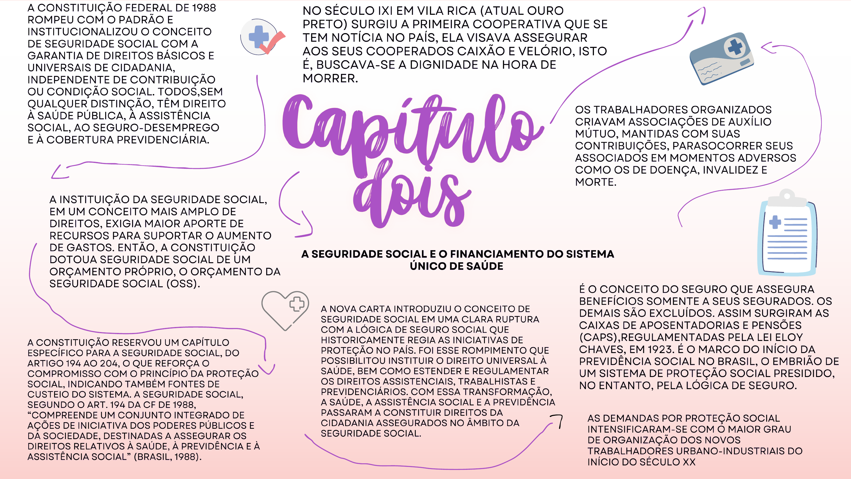 <p>A CONSTITUIÇÃO FEDERAL DE 1988 NO SÉCULO IXI EM VILA RICA (ATUAL OURO ROMPEU COM PADRÃO E PRETO) SURGIU A PRIMEIRA COOPERATIVA QUE SE INSTITUCIONALIZOU O CONCEITO TEM NOTÍCIA NO PAÍS, ELA VISAVA ASSEGURAR DE SEGURIDADE SOCIAL COM A GARANTIA DE DIREITOS BÁSICOS E AOS SEUS COOPERADOS CAIXÃO E VELÓRIO, ISTO UNIVERSAIS DE CIDADANIA, É, BUSCAVA-SE A DIGNIDADE NA HORA DE INDEPENDENTE DE CONTRIBUIÇÃO MORRER. CONDIÇÃO SOCIAL. TODOS,SEM QUALQUER DISTINÇÃO, TÊM DIREITO À SAÚDE PÚBLICA, ASSISTÊNCIA E À COBERTURA Capitulo os TRABALHADORES ORGANIZADOS CRIAVAM ASSOCIAÇÕES DE AUXÍLIO SOCIAL, AO SEGURO-DESEMPREGO MÚTUO, MANTIDAS COM SUAS CONTRIBUIÇÕES, PARASOCORRER SEUS ASSOCIADOS EM MOMENTOS ADVERSOS COMO os DE DOENÇA, INVALIDEZ E EM UM CONCEITO MAIS AMPLO DE MORTE. A INSTITUIÇÃO DA SEGURIDADE SOCIAL, DIREITOS, EXIGIA MAIOR APORTE DE RECURSOS PARA SUPORTAR AUMENTO DE GASTOS. ENTÃO, A CONSTITUIÇÃO A SEGURIDADE SOCIAL E FINANCIAMENTO DO SISTEMA DOTOUA SEGURIDADE SOCIAL DE UM ÚNICO DE SAÚDE ORÇAMENTO PRÓPRIO, ORÇAMENTO DA SEGURIDADE SOCIAL (OSS). É CONCEITO DO SEGURO QUE ASSEGURA BENEFÍCIOS SOMENTE A SEUS SEGURADOS. os A NOVA CARTA INTRODUZIU CONCEITO DE DEMAIS SÃO EXCLUÍDOS. ASSIM SURGIRAM AS SEGURIDADE SOCIAL EM UMA CLARA RUPTURA COM A LÓGICA DE SEGURO SOCIAL QUE CAIXAS DE APOSENTADORIAS E PENSÕES A CONSTITUIÇÃO RESERVOU UM CAPÍTULO HISTORICAMENTE REGIA AS INICIATIVAS DE (CAPS), PELA LEI ELOY ESPECÍFICO PARA A SEGURIDADE SOCIAL, DO PROTEÇÃO NO PAÍS. FOI ESSE ROMPIMENTO QUE CHAVES, EM 1923. É MARCO DO INÍCIO DA ARTIGO 194 AO 204, O QUE REFORÇA POSSIBILITOU INSTITUIR DIREITO UNIVERSAL À PREVIDÊNCIA SOCIAL NO BRASIL, DE COMPROMISSO COM PRINCÍPIO DA PROTEÇÃO SAÚDE, BEM COMO ESTENDER E REGULAMENTAR UM SISTEMA DE PROTEÇÃO SOCIAL PRESIDIDO, SOCIAL, INDICANDO TAMBÉM FONTES DE os DIREITOS ASSISTENCIAIS, TRABALHISTAS E NO ENTANTO, PELA LÓGICA DE SEGURO. CUSTEIO DO SISTEMA. A SEGURIDADE SOCIAL, COM ESSA TRANSFORMAÇÃO, SEGUNDO ART. 194 DA CF DE 1988, A SAÚDE, A ASSISTÊNCIA SOCIAL E A PREVIDÊNCIA "COMPREENDE UM CONJUNTO INTEGRADO DE PASSARAM A CONSTITUIR DIREITOS DA CIDADANIA ASSEGURADOS NO ÂMBITO DA AS DEMANDAS POR PROTEÇÃO SOCIAL AÇÕES DE INICIATIVA DOS PODERES PÚBLICOS E DA SOCIEDADE, DESTINADAS A ASSEGURAR os SEGURIDADE SOCIAL. INTENSIFICARAM-SE COM MAIOR GRAU DIREITOS RELATIVOS À SAÚDE, À PREVIDÊNCIA E À DE ORGANIZAÇÃO DOS NOVOS TRABALHADORES URBANO-INDUSTRIAIS DO ASSISTÊNCIA SOCIAL" (BRASIL, 1988). INÍCIO DO SÉCULO XX</p><p>A SÉTIMA DIRETRIZ APRESENTA ALGUMAS AÇÕES E SERVIÇOS PÚBLICOS QUE, EMBORA FINANCIAMENTO DA SAÚDE RELACIONADOS COM A PROTEÇÃO À SAÚDE, ANTES DA CONSTITUIÇÃO DE 1988: NÃO DEVEM TER SEUS GASTOS CONSIDERADOS SAÚDE PASSOU A SER UM DIREITO DE TODOS PARA FINS DE CUMPRIMENTO DOS TERMOS DA E DEVER DO ESTADO. EC N° 29/2000. CRIAÇÃO DO SISTEMA ÚNICO DE SAÚDE (SUS) PARA GARANTIR ACESSO UNIVERSAL E IGUALITÁRIO. Capitulo DEBATE INTENSO NA ASSEMBLEIA CONSTITUINTE SOBRE MODELOS DE A SAÚDE COMPETIA COM PREVIDÊNCIA E SISTEMA DE ASSISTÊNCIA SOCIAL PELAS RECEITAS DO INCLUSÃO DO SUS COMO PARTE DA SISTEMA NACIONAL DE PREVIDÊNCIA E SEGURIDADE SOCIAL NO CAPÍTULO DA ASSISTÊNCIA SOCIAL. CONSTITUIÇÃO. os RECURSOS ERAM DISPUTADOS POR EDUCAÇÃO, JUSTIÇA E OUTRAS ÁREAS. CONSTITUIÇÃO FEDERAL DE 1988 E CRIAÇÃO DO SUS: LEIS INFRACONSTITUCIONAIS E A PARTICIPAÇÃO DA COMUNIDADE: HISTÓRIA DO FINANCIAMENTO DAS AÇÕES E SERVIÇOS PÚBLICOS DE SAÚDE 12 ANOS DE INTENSO DEBATE ENTRE A PROMULGAÇÃO DA CONSTITUIÇÃO E A EMENDA CONSTITUCIONAL N° 29/2000 A LEI ORGÂNICA DA SAÚDE DEFINIU A SUS VIVEU E SEU PERÍODO DE PARTICIPAÇÃO DA COMUNIDADE NA GESTÃO E UNIÃO: DEVE APLICAR, ANUALMENTE, UM VALOR EQUIVALENTE A, NO MÍNIMO, 15% DA CONTROLE DO SUS. INCERTEZAS: PARTICIPAÇÃO POPULAR GARANTIDA POR RECEITA CORRENTE LÍQUIDA. ESTADOS: DEVEM DESTINAR UM PERCENTUAL MEIO DE CONFERÊNCIAS DE SAÚDE E MÍNIMO DE 12% DA RECEITA CORRENTE CONSELHOS DE MUNICÍPIOS: A OBRIGATORIEDADE É DE 15% DA SEM FONTES ESTÁVEIS DE FINANCIAMENTO, RECEITA CORRENTE LÍQUIDA. AGRAVADAS PELA PROFUNDA CRISE A EMENDA CONSTITUCIONAL N° 29 QUE DEFINIU ECONÔMICA DO PAÍS, QUE SE DEBATIA COM COM CLAREZA A FORMA DE FINANCIAMENTO DO ALTOS ÍNDICES DE INFAÇÃO E BAIXA TAXA DE SISTEMA: CRESCIMENTO.</p>