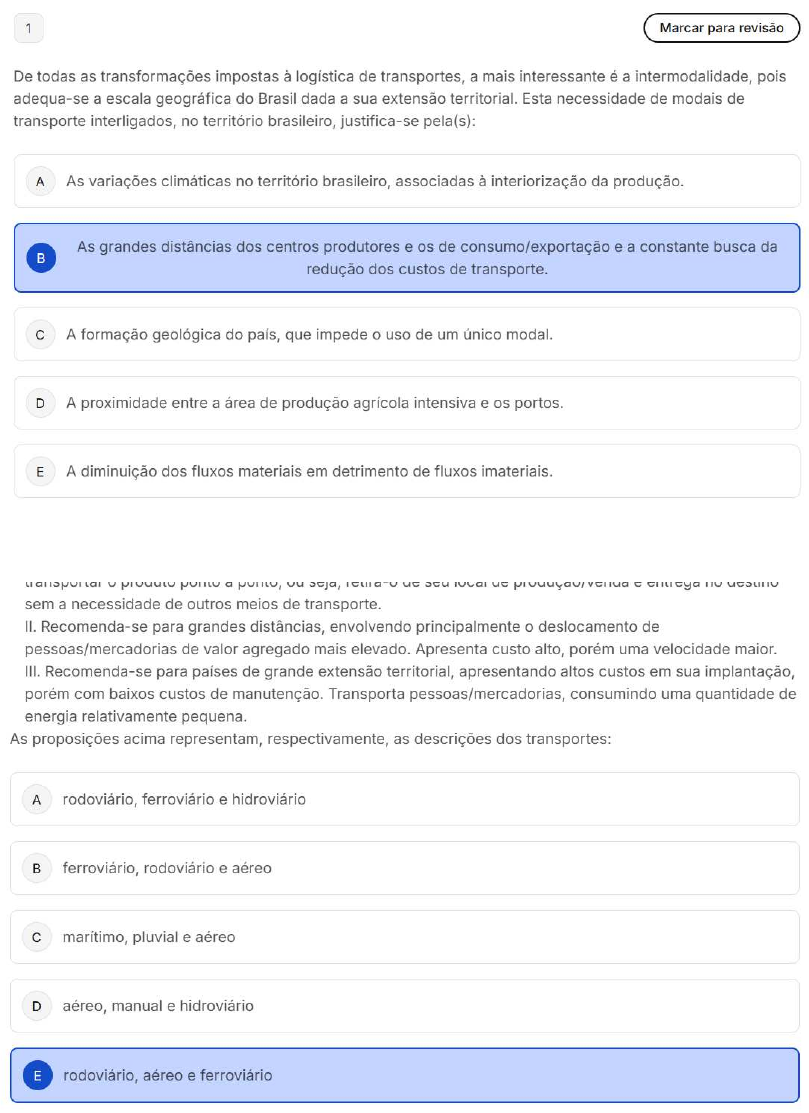 <p>1 Marcar para revisão De todas as transformações impostas à logística de transportes, a mais interessante é a intermodalidade, pois adequa-se a escala geográfica do Brasil dada a sua extensão territorial. Esta necessidade de modais de transporte interligados, no território brasileiro, justifica-se pela(s): A As variações climáticas no território brasileiro, associadas à da produção. As grandes distâncias dos centros produtores e os de consumo/exportação e a constante busca da B redução dos custos de transporte. C A formação geológica do país, que impede o uso de um único modal. D A proximidade entre a área de produção agrícola intensiva e os portos. E A diminuição dos fluxos materiais em detrimento de fluxos imateriais. a sem a necessidade de outros meios de transporte. II. Recomenda-se para grandes distâncias, envolvendo principalmente o deslocamento de pessoas/mercadorias de valor agregado mais elevado. Apresenta custo alto, porém uma velocidade maior. III. Recomenda-se para países de grande extensão territorial, apresentando altos custos em sua implantação, porém com baixos custos de manutenção. Transporta pessoas/mercadorias, consumindo uma quantidade de energia relativamente pequena. As proposições acima representam, respectivamente, as descrições dos transportes: A rodoviário, ferroviário e hidroviário B ferroviário, rodoviário e aéreo C marítimo, pluvial e aéreo D aéreo, manual e hidroviário E rodoviário, aéreo e ferroviário</p><p>quantidades de carga, e sempre que possível, o frete marítimo tem menor custo de envio, mas também é o mais demorado. frete rodoviário e o frete ferroviário estão em algum lugar no meio. o transporte rodoviário é o meio de transporte mais utilizado para pequenas e médias distâncias, mas para o transporte de longa distância há vários benefícios para o frete ferroviário. Com base no exposto, marque a alternativa que apresenta o tipo de transporte mais flexível. A Rodoviário. B C D Aéreo. E Fluvial. 4 revisao Um desafio latente dos grandes centros urbanos é o de tentar diminuir tempo de deslocamento entre dois pontos distintos da cidade. Marque a alternativa que apresenta uma das causas dos problemas de mobilidade urbana nas cidades: A Redução do preço dos bilhetes de transporte público. B Processo migratório presente nas grandes regiões metropolitanas. C Incentivar a utilização de meios de transporte arcaicos, como a bicicleta. D Crescimento do número de veículos individuais presentes nas cidades. E Proposição de políticas sociais que garanta passagens baratas.</p><p>5 Marcar para revisão (CESGRANRIO/2015 - Adaptada) Para alguns autores, responsabilidade social pode ser definida como aquela de quem é chamado a responder por seus atos diante da sociedade, da opinião quando esses atos assumem consequências sociais. As organizações vêm, ao longo do tempo, recebendo críticas e questionamentos que colocam o assunto em evidência, indicando que: A público aumentou a exigência por uma postura mais engajada das empresas. B negócio institucional alcançou um patamar de baixa complexidade. C A empresa bem-sucedida gerencia seu negócio de maneira massificada. D A equação empresarial atual envolve afastamento parcial do meio social. E As diferenças sociais entre países permitiram um pensamento corporativo mundial. Observe as afirmativas a seguir: I. o transporte intermodal é uma combinação de pelo menos dois ou mais modais de transporte. II. o transporte de massa é mais caro do que o transporte de mercadorias em pequenas quantidades. III. o custo relacionado à viagem e os custos relacionados à quantidade permanecem os mesmos com todas as transportadoras. É correto o que se afirma em: A I e apenas B e III apenas C e III apenas D I apenas E II apenas</p><p>7 Marcar para revisão Uma comunidade é uma unidade social (um grupo de seres vivos) com semelhanças como lugar, normas, religião, valores, costumes ou As comunidades podem compartilhar um senso de lugar situado em uma determinada área geográfica (por exemplo, um país, vila, cidade ou bairro) ou no espaço virtual por meio de plataformas de comunicação. Relações duráveis que se estendem além dos laços genealógicos imediatos também definem um senso de comunidade, importante para sua identidade, prática e papéis em instituições sociais como família, lar, trabalho, governo, sociedade ou humanidade em geral. Qual dos seguintes não é identificado como uma nova forma de comunidade? A Comunidades étnicas, baseadas na identidade compartilhada e experiências de discriminação. B Vilas alternativas, que se formam em certas partes das grandes cidades. C Comunidades sociológicas, formadas por professores impopulares. D Comunidades virtuais que existem apenas no ciberespaço. E A forma como as comunidades se formam para garantir seus direitos. 8 Marcar para revisão A mobilidade urbana é um problema que atinge hoje as grandes cidades do Brasil e do mundo. Por isso, em diversas cidades, existem iniciativas que buscam oferecer soluções para esse problema. sistema alternativo que atende às demandas ambientais e econômicas de mobilidade urbana é: A Compartilhamento de bicicletas e patinetes. B Sistema de compartilhamento de táxis. C Sistema de trem metropolitano movido a eletricidade. D Transporte automotivo por aplicativo. E Transporte através de bondes.</p><p>9 Marcar para revisão É uma articulação particular ou simplesmente arranjo de espaços adaptados ou diferentes tipos de usos do solo ou terrenos em diferentes usos que possam existir em uma área urbana. A Área urbana B Forma urbana C Estrutura urbana D Aglomeração urbana E Complexo urbano 10 Marcar para revisão Geografia urbana é o estudo geográfico das cidades e tem duas partes principais. A primeira estuda por que as cidades são construídas onde estão, como estão conectadas e como as pessoas e as coisas se movem 