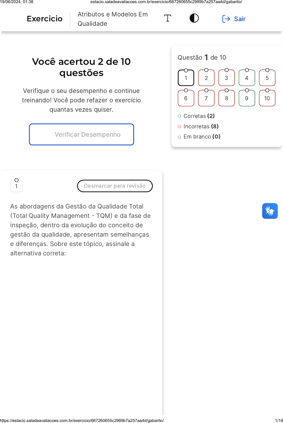 <p>Você acertou 2 de 10</p><p>questões</p><p>Verifique o seu desempenho e continue</p><p>treinando! Você pode refazer o exercício</p><p>quantas vezes quiser.</p><p>Verificar Desempenho</p><p>1 Desmarcar para revisão</p><p>As abordagens da Gestão da Qualidade Total</p><p>�Total Quality Management � TQM� e da fase de</p><p>inspeção, dentro da evolução do conceito de</p><p>gestão da qualidade, apresentam semelhanças</p><p>e diferenças. Sobre este tópico, assinale a</p><p>alternativa correta:</p><p>Questão 1 de 10</p><p>Corretas �2�</p><p>Incorretas �8�</p><p>Em branco �0�</p><p>1 2 3 4 5</p><p>6 7 8 9 10</p><p>Exercicio</p><p>Atributos e Modelos Em</p><p>Qualidade</p><p>Sair</p><p>19/06/2024, 01:38 estacio.saladeavaliacoes.com.br/exercicio/667260655c2989b7a257aa4d/gabarito/</p><p>https://estacio.saladeavaliacoes.com.br/exercicio/667260655c2989b7a257aa4d/gabarito/ 1/19</p><p>A</p><p>B</p><p>C</p><p>D</p><p>E</p><p>A TQM é focada na consistência da</p><p>produção de produtos/serviços por</p><p>meio de um sistema que pode ser</p><p>auditado e certificado. A fase de</p><p>inspeção não permitia auditoria nos</p><p>processos.</p><p>A fase de inspeção e a TQM</p><p>promovem a qualidade na</p><p>organização, cada uma com seu foco,</p><p>mas a TQM entende que devemos</p><p>eleger um departamento específico</p><p>que é integralmente responsável pela</p><p>qualidade na organização, isentando</p><p>os demais colaboradores deste</p><p>processo.</p><p>A TQM tem foco mais acentuado no</p><p>compromisso da gestão, na mudança</p><p>cultural, no treinamento e educação</p><p>do empregado e no atendimento dos</p><p>requisitos dos clientes.</p><p>A inspeção tem foco mais acentuado</p><p>na gestão por processos e na</p><p>satisfação dos clientes.</p><p>Ambas são consideradas estratégias</p><p>de evolução da empresa. Contudo, a</p><p>inspeção pode proporcionar melhores</p><p>resultados na satisfação dos clientes e</p><p>do mercado em geral.</p><p>Resposta incorreta</p><p>Opa! A alternativa correta é a letra</p><p>C. Confira o gabarito comentado!</p><p>19/06/2024, 01:38 estacio.saladeavaliacoes.com.br/exercicio/667260655c2989b7a257aa4d/gabarito/</p><p>https://estacio.saladeavaliacoes.com.br/exercicio/667260655c2989b7a257aa4d/gabarito/ 2/19</p><p>A</p><p>B</p><p>Gabarito Comentado</p><p>A TQM tem foco mais acentuado no</p><p>compromisso da gestão, na mudança</p><p>cultural, no treinamento e educação do</p><p>empregado e no atendimento dos</p><p>requisitos dos clientes. A fase de inspeção</p><p>tem foco mais acentuado na gestão por</p><p>processos e na satisfação dos clientes.</p><p>2 Desmarcar para revisão</p><p>O SEIS SIGMA é uma estratégia gerencial</p><p>disciplinada e altamente quantitativa,</p><p>caracterizada por uma abordagem sistêmica,</p><p>que tem como objetivo aumentar drasticamente</p><p>a lucratividade das empresas, por meio da</p><p>otimização de produtos e processos, com o</p><p>consequente incremento da satisfação de</p><p>clientes e consumidores. Assim, pode-se dizer</p><p>que a sua aplicação é:</p><p>Uma maneira sistemática de</p><p>desmembrar as atividades da</p><p>empresa, reduzir os preços e a</p><p>invariabilidade dos processos, através</p><p>de uma metodologia focada na</p><p>redução estatística e na auditoria da</p><p>eficiência e eficácia.</p><p>Uma maneira sistemática de reduzir as</p><p>atividades da empresa, reduzir os</p><p>preços e a variabilidade dos produtos,</p><p>através de uma metodologia focada no</p><p>cliente externo e na melhoria da</p><p>efetividade e produtividade.</p><p>19/06/2024, 01:38 estacio.saladeavaliacoes.com.br/exercicio/667260655c2989b7a257aa4d/gabarito/</p><p>https://estacio.saladeavaliacoes.com.br/exercicio/667260655c2989b7a257aa4d/gabarito/ 3/19</p><p>C</p><p>D</p><p>E</p><p>Uma maneira sistemática de</p><p>administrar as atividades da empresa,</p><p>reduzir os custos e a variabilidade dos</p><p>processos, através de uma</p><p>metodologia focada na medição</p><p>estatística e na melhoria da eficiência</p><p>e eficácia.</p><p>Uma maneira flexível de administrar as</p><p>atividades da empresa, reduzir a mão</p><p>de obra e a variabilidade dos</p><p>produtos, através de uma metodologia</p><p>focada na medição do cliente e na</p><p>redução calculada da eficiência e</p><p>eficácia.</p><p>Uma maneira de reduzir as atividades</p><p>da empresa, reduzir a mão de obra e a</p><p>variedade de produtos, através de</p><p>uma metodologia focada na medição</p><p>do cliente e na redução proporcional</p><p>da eficiência e eficácia.</p><p>Resposta incorreta</p><p>Opa! A alternativa correta é a letra</p><p>C. Confira o gabarito comentado!</p><p>Gabarito Comentado</p><p>A metodologia Seis Sigma é uma estratégia</p><p>gerencial que visa administrar as atividades</p><p>da empresa de maneira sistemática, com</p><p>foco na redução de custos e na</p><p>variabilidade dos processos. Através de</p><p>uma abordagem altamente quantitativa, a</p><p>metodologia utiliza medições estatísticas</p><p>para melhorar a eficiência e eficácia dos</p><p>processos.</p><p>19/06/2024, 01:38 estacio.saladeavaliacoes.com.br/exercicio/667260655c2989b7a257aa4d/gabarito/</p><p>https://estacio.saladeavaliacoes.com.br/exercicio/667260655c2989b7a257aa4d/gabarito/ 4/19</p><p>A</p><p>B</p><p>C</p><p>D</p><p>E</p><p>3 Desmarcar para revisão</p><p>O modelo 6 Sigma foi desenvolvida pela</p><p>Motorola e ganhou bastante destaque. O índice</p><p>6 Sigma admite quantos defeitos por milhão em</p><p>um processo?</p><p>233</p><p>3,4</p><p>0</p><p>6.210</p><p>6</p><p>Resposta incorreta</p><p>Opa! A alternativa correta é a letra</p><p>B. Confira o gabarito comentado!</p><p>Gabarito Comentado</p><p>Milhares de empresas espalhadas ao redor</p><p>do globo utilizam a metodologia Seis</p><p>Sigma, que significa reduzir os defeitos a</p><p>3,4 peças por milhão. Em números</p><p>absolutos, é o 