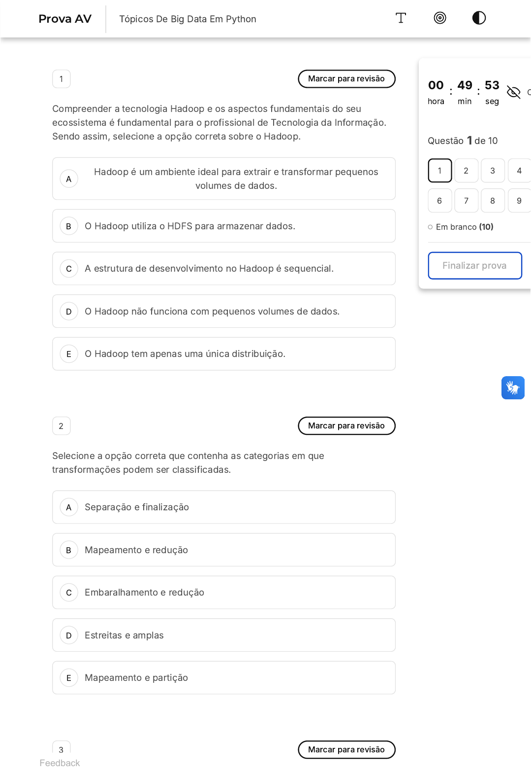 <p>A</p><p>B</p><p>C</p><p>D</p><p>E</p><p>A</p><p>B</p><p>C</p><p>D</p><p>E</p><p>1 Marcar para revisão</p><p>Compreender a tecnologia Hadoop e os aspectos fundamentais do seu</p><p>ecossistema é fundamental para o profissional de Tecnologia da Informação.</p><p>Sendo assim, selecione a opção correta sobre o Hadoop.</p><p>Hadoop é um ambiente ideal para extrair e transformar pequenos</p><p>volumes de dados.</p><p>O Hadoop utiliza o HDFS para armazenar dados.</p><p>A estrutura de desenvolvimento no Hadoop é sequencial.</p><p>O Hadoop não funciona com pequenos volumes de dados.</p><p>O Hadoop tem apenas uma única distribuição.</p><p>2 Marcar para revisão</p><p>Selecione a opção correta que contenha as categorias em que</p><p>transformações podem ser classificadas.</p><p>Separação e finalização</p><p>Mapeamento e redução</p><p>Embaralhamento e redução</p><p>Estreitas e amplas</p><p>Mapeamento e partição</p><p>3 Marcar para revisão</p><p>00</p><p>hora</p><p>: 49</p><p>min</p><p>: 53</p><p>seg</p><p>O</p><p>Questão 1 de 10</p><p>Em branco �10�</p><p>Finalizar prova</p><p>1 2 3 4</p><p>6 7 8 9</p><p>Feedback</p><p>Prova AV Tópicos De Big Data Em Python</p><p>A</p><p>B</p><p>C</p><p>D</p><p>E</p><p>A</p><p>B</p><p>C</p><p>D</p><p>E</p><p>O seguinte constructo da linguagem Python representa o condicional</p><p>simples:</p><p>else</p><p>if</p><p>for</p><p>while</p><p>with</p><p>4 Marcar para revisão</p><p>Em relação às redes de Internet das coisas, selecione a opção correta que</p><p>relaciona os dispositivos entre si.</p><p>São um conjunto de sinais</p><p>São um relacionamento máquina a máquina</p><p>São redes locais</p><p>São interconectados entre si</p><p>É uma conexão rede a rede</p><p>5 Marcar para revisão</p><p>Ser capaz de gerenciar uma infraestrutura complexa é uma habilidade</p><p>fundamental para o profissional de Tecnologia da Informação. Sendo assim,</p><p>analise as alternativas e selecione a opção que apresenta o componente</p><p>responsável por desempenhar o papel de mestre na arquitetura do Hadoop.</p><p>A</p><p>B</p><p>C</p><p>D</p><p>E</p><p>A</p><p>B</p><p>C</p><p>D</p><p>E</p><p>DataNode</p><p>Bloco de dados</p><p>Replicador</p><p>NameNode</p><p>HServerMap</p><p>6 Marcar para revisão</p><p>No contexto de Coleta de Dados, o que podemos afirmar sobre Dados</p><p>Primários:</p><p>I � São dados obtidos em primeira mão pelo cientista de dados ou pelo analista</p><p>de dados</p><p>II � São dados que precisam ser pré-processados para análise, e serão feitos</p><p>exclusivamente no primeiro momento pelo dono dos dados, o analista em</p><p>questão</p><p>III � São obtidos através de softwares de monitoramento de logs, surveys, e</p><p>bancos de dados</p><p>Analise as frases listadas e assinale a alternativa correta.</p><p>Apenas as opções I e III.</p><p>Apenas as opções II e III.</p><p>As opções I, II, e III estão corretas.</p><p>Apenas a opção I.</p><p>Apenas a opção II.</p><p>7 Marcar para revisão</p><p>Alfredo começou em um laboratório de pesquisa e inovação no começo deste</p><p>ano. Este laboratório investiga a relação entre trocas de mensagens em redes</p><p>sociais e variações na bolsa de valores, dependendo principalmente de</p><p>A</p><p>B</p><p>C</p><p>D</p><p>E</p><p>A</p><p>B</p><p>C</p><p>D</p><p>E</p><p>A</p><p>B</p><p>modelos de redes neurais recorrentes. Com qual tipo de IA Alfredo está</p><p>lidando?</p><p>IA SubSimbólica</p><p>IA Simbólica</p><p>IA Pura</p><p>IA Biológica</p><p>IA Quântica</p><p>8 Marcar para revisão</p><p>Qual o processo irmão do KDD que é utilizado comumente no âmbito</p><p>industrial?</p><p>KDM.</p><p>SIGKDD.</p><p>SIGM.</p><p>CRISP�DM.</p><p>KDD�DM.</p><p>9 Marcar para revisão</p><p>Em relação às aplicações de Internet das coisas, selecione a opção correta</p><p>sobre os seus objetivos.</p><p>Obter dados que sirvam como base na tomada de decisão</p><p>Melhorar a interatividade com o usuário</p><p>C</p><p>D</p><p>E</p><p>A</p><p>B</p><p>C</p><p>D</p><p>E</p><p>Aumentar a complexidade do processo de gestão dos dados</p><p>Aumentar a diversidade dos dados</p><p>Ampliar o volume de dados da aplicação</p><p>10 Marcar para revisão</p><p>Observe o trecho de código abaixo</p><p>query = "SELECT * FROM tabela_teste WHERE valor = "+str(str_valor)</p><p>registros = spark.sql(query)</p><p>Selecione a opção correta a respeito dele.</p><p>Trata-se de um exemplo de utilização do Spark SQL</p><p>A implementação do trecho de código está errada.</p><p>É possível afirmar que a tabela_teste existe.</p><p>A execução do trecho de código vai funcionar corretamente.</p><p>É um exemplo de aplicação de GraphX.</p>
