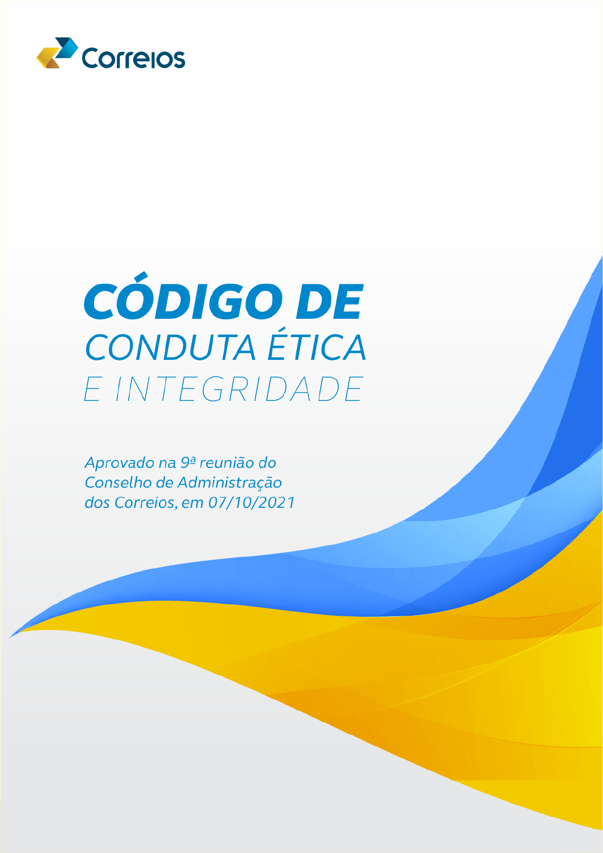 <p>Processo SEI nº 53180.02070/2020-35 - Pág. 1 -</p><p>CÓDIGO DE CONDUTA ÉTICA E</p><p>INTEGRIDADE</p><p>(Aprovado na 9ª reunião do Conselho de Administração dos Correios, em 07/10/2021)</p><p>BRASÍLIA/DF</p><p>07 de outubro de 2021</p><p>Processo SEI nº 53180.02070/2020-35 - Pág. 2 -</p><p>SUMÁRIO</p><p>CAPÍTULO I - DA INTRODUÇÃO ............................................................... 3</p><p>CAPÍTULO II - DA ABRANGÊNCIA ............................................................. 3</p><p>CAPÍTULO III - DO OBJETIVO DO CÓDIGO DE CONDUTA ÉTICA</p><p>E INTEGRIDADE E DA IDENTIDADE CORPORATIVA DOS CORREIOS ....................... 4</p><p>CAPÍTULO IV - DOS PRINCÍPIOS ÉTICOS FUNDAMENTAIS .................................. 4</p><p>CAPÍTULO V - DOS COMPROMISSOS DOS CORREIOS EM RELAÇÃO</p><p>AOS EMPREGADOS ............................................................................. 5</p><p>CAPÍTULO VI - DOS COMPROMISSOS DOS EMPREGADOS EM RELAÇÃO</p><p>AOS CORREIOS .................................................................................. 6</p><p>CAPÍTULO VII - DOS COMPROMISSOS DOS CORREIOS NAS RELAÇÕES</p><p>COM O GOVERNO E A SOCIEDADE ............................................................ 8</p><p>CAPÍTULO VIII - DOS COMPROMISSOS DOS CORREIOS NAS RELAÇÕES</p><p>COM OS CLIENTES .............................................................................. 8</p><p>CAPÍTULO IX - DOS COMPROMISSOS DOS CORREIOS NAS RELAÇÕES</p><p>COM OS FORNECEDORES E OS PARCEIROS .................................................. 9</p><p>CAPÍTULO X - DOS COMPROMISSOS DOS CORREIOS NAS RELAÇÕES</p><p>COM OS CONCORRENTES ...................................................................... 9</p><p>CAPÍTULO XI - DA COMISSÃO DE ÉTICA E DAS PENALIDADES ............................ 10</p><p>CAPÍTULO XII - DAS DISPOSIÇÕES GERAIS .................................................. 12</p><p>CAPÍTULO XIII - DA VIGÊNCIA ............................................................... 13</p><p>Processo SEI nº 53180.02070/2020-35 - Pág. 3 -</p><p>O Conselho de Administração dos Correios resolve aprovar o presente Código Ética de</p><p>Conduta Ética e Integridade, no uso das atribuições que lhe confere o art. 50, inciso</p><p>XXVIII do Estatuto Social dos Correios.</p><p>CAPÍTULO I - DA INTRODUÇÃO</p><p>Art. 1º O Código de Conduta Ética e Integridade dos Correios visa à prevenção de</p><p>desvios éticos de conduta e a consecução de seus objetivos organizacionais,</p><p>promovendo a disseminação da identidade corporativa e de orientações sobre os</p><p>compromissos de agir sempre de acordo com princípios fundados na legislação e na</p><p>Ética, em todas as relações, e sobre as sanções consequentes do descumprimento</p><p>desses dispositivos.</p><p>CAPÍTULO II - DA ABRANGÊNCIA</p><p>Art. 2° Este Código de Conduta Ética e Integridade é de observância obrigatória por todos os</p><p>membros dos Conselhos de Administração e Fiscal e da Diretoria Executiva e dos comitês</p><p>estatutários, assessores especiais contratados, empregados, servidores e empregados cedidos</p><p>aos Correios e cedidos pelos Correios às controladas, coligadas, subsidiárias, mantidas e</p><p>patrocinadas, estagiários, prestadores de serviços, agentes delegados e quaisquer pessoas que</p><p>estejam a serviço dos Correios e de suas ações, inclusive em decorrência de contratos,</p><p>programas sociais, parcerias e voluntariado.</p><p>§ 1º No ato de posse, de assinatura de instrumento formal de vínculo com os Correios</p><p>ou na apresentação à equipe junto a qual exercerá suas atividades, os que são</p><p>abrangidos por este código prestarão compromisso solene de acatamento e observância</p><p>das regras estabelecidas pelo Código de Conduta Ética e Integridade dos Correios.</p><p>§ 2º Constará dos editais de licitação e dos contratos administrativos celebrados pelos</p><p>Correios cláusula por meio da qual os representantes legais e os empregados</p><p>terceirizados (residentes) das empresas prestadoras de serviços assumam a obrigação</p><p>de observar o disposto neste código.</p><p>§ 3º É compromisso dos profissionais dos Correios, dentro de sua competência, orientar</p><p>os prestadores de serviços, os clientes e qualquer pessoa física ou jurídica de direito</p><p>público ou privado para a observância dos compromissos constantes deste código nas</p><p>relações estabelecidas com os Correios.</p><p>§ 4º Os agentes definidos no caput deverão também observar as normas do Código de</p><p>Ética Profissional do Servidor Público Civil do Poder Executivo Federal e do Código de</p><p>Conduta da Alta Administração Federal, no que couber.</p><p>Processo SEI nº 53180.02070/2020-35 - Pág. 4 -</p><p>CAPÍTULO III - DO OBJETIVO DO CÓDIGO DE CONDUTA ÉTICA E</p><p>INTEGRIDADE E DA IDENTIDADE CORPORATIVA DOS CORREIOS</p><p>Art. 3º O presente Código é baseado nos princípios constitucionais, explícitos e</p><p>implícitos, e nas Leis nº 8.429/1992, nº 12.846/2012, nº 12.813/2013, nº 13.709/2018,</p><p>dentre outras que regem a administração pública, e no negócio, missão, visão e valores</p><p>que retratam a identidade corporativa da Empresa, e visa nortear e fomentar uma</p><p>conduta ética nos relacionamentos dela com suas partes interessadas: acionista,</p><p>clientes, sociedade, fornecedores e colaboradores.</p><p>Parágrafo único. Este Código de Conduta Ética e Integridade é baseado no negócio, na</p><p>missão, na visão e nos valores que identificam os Correios:</p><p>I - Negócio: soluções que aproximam;</p><p>II - Missão: conectar pessoas, instituições e negócios por meio de soluções de</p><p>comunicação e logísticas acessíveis, confiáveis e competitivas;</p><p>III - Visão: ser uma plataforma física e digital integrada, de excelência, para o</p><p>fornecimento de soluç