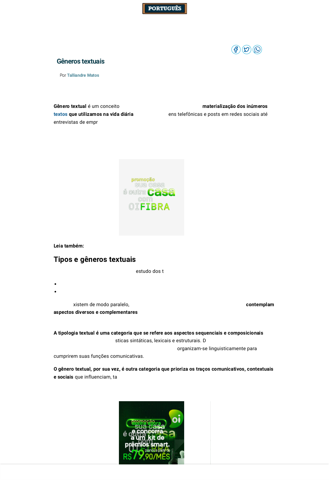<p>Home › Redação › Gêneros textuais</p><p>Gênero textual é um conceito que busca compreender e explicar a materialização dos inúmeros</p><p>textos que utilizamos na vida diária, desde mensagens telefônicas e posts em redes sociais até</p><p>entrevistas de emprego, artigos científicos e outros.</p><p>Os gêneros e tipos textuais relacionam-se, pois aqueles se utilizam destes na sua estrutura. Além</p><p>disso, outros elementos caracterizam os gêneros, como interlocutor, contexto, função social e</p><p>linguagem.</p><p>Leia também: Dicas de preparação para a Redação do Enem</p><p>Tipos e gêneros textuais</p><p>Existem duas grandes categorias no estudo dos textos:</p><p>tipos textuais</p><p>gêneros textuais</p><p>Ambas existem de modo paralelo, mas partem de posicionamentos distintos, por isso contemplam</p><p>aspectos diversos e complementares para categorizar e organizar a variedade de textos que existe</p><p>em nossas sociedades.</p><p>A tipologia textual é uma categoria que se refere aos aspectos sequenciais e composicionais dos</p><p>textos, como suas características sintáticas, lexicais e estruturais. Desse modo, o que se pretende,</p><p>com essa categoria, é analisar a forma como os textos organizam-se linguisticamente para</p><p>cumprirem suas funções comunicativas.</p><p>O gênero textual, por sua vez, é outra categoria que prioriza os traços comunicativos, contextuais</p><p>e sociais que influenciam, também, na organização dos textos. Essa categoria classifica os textos</p><p>por suas funções sociocomunicativas, considerando-se, além da estrutura linguística, os aspectos</p><p>extralinguísticos.</p><p>Gêneros textuais</p><p>Por Talliandre Matos</p><p>https://www.portugues.com.br/</p><p>https://www.portugues.com.br/</p><p>https://www.portugues.com.br/redacao</p><p>https://www.portugues.com.br/redacao</p><p>https://www.portugues.com.br/redacao/texto.html</p><p>https://www.portugues.com.br/redacao/dicas-para-se-preparar-para-redacao-enem.html</p><p>https://www.portugues.com.br/redacao/dicas-para-se-preparar-para-redacao-enem.html</p><p>https://www.portugues.com.br/redacao/dicas-para-se-preparar-para-redacao-enem.html</p><p>https://www.portugues.com.br/redacao/dicas-para-se-preparar-para-redacao-enem.html</p><p>https://www.portugues.com.br/redacao/dicas-para-se-preparar-para-redacao-enem.html</p><p>https://www.portugues.com.br/redacao/dicas-para-se-preparar-para-redacao-enem.html</p><p>https://www.portugues.com.br/redacao/dicas-para-se-preparar-para-redacao-enem.html</p><p>https://www.portugues.com.br/</p><p>https://www.portugues.com.br/</p><p>https://facebook.com/sharer/sharer.php?u=https%3A%2F%2Fwww.portugues.com.br%2Fredacao%2Fgenerostextuais.html</p><p>https://twitter.com/intent/tweet?text=G%C3%AAneros%20textuais%20-%20https%3A%2F%2Fwww.portugues.com.br%2Fredacao%2Fgenerostextuais.html</p><p>whatsapp://send?text=https://www.portugues.com.br/redacao/generostextuais.html</p><p>Os gêneros textuais são fluidos e mutáveis, sempre se adequando às novas necessidades sociais,</p><p>entretanto, todos eles obedecem às regras de natureza linguística e textual que se apresentam em</p><p>todos os gêneros, ou seja, os tipos textuais são aplicados na construção e modificação dos</p><p>gêneros textuais.</p><p>Por meio dessa relação, é possível estabelecer-se combinações entre tipos e gêneros textuais. É</p><p>importante ressaltar que um único gênero pode conter diversos tipos textuais, com predominância</p><p>de um ou mais. Em alguns casos, é possível encontrar gêneros com uma tipologia específica.</p><p>Segue uma lista com os principais tipos textuais e as possíveis relações entre os tipos e gêneros</p><p>textuais:</p><p>Relação entre tipos e gêneros textuais.</p><p>Um mesmo gênero pode abarcar mais de um tipo textual, isso demonstra que utilizamos diversas</p><p>sequências linguísticas para construir nossos textos, sempre as mesclando para potencializar a</p><p>nossa escrita. Além disso, é importante lembrar que, a depender da intenção do autor, os tipos</p><p>textuais podem ser utilizados em hierarquias e arranjos diversos.</p><p>Por exemplo, uma notícia pode ter predominância do tipo narrativo, pois conta um fato. Entretanto,</p><p>a depender do fato a ser contado, o autor pode utilizar o tipo expositivo para explicar contextos</p><p>prévios ao acontecimento em questão, ou ainda utilizar o tipo descritivo para apresentar uma cena</p><p>do ocorrido ou acrescentar detalhes a alguma informação.</p><p>Veja também: Três estratégias argumentativas para melhorar sua redação</p><p>https://www.portugues.com.br/redacao/tipos-textuais.html</p><p>https://www.portugues.com.br/redacao/tres-estrategias-argumentativas-para-melhorar-sua-redacao.html</p><p>Elementos dos gêneros textuais</p><p>Gêneros textuais são um conceito amplo e intencionalmente vago que procura caracterizar os</p><p>textos, primordialmente, pela sua função sociocomunicativa. Desse modo, ao debruçar-se nos</p><p>elementos que caracterizam os gêneros, é possível identificar aspectos referentes a contexto,</p><p>interlocutores, intenção comunicativa, função social e outros.</p><p>O primeiro elemento dos gêneros é a sua função social, ou seja, identificamos qual a finalidade,</p><p>utilidade ou importância que determinados textos cumprem nas sociedades e suas culturas. É</p><p>importante considerar que o estudo do gênero valoriza a linguagem como ação comunicativa ou</p><p>ação social, logo, todo texto nasce de um intuito, de uma necessidade, pessoal ou coletiva, por</p><p>isso é essencial considerar esse elemento na análise dos gêneros.</p><p>Partindo dessas considerações, o segundo elemento essencial do gênero é o que envolve os</p><p>participantes da interação, ou seja, autor/locutor e leitor/ouvinte. Todo indivíduo possui uma</p><p>identidade, um status, ou outros valores que marcam a sua posição social em 