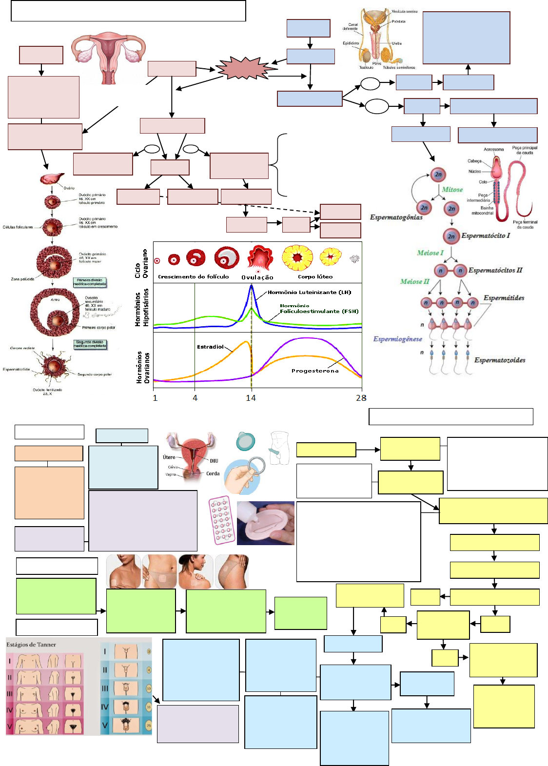 <p>Amanda Sanches Marcussi – Med21</p><p>Concepção e Formação do Ser Humano – Amanda Sanches 2017</p><p>MULHER</p><p>Nasce com folículo</p><p>primordial pronto no</p><p>desenvolvimento</p><p>intrauterino.</p><p>Mais ou menos 400</p><p>mil ovócitos primários</p><p>Hipotálamo</p><p>Na infância inibe o</p><p>desenvolvimento dos...</p><p>Puberdade</p><p>Idade, alimentação,</p><p>fatores ambientais,</p><p>socioeconômicos,</p><p>gene Kiss...</p><p>Hipófise Anterior</p><p>GnRH</p><p>Ovários</p><p>LH FSH</p><p>Estrógeno Progesterona</p><p>Promove o des.</p><p>do folículo</p><p>1- Folículo primordial;</p><p>2- Folículo primário unilaminar;</p><p>3- Folículo primário multilaminar;</p><p>4- Folículo secundário pré-antral;</p><p>5- Folículo secundário antral/ de</p><p>Graaf/ vesicular...</p><p>Maturação</p><p>Estroma Teca</p><p>Pico promove</p><p>ovulação</p><p>Resumindo...</p><p>Hipotálamo</p><p>Hipófise Anterior</p><p>GnRH</p><p>HOMEM</p><p>FSH</p><p>LH Leydig</p><p>Sertoli</p><p>Espermiogênese</p><p>Barreira Hematotesticular</p><p>Interna</p><p>Externa</p><p>Testosterona</p><p>Aumenta: genitálias,</p><p>metabolismo basal,</p><p>anabolismo proteico,</p><p>glândulas sebáceas,</p><p>hipertrofia laríngea (voz)</p><p>CONTRACEPTIVOS</p><p>Comportamentais</p><p>Coito interrompido;</p><p>Temp. Basal;</p><p>Tabelinha;</p><p>Muco Cervical;</p><p>Sinto-térmico.</p><p>Barreiras</p><p>Anticoncepcionais</p><p>hormonais</p><p>Orais: podem ser combinados</p><p>(E+P) ou somente de Progesterona</p><p>com ingestão via oral.</p><p>Injetáveis: podem ser combinados</p><p>ou somente de Progesterona,</p><p>administrados por via parenteral.</p><p>Preservativo masc.;</p><p>Preservativo fem.;</p><p>Diafragma;</p><p>Geleia espermicida.</p><p>Processo que leva o corpo</p><p>humano à maturidade</p><p>sexual ou fertilidade, que é</p><p>a capacidade de</p><p>reprodução.</p><p>PROTOCOLO DE ATENDIMENTO EM CASO DE ABUSO</p><p>Acolhimento</p><p>Atendimento</p><p>Clínico</p><p>Local, data, história clínica,</p><p>tipificação e numero de</p><p>agressores, descrição minuciosa</p><p>e preenchimento da ficha de</p><p>notificação obrigatória. Solicitação e</p><p>Coleta de exames</p><p>Conteúdo vaginal,</p><p>sangue (IST), forense</p><p>(DNA-agressor).</p><p>Anticoncepção de Emergência (AE)</p><p>e profilaxia de IST e HIV</p><p>AE: composto por etnil-estradiol e</p><p>levonorgestrel. Age inibindo ou</p><p>retardando a ovulação e prejudicando a</p><p>mobilidade dos sptz até útero. Não é</p><p>abortivo. Até 72h.(1,5mg – dose única)</p><p>IST: penicilina G benzatina, Ceftriaxona,</p><p>Azitromicina e Metronidazol.</p><p>Quimioprofilaxia para HIV.</p><p>Continuidade no Cuidado</p><p>Atendimento Psicológico</p><p>Diagnóstico de Gravidez Não</p><p>Sim</p><p>Deseja dar</p><p>continuidade? Não</p><p>Sim</p><p>Pré-Natal e</p><p>acompanhamento</p><p>psicológico</p><p>Checar</p><p>necessidade ou</p><p>possibilidade de</p><p>adoção</p><p>Encaminhar para</p><p>interrupção</p><p>RESPOSTA SEXUAL</p><p>Proteção autoantígenos</p><p>Desejo: estímulo</p><p>fisiológico ou</p><p>psicológico para o ato</p><p>Excitatório:</p><p>aumento de PA/FC,</p><p>vasocongestão,</p><p>ereção, lubrificação</p><p>Orgasmo: clímax, auge</p><p>excitatório, ejaculação</p><p>masculina e contração</p><p>dos musc. vaginais</p><p>Resolução:</p><p>período de</p><p>retorno ESTÁGIOS DE TANNER</p><p>I – Infantil (impúbere);</p><p>II, III, IV – Puberal;</p><p>V – Adulto.</p><p>Abortamento</p><p>Infectado: fica retido</p><p>e geralmente é</p><p>produto de tentativa</p><p>ilegal. Contém</p><p>microorg.</p><p>Incompleto: parte do</p><p>embrião ou anexo não</p><p>é expelido. Colo do</p><p>útero geralmente</p><p>fechado e requer</p><p>AMIU ou curetagem</p><p>Completo: quando</p><p>todo o conteúdo</p><p>uterino é expelido.</p><p>Geralmente o colo</p><p>do útero fica aberto</p><p>É a expulsão do ovo</p><p>antes de 22 semanas</p><p>ou concepto >500g</p><p>Ameaça de</p><p>abortamento</p><p>É de gestação</p><p>clinicamente possível e</p><p>exige acompanhamento</p><p>Pode ser precedido</p><p>de morte do</p><p>embrião sem que</p><p>haja a expulsão</p><p>uterina do mesmo</p><p>Amanda Sanches Marcussi – Med21</p><p>Caso o espermatozoide</p><p>consiga vencer todas as</p><p>barreiras encontradas...</p><p>O spzt atravessa a</p><p>Corona Radiata</p><p>mov. do flagelo</p><p>Passagem pela</p><p>Zona Pelúcida</p><p>Composta por</p><p>proteínas ZP (1,2,3).</p><p>A ligação do sptz com a</p><p>ZP3 permite a formação</p><p>dos poros e liberação de</p><p>enzimas acrossômicas.</p><p>Membrana do sptz e do</p><p>ovócito se unem</p><p>União dos citoplasmas</p><p>Bloqueio de Poliespermia</p><p>Rápido: despolarização da</p><p>memb. que impossibilita</p><p>entrada de novo sptz.</p><p>Lento: influxo de Ca que</p><p>desencadeia a liberação de</p><p>enzimas proteolíticas</p><p>(reação cortical) que</p><p>enrijecem a Zona Pelúcida</p><p>e inativa a ZP3.</p><p>A entrada do espermatozoide</p><p>estimula a segunda divisão do</p><p>ovócito, gerando um ovócito</p><p>maduro e o segundo corpo polar</p><p>Formação do pronúcleo feminino</p><p>O núcleo do sptz aumenta de</p><p>tamanho e forma o pronúcleo</p><p>masculino e a cauda se degenera</p><p>O ovócito com os dois</p><p>pronúcleos chama-se</p><p>Oótide</p><p>A fusão dos pronúcleos forma</p><p>uma célula diploide que é</p><p>chamada de Zigoto</p><p>O termo Concepto está relacionado</p><p>ao produto da concepção, incluindo</p><p>tudo o que deriva do zigoto: o</p><p>embrião/feto e suas estruturas</p><p>anexas (placenta, saco vitelínico).</p><p>Clivagens do Zigoto (E!)</p><p>inicia-se 30h após a</p><p>fecundação</p><p>Essas “células-filhas”</p><p>são denominadas</p><p>Blastômeros</p><p>Quando existem de 12 a</p><p>32 blastômeros, recebe o</p><p>nome de Mórula (3 dias)</p><p>O transporte do concepto</p>