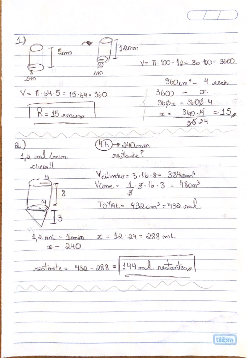 <p>1) 5cm 12cm V= an 4 3600 - x 960x = R=15 x = = =15, 9524 2) 4h 1,2 ml Vcone= 48cm3 8 4 TOTAL I3 x = 240 restante= 144 ml tilibra</p><p>/ / 3) = r = 3 3 > TOTAL I 112 Verfera = = 2 3 3 com aumento do r 3 = r3 = 3 3 2 V = = 2.3,375 3 TOTAL = 3,375 3,375 = 3,375 = 3375 = = 27 1000 -125 8 tilibra</p>