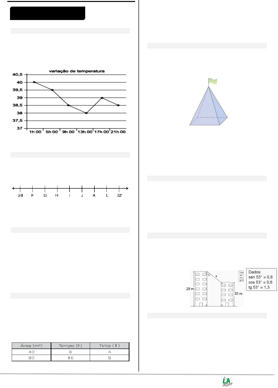 <p>BLOCO 01</p><p>QUESTÃO 01 – D34 - D35</p><p>O gráfico abaixo mostra a variação de temperatura de um paciente, registrada a cada 4 horas no período de 1h 00 às 21h 00. Pode-se afirmar que a temperatura do paciente vinha diminuindo até que ocorreu uma elevação registrada às:</p><p>(A) 5h 00. (B) 9h00. (C) 17h 00. (D) 21h 00.</p><p>QUESTÃO 02 – D14</p><p>Observe a reta numérica abaixo, na qual estão representados números equidistantes (a mesma distância) 28, F, G, H, I, J, K, L, 32.</p><p>Qual é o ponto correspondente ao número 30,5?</p><p>(A) G (B) H (C) I (D) J (E) K</p><p>QUESTÃO 03 – D19</p><p>Para estipular o preço por seu trabalho, o pintor de paredes André cobra uma taxa fixa de R$ 50,00 e mais uma taxa de R$ 10,00 por m2 pintado. André vai pintar uma parede de 10m2. Quanto André cobrará por esse trabalho?</p><p>(A) R$ 150,00 (B) R$ 100,00</p><p>(C) R$ 50,00 (D) R$ 200,00</p><p>QUESTÃO 04 – D15</p><p>Um pintor demorou 2 horas e gastou 1 litro de tinta para pintar uma superfície de 10 m2. Nessa mesma proporção, ele projetou os gastos para pintar outras superfícies e organizou como mostra o quadro abaixo.</p><p>Para pintar 200 m2, ele gastará:</p><p>(A) 8h e 4 litros (B) 24h e 12 litros</p><p>(C) 16h e 8 litros (D) 40h e 20 litros</p><p>QUESTÃO 05 – D13</p><p>O prefeito de uma cidade pretende colocar em frente à prefeitura um mastro com uma bandeira, que será apoiado sobre uma pirâmide de base quadrada feita de concreto maciço, como mostra a figura.</p><p>Sabendo-se que a aresta da base da pirâmide terá 3 m e que a altura da pirâmide será de 4 m, o volume de concreto (em m3) necessário para a construção da pirâmide será:</p><p>(A) 36 m3. (B) 27 m3. (C) 18 m3.</p><p>(D) 12 m3. (E) 4 m3.</p><p>QUESTÃO 06 – D16</p><p>Certo banco cobra juros simples de 0,3% ao dia para contas pagas com atraso de até 30 dias. Pedro pagou uma conta de R$ 50,00 com atraso de 12 dias. O valor pago por Pedro foi de:</p><p>(A) R$ 51,00 (B) R$ 51,40</p><p>(C) R$ 51,80 (D) R$ 52,20</p><p>QUESTÃO 07 – D05</p><p>(PAEBES). Um telhado será instalado entre dois prédios de um condomínio, de forma que sua inclinação em relação ao prédio maior será de 53°, conforme representado no desenho abaixo. Qual será o comprimento x desse telhado?</p><p>A) 5,4</p><p>B) 6,9</p><p>C) 9,0</p><p>D) 11,2</p><p>E) 15,0</p><p>QUESTÃO 08 – D17</p><p>Um certo reservatório, contendo 72 m3 de água, deve ser drenado para limpeza. Decorridas t horas após o início da drenagem, o volume de água que saiu do reservatório, em m3, é dado por V(t) = 24t - 2t2. Sabendo-se que a drenagem teve início às 10 horas, o reservatório estará completamente vazio às:</p><p>(A) 14 horas. (B) 16 horas.</p><p>(C) 19 horas. (D) 22 horas.</p><p>QUESTÃO 09 – D18</p><p>No início do dia, às 6:00 da manhã, o nível da caixa de água da cidade era de 15,0 m de altura. À medida que o tempo foi passando, o nível da água foi baixando na caixa, conforme registrado na tabela:</p><p>Se chamarmos as horas do dia de H e o nível da água na caixa de N, qual é a equação matemática que poderemos escrever para relacionar H e N?</p><p>(A) N = 2,5H + 2,5 (B) N = 2,5H – 2,5</p><p>(C) N = –2,5H + 30 (D) N = –2,5H – 2,5</p><p>QUESTÃO 10 – D25</p><p>Quais são as coordenadas do ponto vértice da parábola assinalado na figura, referente ao gráfico da função y = – 2x2 – 6x + 8?</p><p>(A) ( – 3/2, 25/2) (B) ( –3/2, -25/2)</p><p>(C) ( 3/2, -25/2) (D) ( 3/2, 25/2)</p><p>QUESTÃO 11 – D20</p><p>Qual dos gráficos seguintes representa a função de 1o grau definida pela equação y = 4x + 2?</p><p>A) C)</p><p>B) D)</p><p>QUESTÃO 12 – D22</p><p>Dada a sequência definida por:</p><p>O sexto termo é:</p><p>(A) 17 (B) 35 (C) 23 (D) 10</p><p>QUESTÃO 13 – D22</p><p>Dada a progressão geométrica 2, 8, 32, 128,.. O sexto termo é:</p><p>(A) 2048 (B) 1024 (C) 512 (D) 256</p><p>QUESTÃO 14 –</p><p>Todo ponto de vista é a vista de um ponto</p><p>Ler significa reler e compreender, interpretar. Cada um lê com os olhos que tem. E interpreta a partir de onde os pés pisam.</p><p>Todo ponto de vista é um ponto. Para entender como alguém lê, é necessário saber como são seus olhos e qual é sua visão de mundo. Isso faz da leitura sempre uma releitura.</p><p>A cabeça pensa a partir de onde os pés pisam. Para compreender, é essencial conhecer o lugar social de quem olha. Vale dizer: como alguém vive, com quem convive, que experiências tem, em que trabalha, que desejos alimenta, como assume os dramas da vida e da morte e que esperanças o animam. Isso faz da compreensão sempre uma interpretação.</p><p>Boff, Leonardo. A águia e a galinha. 4ª ed. RJ: Sextante, 1999</p><p>A expressão “com os olhos que tem” (l.1), no texto, tem o sentido de</p><p>(A) enfatizar a leitura. (B) incentivar a leitura.</p><p>(C) individualizar a leitura. (D) priorizar a leitura.</p><p>(E) valorizar a leitura.</p><p>QUESTÃO 15 –</p><p>Quando a separação não é um trauma</p><p>A Socióloga Constance Ahrons, de Wisconsin, acompanhou por 20 anos um grupo de 173 filhos de divorciados. Ao atingir a idade adulta, o índice de problemas emocionais nesse grupo era equivalente ao dos filhos de pais casados. Mas Ahrons observou que eles "emergiam mais fortes e mais amadurecidos que a média, apesar ou talvez por causa dos divórcios e recasamentos de seus pais". (...) Outros trabalhos apontaram para conclusões semelhantes. Dave Riley, professor da universidade de Madison, dividiu os grupos de divorciados em dois: os que se tratavam civilizadamente e os que viviam em conflito. Os filhos dos primeiros iam bem na escola e eram tão saudáveis emocionalmente quanto os filhos de casais "estáveis". (...)</p><p>Uma família unida é o ideal para uma criança, mas é possível apontar pontos positivos para os filhos de separados. "Eles amadurecem mais cedo, o que de certa forma é bom, num mundo q