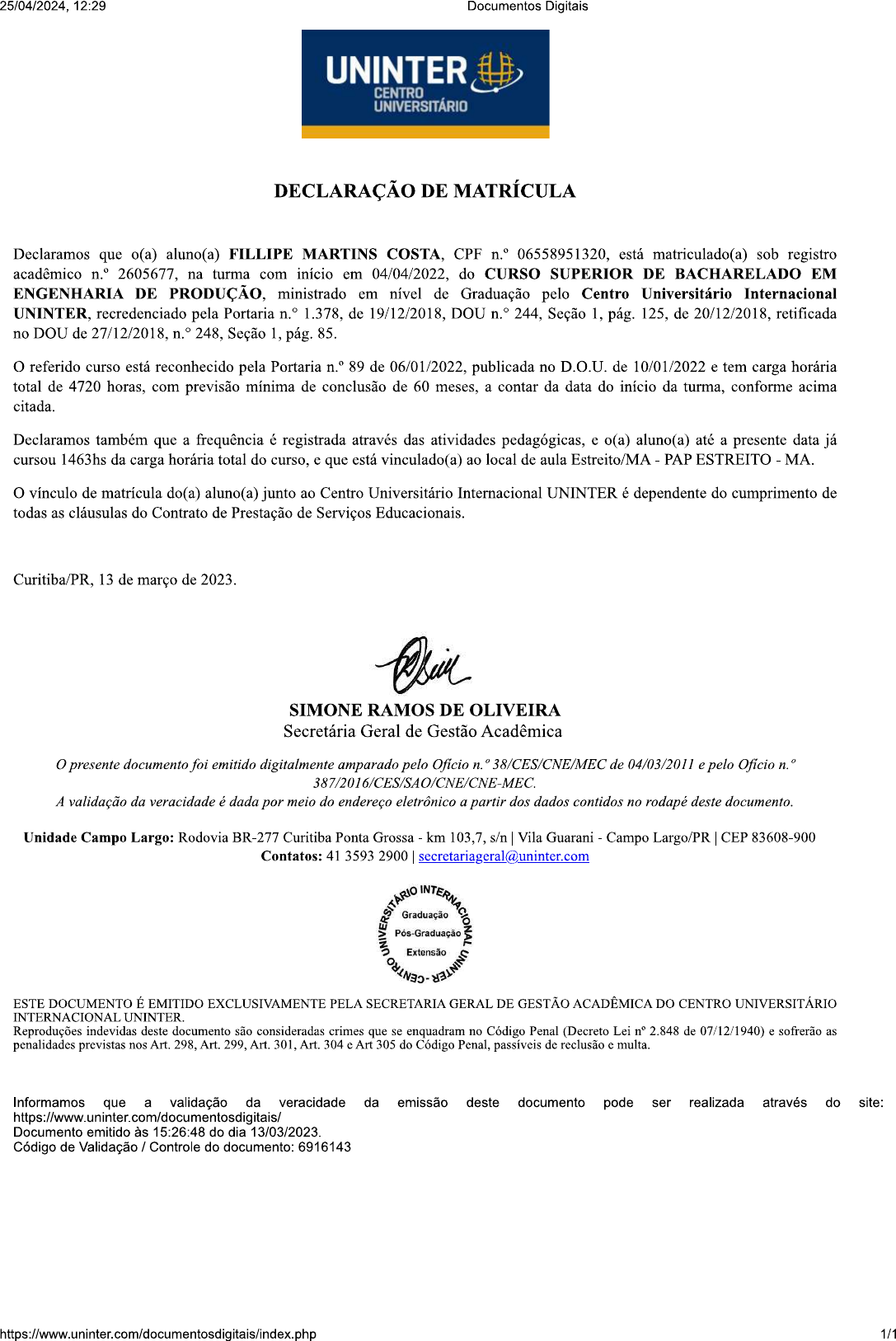 <p>25/04/2024, 12:29 Documentos Digitais UNINTER CENTRO UNIVERSITÁRIO DECLARAÇÃO DE MATRÍCULA Declaramos que o(a) aluno(a) FILLIPE MARTINS COSTA, CPF 06558951320, está matriculado(a) sob registro acadêmico 2605677, na turma com início em 04/04/2022, do CURSO SUPERIOR DE BACHARELADO EM ENGENHARIA DE ministrado em nível de Graduação pelo Centro Universitário Internacional UNINTER, recredenciado pela Portaria 1.378, de 19/12/2018, DOU 244, Seção 1, pág. 125, de 20/12/2018, retificada no DOU de 27/12/2018, Seção 1, pág. 85. referido curso está reconhecido pela Portaria 89 de 06/01/2022, publicada no D.O.U. de 10/01/2022 e tem carga horária total de 4720 horas, com previsão mínima de conclusão de 60 meses, a contar da data do início da turma, conforme acima citada. Declaramos também que a frequência é registrada através das atividades pedagógicas, e o(a) aluno(a) até a presente data já cursou 1463hs da carga horária total do curso, e que está vinculado(a) ao local de aula Estreito/MA PAP ESTREITO MA. O vínculo de matrícula do(a) aluno(a) junto ao Centro Universitário Internacional UNINTER é dependente do cumprimento de todas as cláusulas do Contrato de Prestação de Serviços Educacionais. Curitiba/PR, 13 de março de 2023. SIMONE RAMOS DE OLIVEIRA Secretária Geral de Gestão Acadêmica presente documento foi emitido digitalmente amparado pelo 38/CES/CNE/MEC de 04/03/2011 e pelo Ofício A validação da veracidade é dada por meio do endereço eletrônico a partir dos dados contidos no rodapé deste documento. Unidade Campo Largo: Rodovia BR-277 Curitiba Ponta Grossa - km 103,7, s/n Vila Guarani Campo Largo/PR CEP 83608-900 Contatos: 41 3593 2900 secretariageral@uninter.com Graduação Pós-Graduação Extensão ESTE DOCUMENTO É EMITIDO EXCLUSIVAMENTE PELA SECRETARIA GERAL DE GESTÃO ACADÊMICA DO CENTRO UNIVERSITÁRIO INTERNACIONAL Reproduções indevidas deste documento são consideradas crimes que se enquadram no Código Penal (Decreto Lei n° 2.848 de 07/12/1940) e sofrerão as penalidades previstas nos Art. 298. Art. 299. Art. 301, Art. 304 e Art 305 do Código Penal, passíveis de reclusão e multa. Informamos que a validação da veracidade da emissão deste documento pode ser realizada através do site: https://www.uninter.com/documentosdigitais/ Documento emitido às 15:26:48 do dia 13/03/2023. Código de Validação / Controle do documento: 6916143 https://www.uninter.com/documentosdigitais/index.php 1/1</p>