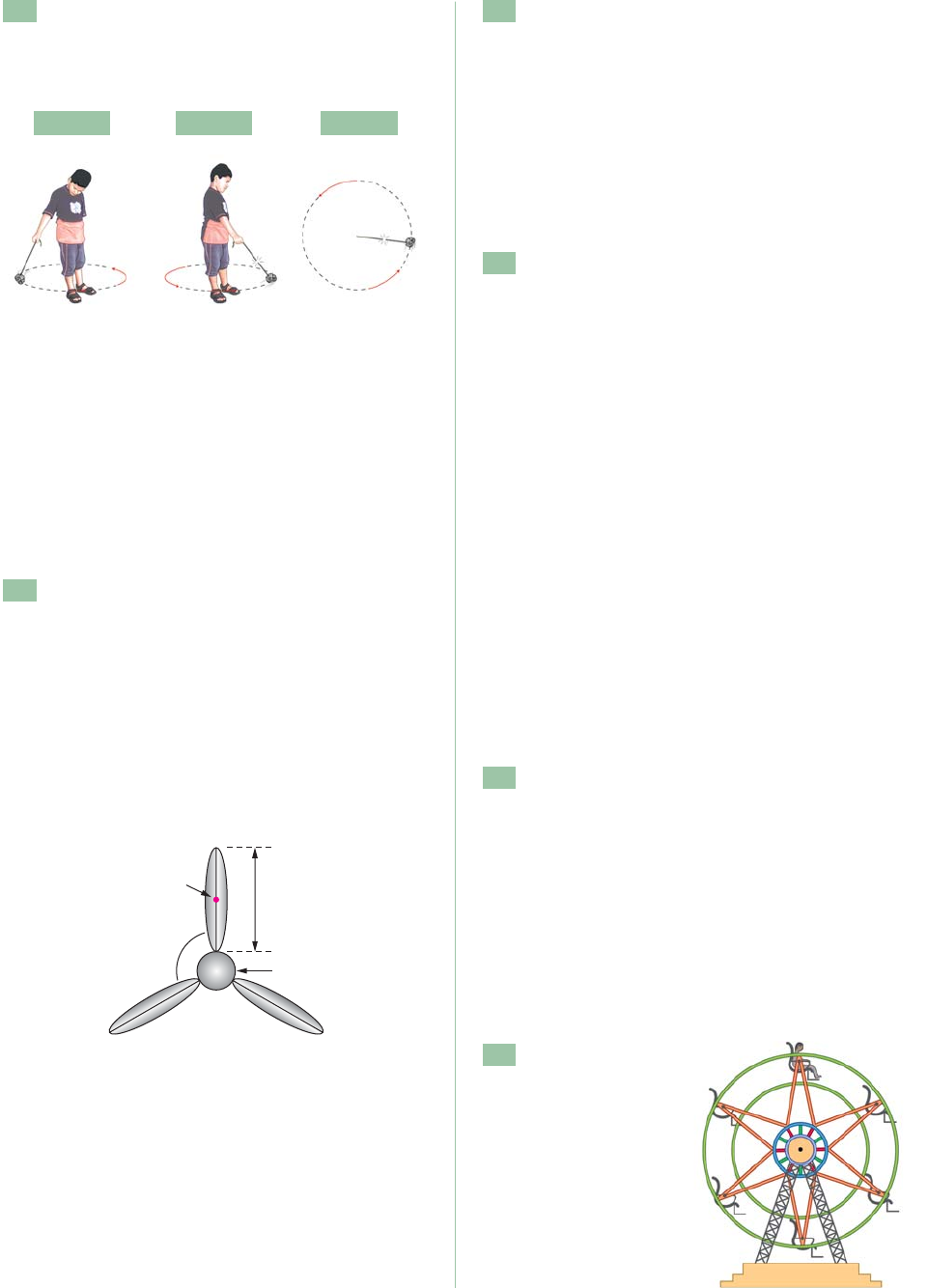 <p>26</p><p>134 (Fameca-SP) A seqüência representa um meni-</p><p>no que gira uma pedra através de um fio, de massa</p><p>desprezível, numa velocidade constante. Num de-</p><p>terminado instante, o fio se rompe.</p><p>figura A figura B figura C</p><p>a) Transcreva a figura C para sua folha de respostas</p><p>e represente a trajetória da pedra após o rompimento</p><p>do fio.</p><p>b) Supondo-se que a pedra passe a percorrer uma</p><p>superfície horizontal, sem atrito, que tipo de movi-</p><p>mento ela descreverá após o rompimento do fio?</p><p>Justifique sua resposta.</p><p>135 (Fuvest-SP) Um ventilador de teto, com eixo ver-</p><p>tical, é constituído por três pás iguais e rígidas, en-</p><p>caixadas em um rotor de raio R � 0,10 m, forman-</p><p>do ângulos de 120° entre si. Cada pá tem massa</p><p>M � 0,20 kg e comprimento L � 0,50 m. No centro</p><p>de uma das pás foi fixado um prego P, com massa</p><p>mp � 0,020 kg, que desequilibra o ventilador, prin-</p><p>cipalmente quando ele se movimenta.</p><p>Suponha, então, o ventilador girando com uma ve-</p><p>locidade de 60 rotações por minuto e determine:</p><p>a) A intensidade da força radial horizontal F, em</p><p>newtons, exercida pelo prego sobre o rotor.</p><p>b) A massa M0, em kg, de um pequeno contrapeso</p><p>que deve ser colocado em um ponto D0, sobre a</p><p>borda do rotor, para que a resultante das forças ho-</p><p>rizontais, agindo sobre o rotor, seja nula.</p><p>c) A posição do ponto D0, localizando-a no esque-</p><p>ma da folha de respostas.</p><p>(Se necessário utilize � 3)</p><p>136 (FMU-SP) A velocidade que deve ter um corpo</p><p>que descreve uma curva de 100 m de raio, para que</p><p>fique sujeito a uma força centrípeta numericamente</p><p>igual ao seu peso, é</p><p>Obs.: Considere a aceleração da gravidade igual a</p><p>10 m/s2.</p><p>a) 31,6 m/s c) 63,2 m/s e) 630,4 m/s</p><p>b) 1 000 m/s d) 9,8 m/s</p><p>137 (FGV-SP) Um automóvel de 1 720 kg entra em</p><p>uma curva de raio r � 200 m, a 108 km/h. Sabendo</p><p>que o coeficiente de atrito entre os pneus do automó-</p><p>vel e a rodovia é igual a 0,3, considere as afirmações:</p><p>I – O automóvel está a uma velocidade segura para</p><p>fazer a curva.</p><p>II – O automóvel irá derrapar radialmente para fora</p><p>da curva.</p><p>III – A força centrípeta do automóvel excede a força</p><p>de atrito.</p><p>IV – A força de atrito é o produto da força normal</p><p>do automóvel e o coeficiente de atrito.</p><p>Baseado nas afirmações acima, verifique:</p><p>a) Apenas I está correta.</p><p>b) As afirmativas I e IV estão corretas.</p><p>c) Apenas II e III estão corretas.</p><p>d) Estão corretas I, III e IV.</p><p>e) Estão corretas II, III e IV.</p><p>138 (Unitau-SP) Um corpo de massa 1,0 kg, acopla-</p><p>do a uma mola, descreve uma trajetória circular de</p><p>raio 1,0 m em um plano horizontal, sem atrito, à</p><p>razão de 30 voltas por segundo. Estando a mola</p><p>deformada de 2,0 cm, pode-se afirmar que sua cons-</p><p>tante elástica vale:</p><p>a) 2 N/m d) 2 � 103 N/m</p><p>b) � 10 N/m e) 1,8 2 � 105 N/m</p><p>c) p 2 � 102 N/m</p><p>139 (FGV-SP) A figura</p><p>representa uma roda-</p><p>gigante que gira com</p><p>velocidade angular</p><p>constante em torno do</p><p>eixo horizontal fixo</p><p>que passa por seu cen-</p><p>tro C.</p><p>0,50 m</p><p>120°</p><p>P</p><p>rotor</p><p>27</p><p>Numa das cadeiras há um passageiro, de 60 kg de</p><p>massa, sentado sobre uma balança de mola</p><p>(dinamômetro), cuja indicação varia de acordo com</p><p>a posição do passageiro. No ponto mais alto da tra-</p><p>jetória o dinamômetro indica 234 N e no ponto mais</p><p>baixo indica 954 N. Considere a variação do compri-</p><p>mento da mola desprezível quando comparada ao</p><p>raio da roda. Calcule o valor da aceleração local da</p><p>gravidade.</p><p>140 (Fuvest-SP) Um carrinho é largado do alto de</p><p>uma montanha russa, conforme a figura. Ele se</p><p>movimenta, sem atrito e sem soltar-se dos trilhos,</p><p>até atingir o plano horizontal. Sabe-se que os raios</p><p>de curvatura da pista em A e B são iguais. Considere</p><p>as seguintes afirmações:</p><p>III – No ponto A, a resultante das forças que agem</p><p>sobre o carrinho é dirigida para baixo.</p><p>III – A intensidade da força centrípeta que age sobre</p><p>o carrinho é maior em A do que em B.</p><p>III – No ponto B, o peso do carrinho é maior do que</p><p>a intensidade da força normal que o trilho exerce</p><p>sobre ele.</p><p>Está correto apenas o que se afirma em:</p><p>a) I b) II c) III d) I e II e) II e III</p><p>141 (UFES) A figura 01 abaixo representa uma esfe-</p><p>ra da massa m, em repouso, suspensa por um fio</p><p>inextensível de massa desprezível. A figura 02 re-</p><p>presenta o mesmo conjunto oscilando como um pên-</p><p>dulo, no instante em que a esfera passa pelo ponto</p><p>mais baixo de sua trajetória.</p><p>a) O pêndulo A oscila mais devagar que o pêndulo B.</p><p>b) O pêndulo A oscila mais devagar que o pêndulo C.</p><p>c) O pêndulo B e o pêndulo D possuem mesma fre-</p><p>qüência de oscilação.</p><p>d) O pêndulo B oscila mais devagar que o pêndulo D.</p><p>e) O pêndulo C e o pêndulo D possuem mesma fre-</p><p>qüência de oscilação.</p><p>144 (MACK-SP) Regulamos num dia frio e ao nível</p><p>do mar um relógio de pêndulo de cobre. Este mes-</p><p>mo relógio, e no mesmo local, num dia quente de-</p><p>verá:</p><p>a) não sofrer alteração no seu funcionamento</p><p>b) adiantar</p><p>c) atrasar</p><p>d) aumentar a freqüência de suas oscilações</p><p>e) n.d.a.</p><p>145 (UFPR) Como resultado de uma série de experi-</p><p>ências, concluiu-se que o período T das pequenas</p><p>oscilações de um pêndulo simples de comprimento</p><p>A respeito da tensão no fio e do peso da esfera res-</p><p>pectivamente, no caso da Figura 01 (T1 e P1) e no</p><p>caso da Figura 02