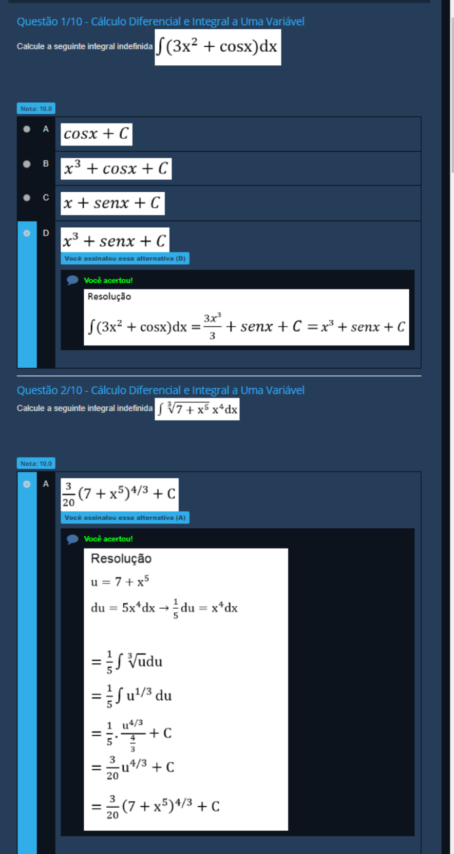 <p>Questão 1/10 - Cálculo Diferencial e Integral a Uma Variável Calcule a seguinte integral indefinida + cosx)dx Nota: A cosx + C B x3 + cosx + C C x + senx + C D x3 + senx + C Você assinalou essa alternativa (D) Você acertou! Resolução (3x2 + cosx)dx = 3x3 3 + senx + C=x3 + senx + C Questão 2/10 - Cálculo Diferencial e Integral a Uma Variável Calcule a seguinte integral indefinida Nota: A 3 + C 20 assinalou essa alternativa (A) Você acertou! Resolução 5 1 = 5 = 5 1 du 1 = - C 3 = = 3 20</p><p>Questão 3/10 - Cálculo Diferencial e Integral a Uma Variável Calcule a seguinte integral indefinida Nota: A - Vx5 + C 3 5 Você assinalou essa alternativa (A) Você acertou! Resolução 5 = x3 5 3 3 x3 + C 3 - x3 + C 3 D 2 Questão 4/10 - Cálculo Diferencial e Integral a Uma Variável 4 Calcule a seguinte integral definida Nota: A 64 3 54 - 3 Você assinalou essa alternativa (B) Você acertou! RESOLUCIO : 4 x 3 3 2 - 4 = 3 3 - 3x = =</p><p>Questão 5/10 - Cálculo Diferencial e Integral a Uma Variável Determinar a área limitada pela curva y=4x-x2 e pelo eixo Nota: A 32 a 3 Você assinalou essa alternativa (A) Você acertou! Resolução: 0 x(4-x)= 0 A = 2 3 64 3 96-64 3 32 3 B 25 a 3 C 37 a 3 D 41 a 3 Questão 6/10 - Cálculo Diferencial e Integral a Uma Variável Como escrever a integral para calcular a área entre o eixo x, a reta = a reta e a parábola usando o eixo x como referência? Nota: A 2 A = Você assinalou essa alternativa (A) Você acertou! y f(x) 4 1 o 1 2 Resolução: Verticalmente simples: variável de integração é A = dx</p><p>Questão 9/10 - Cálculo Diferencial e Integral a Uma Variável Determinar a área entre as curvas e Nota: A 28/3 u.a. 64/3 u.a. Você assinalou essa alternativa (B) Você acertou! Resolução: Interseção entre as curvas ou = 8 ou = 4 A = = 3 82 = 3 - 3 = 16 3 2 3 (un. de área) C 58/3 u.a. D 67/3 u.a. Questão 10/10 - Cálculo Diferencial e Integral a Uma Variável Gás está sendo bombeado para um balão esférico à razão de 0,1 Ache a taxa de variação do raio quando este é de 0,45 m. Dado: = 3,14 Nota: A 0,03931m/min Você assinalou essa alternativa (A) Você acertou! dV dr = =? r = 0,45m dt dt dV dt = dt 0,1 = dt 0,1 = dr dt dr dt</p>