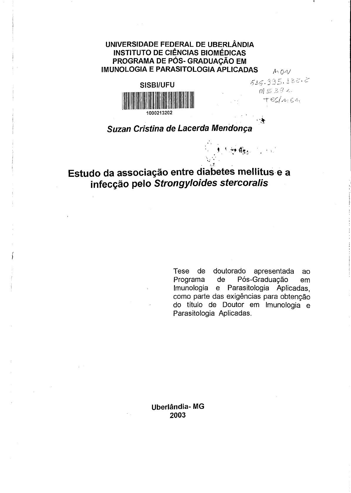 <p>UNIVERSIDADE FEDERAL DE UBERLÂNDIA</p><p>INSTITUTO DE CIÊNCIAS BIOMÉDICAS</p><p>PROGRAMA DE PÓS- GRADUAÇÃO EM</p><p>IMUNOLOGIA E PARASITOLOGIA APLICADAS a o a</p><p>SISBI/UFU</p><p>íYI S '1 5 -</p><p>~r</p><p>1000213202</p><p>• Á</p><p>Suzan Cristina de Lacerda Mendonça</p><p>Estudo da associação entre diabetes mellitus e a</p><p>infecção pelo Strongyloides stercoralis</p><p>í</p><p>Tese de doutorado apresentada ao</p><p>Programa de Pós-Graduação em</p><p>1 Imunologia e Parasitologia Aplicadas,</p><p>como parte das exigências para obtenção</p><p>do título de Doutor em Imunologia e</p><p>Parasitologia Aplicadas.</p><p>Uberlândia- MG</p><p>2003</p><p>UNIVERSIDADE FEDERAL DE UBERLÂNDIA</p><p>INSTITUTO DE CIÊNCIAS BIOMÉDICAS</p><p>PROGRAMA DE PÓS- GRADUAÇÃO EM</p><p>IMUNOLOGIA E PARASITOLOGIA APLICADAS</p><p>Suzan Cristina de Lacerda Mendonça</p><p>Estudo da associação entre diabetes mellitus e a</p><p>infecção pelo Strongyloides stercoralis.</p><p>Tese de doutorado apresentada ao</p><p>Programa de Pós-Graduação em</p><p>Imunologia e Parasitologia Aplicadas,</p><p>como parte das exigências para obtenção</p><p>do título de Doutor em Imunologia e</p><p>Parasitologia Aplicadas.</p><p>Prof.a Dra. Julia Maria Costa-Cruz</p><p>Orientadora</p><p>Uberlândia- MG</p><p>2003</p><p>(Dedicatória</p><p>J? (Deus, peías inúmeras Bênçãos e</p><p>oportunidades que me proporcionou. (Permita</p><p>que eu tenha sapiência para não desperdiçá-</p><p>las.</p><p>Jlos meusfdíios Jãrthure Otávio, por terem me</p><p>ensinado que o amor não tem [imites e que é</p><p>possíveí ser meffior quando aprendemos o que</p><p>as crianças têm para nos ensinar. Jãmo vocês.</p><p>JLo meu esposo Orfando que sempre esteve ao</p><p>meu [ado me apoiando, estimulando e</p><p>confiando nas minhas escodias. O caminho ao</p><p>seu íddo é mais seguro. Obrigada.</p><p>fi minha mãe, [Neyde, que é a grande</p><p>responsáveh pe[o que eu sou, que me ensinou</p><p>através do eyemp[o as maiores virtudes do</p><p>homem como amor, honestidade, humildade,</p><p>ética e perseverança.</p><p>Agradecimentos</p><p>professora</p><p>em pacientes com</p><p>estrongiloidíase. Revista do Instituto de Medicina Tropical de São Paulo,</p><p>v.3, p. 181-186, 1961.</p><p>PIRES, M.L., DREYER, G. Revendo a importância do Strongyloides stercoralis.</p><p>Revista do Hospital de Clínicas da Faculdade de Medicina de São Paulo, v.</p><p>48, n. 4, p. 175-182, 1993.</p><p>POZZILLI, P., PAGANI, S., ARDUINI, P. In vivo determination of cell mediated</p><p>immune response in diabetic patients using a multiple intradermal antigen</p><p>dispenser. Diabetes Research, v. 6, p. 5-8, 1987.</p><p>RICHIE, L.S. An ether sedimentation techinique for routine stool examination.</p><p>Bulletin of the National Service of Army- Medicai Department, v. 8, p. 326-</p><p>334, 1948.</p><p>RUGAI, E.; MATTOS, T.; BRJSOLA, A.P. Nova técnica para isolar larvas de</p><p>nematóides das fezes: modificações do método de Baermann. Revista do</p><p>Instituto Adolph Lutz, v. 14, p. 5-8, 1954</p><p>SANTOS, M. A. Q.; PAÇÔ, J.M.; ISAC, E.; ALVES, E.L.; VIEIRA, M.A.</p><p>Prevalência estimada de parasitas intestinais em escolares de creches e</p><p>estabelecimentos de ensino em Goiânia- Goiás. Revista de Patologia</p><p>Tropical de Goiânia, v. 19, p. 35-45, 1990</p><p>SATO, Y.; INOUE, F.; MATSUYAMA, R.; SHIROMA, Y. Immunoblot analysis of</p><p>antibodies in human strongyloidiasis. Transactions of the Royal Society of</p><p>Tropical Medicine and Hygiene, v. 84, p. 403-406, 1990.</p><p>SATO, Y„ TOMA, H. KIYUNA, S. SHIROMA, Y. Gelatin particule indirect</p><p>agglutination test for examination for strongyloidiasis. Transactions of the</p><p>Royal Society of Tropical Medicine and Hygiene, v. 85, p. 515-518, 1991.</p><p>SATO Y, KOBAYASHIJ, TOMA H, SHIROMA Y. Efficacy of stool examination</p><p>for detection of strongyloides infection. American Journal of Tropical</p><p>Medicine and Hygiene, v. 53, p. 248-250, 1995.</p><p>Referências Bibliográficas 44</p><p>SENTOCHNIK, D.E., ELIOPOULOS, G.M. Infection and Diabetes. In: Joslin's</p><p>Diabetes Mellitus. 13 ed. Lea & Febiger. Malvern, 1994, 1068 p„ p. 867-888.</p><p>SIDDIQUI AA, BERK SL. Diagnosis of Strongyloides stercoralis infection.</p><p>Clinics of Infectious Diseases, v. 33, p. 1040-1047, 2001.</p><p>SILVA, L.P.; BARCELOS, I.S.; PASSOS-LIMA, A.B.; ESPÍNDOLA, F.S.;</p><p>CAMPOS, D.M.; COSTA- CRUZ, J.M. Western blotting using Strongyloides ratti</p><p>antigen for the detection of IgG antibodies as confirmatory test in human</p><p>strongyloidiasis. Memórias do Instituto Oswaldo Cruz, v. 98 p 687-691</p><p>2003.</p><p>SOERENSEN, B„ CORRÊA, H.C.S., FREITAS, J.P.A. BANDEIRA, D.C. A</p><p>estrongiloidíase simulando tumores gastrointestinais ou associada à processos</p><p>neoplásicos. Seu tratamento pelo thiabendazol. Revista Brasileira de Cirurgia</p><p>v. 3, p. 159-165, 1964.</p><p>SUDARSHI, S.; STUMPFLE, R.; ARMSTRONG, M.; ELLMAN, T.; PARTON, S.;</p><p>KRISHNAN, P.; CHIODINI, P.L.; WHITTY, C.J.M. Clinicai presentation and</p><p>diagnostic sensitivity of laboratory tests for Strongyloides stercoralis in travellers</p><p>compared with immigrants in a non-endemic country. Tropical Medicine and</p><p>International Health, v. 8, p. 728-732, 2003.</p><p>THE EXPERT COMMITTEE ON THE DIAGNOSIS AND CLASSIFICATION OF</p><p>DIABETES MELLITUS. Diabetes care, v.20, n.7, p. 1183-1196, 1997.</p><p>TOWBIN, H., STAEHELIN, T„ GORDON, J. Eletrophoretic transfer of proteins</p><p>from polyacrylamide gels to nitrocellulose sheets: procedure and some</p><p>applications. Proceedings of the National Academy of Sciences of the USA,</p><p>v. 76, n. 9, p. 4350-4354, 1979.</p><p>UPARANUKRAW, P„ PHONGSRI, S„ MORAKOTE, N. Fluctuations of larval</p><p>excretion in Strongyloides stercoralis infection. American Journal of Tropical</p><p>Medicine and Hygiene, v.60, n. 6, p. 967-973, 1999.</p><p>