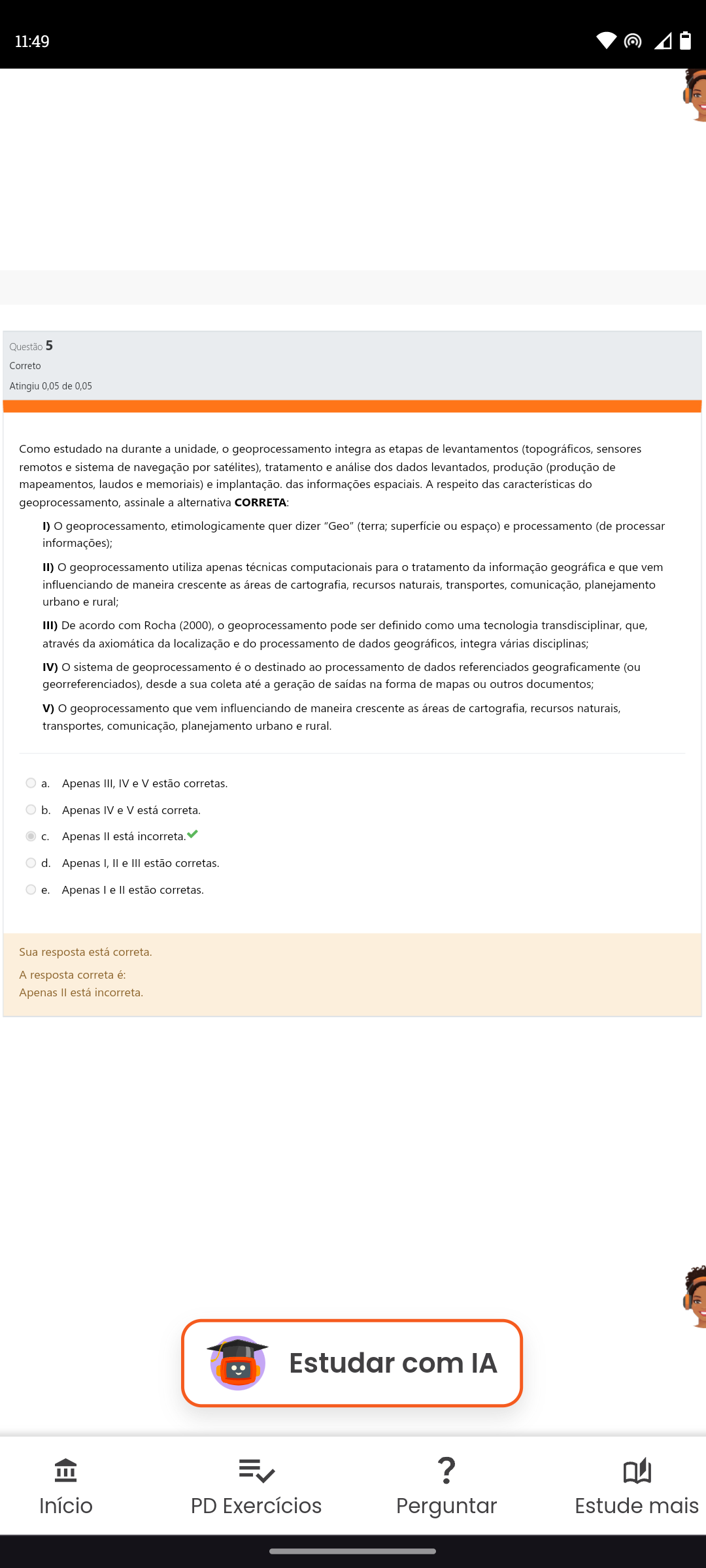 <p>Questão 5 Correto Atingiu 0,05 de 0,05 Como estudado na durante a unidade, integra as etapas de levantamentos (topográficos, sensores remotos e sistema de navegação por satélites), tratamento e análise dos dados levantados, produção (produção de mapeamentos, laudos e memoriais) e implantação. das informações espaciais. A respeito das características do geoprocessamento, assinale a alternativa CORRETA: I) geoprocessamento, etimologicamente quer dizer "Geo" (terra; superfície ou espaço) e processamento (de processar informações); II) geoprocessamento utiliza apenas técnicas computacionais para o tratamento da informação geográfica e que vem influenciando de maneira crescente as áreas de cartografia, recursos naturais, transportes, comunicação, planejamento urbano e rural; III) De acordo com Rocha (2000), o geoprocessamento pode ser definido como uma tecnologia transdisciplinar, que, através da axiomática da localização e do processamento de dados integra várias disciplinas; IV) sistema de geoprocessamento é o destinado ao processamento de dados referenciados geograficamente (ou georreferenciados), desde a sua coleta até a geração de saídas na forma de mapas ou outros documentos; V) o geoprocessamento que vem influenciando de maneira crescente as áreas de cartografia, recursos naturais, transportes, comunicação, planejamento urbano e rural. a. Apenas III, IV e V estão corretas. b. Apenas IV e está correta. C. Apenas está incorreta. d. Apenas I, II e III estão corretas. e. Apenas e II estão corretas. Sua resposta está correta. A resposta correta é: Apenas está incorreta. Estudar com IA III ? Início PD Exercícios Perguntar Estude mais</p>