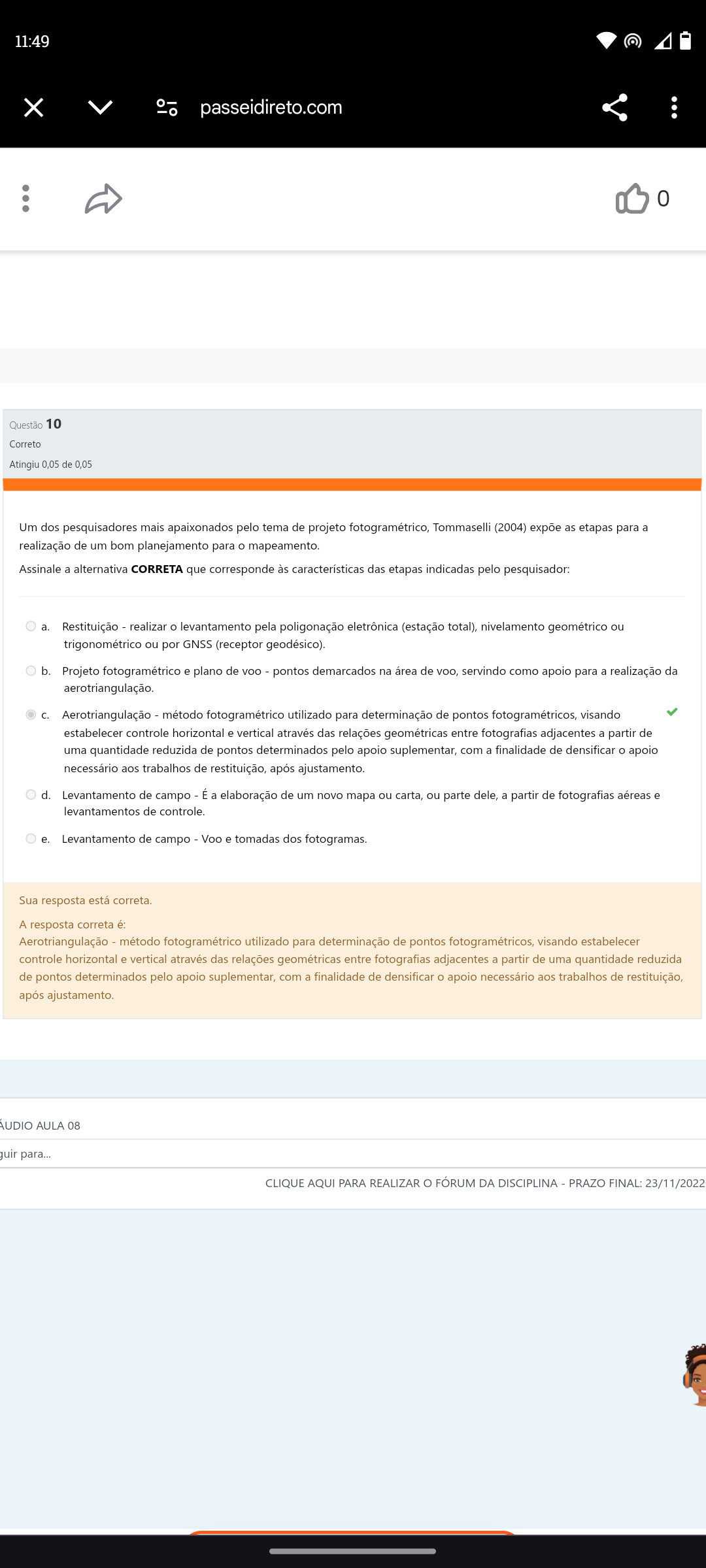 <p>11:49 X V passeidireto.com 0 Questão 10 Correto Atingiu 0.05 de 0,05 Um dos pesquisadores mais apaixonados pelo tema de projeto fotogramétrico, Tommaselli (2004) expõe as etapas para a realização de um bom planejamento para mapeamento. Assinale a alternativa CORRETA que corresponde às características das etapas indicadas pelo pesquisador: a. Restituição realizar o levantamento pela poligonação eletrônica (estação total), nivelamento geométrico ou trigonométrico ou por GNSS (receptor geodésico). b. Projeto fotogramétrico e plano de voo - pontos demarcados na área de voo, servindo como apoio para a realização da aerotriangulação. Aerotriangulação - método fotogramétrico utilizado para determinação de pontos fotogramétricos, visando estabelecer controle horizontal e vertical através das relações geométricas entre fotografias adjacentes a partir de uma quantidade reduzida de pontos determinados pelo apoio suplementar, com a finalidade de densificar o apoio necessário aos trabalhos de restituição, após ajustamento. d. Levantamento de campo É a elaboração de um novo mapa ou carta, ou parte dele, a partir de fotografias aéreas e levantamentos de controle. e. Levantamento de campo Voo e tomadas dos fotogramas. Sua resposta está correta. A resposta correta é: Aerotriangulação - método fotogramétrico utilizado para determinação de pontos fotogramétricos, visando estabelecer controle horizontal e vertical através das relações geométricas entre fotografias adjacentes a partir de uma quantidade reduzida de pontos determinados pelo apoio suplementar, com a finalidade de densificar o apoio necessário aos trabalhos de restituição, após ajustamento. AUDIO AULA 08 quir para.. CLIQUE AQUI PARA REALIZAR FÓRUM DA DISCIPLINA - PRAZO FINAL: 23/11/2022</p>