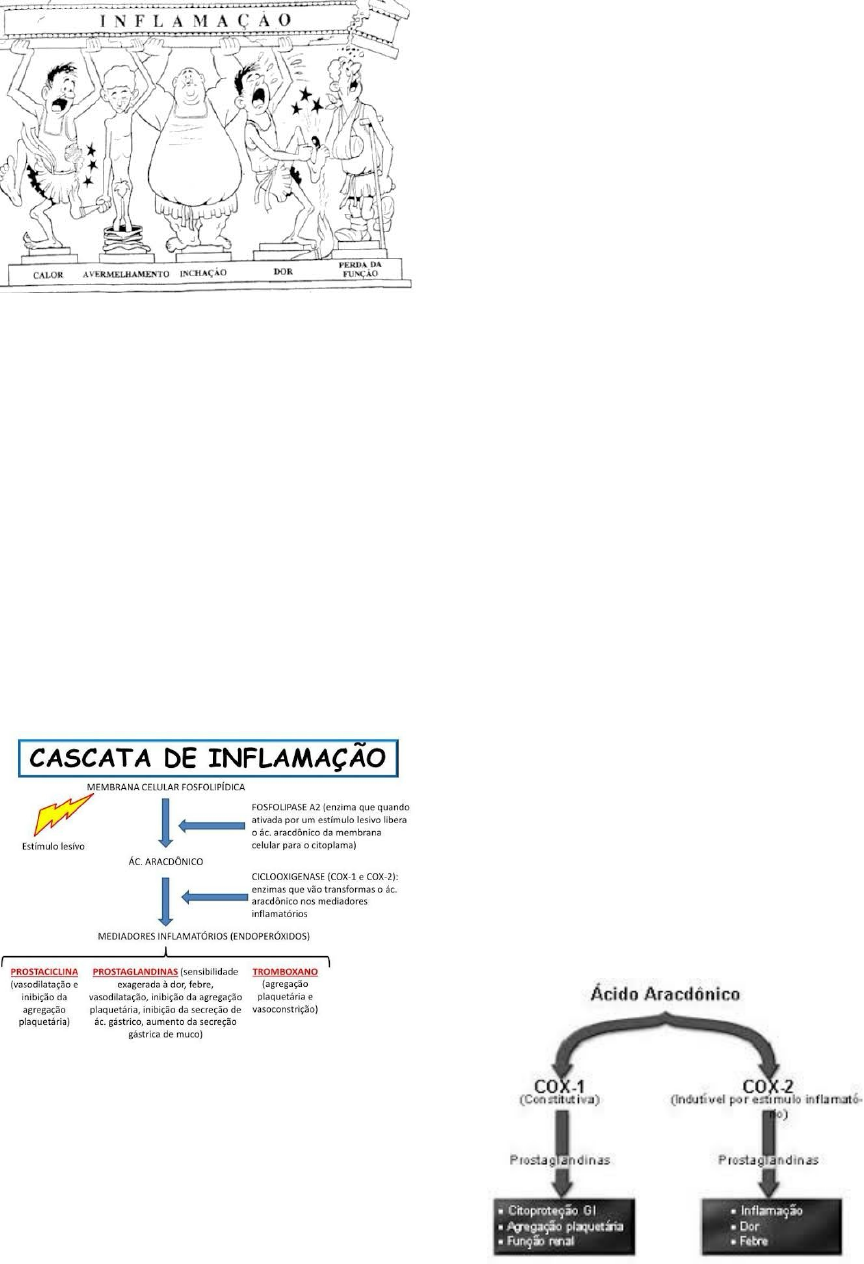 <p>Terapêutica 02/10</p><p>· Dor e Inflação:</p><p>· Mediadores inflamatórios:</p><p>· Liberados durante o processo inflamatório;</p><p>· Derivados das células e do fluido que atinge o local de lesão tissular;</p><p>· Os leucócitos constituem a maior fonte de mediadores;</p><p>· O controle farmacológico da inflamação origina-se no sentido de evitar a liberação de mediadores;</p><p>· Inibir suas ações.</p><p>· Anti inflamatórios não esteroidais:</p><p>· Gastrite > passa para úlcera gástrica se não tratada;</p><p>· Em bovinos: no abomaso;</p><p>· Dor, diarreia, vômito</p><p>· Características dos AINES:</p><p>· Drogas que inibem uma ou mais etapa do metabolismo do ácido araquidônico;</p><p>· Podem ter seu efeito periférico - ação anti-inflamatória, analgésica, anti trombótica e anti endotóxica;</p><p>· Pode ainda ter um efeito sobre o SNC - ação antipirética e analgésica;</p><p>· Tem seu maior efeito sobre a dor somática (ME) do que sobre a dor visceral;</p><p>· Só são eficazes nas dores potencializadas pela presença de PGE, ou seja, aquelas associadas a inflamação;</p><p>· Tem como vantagem não produzir sedação, ataxia, causar rápida recuperação, além de não causar dependência;</p><p>· Os AINES são ácidos fracos;</p><p>· Grande afinidade locais por inflamados (</p>