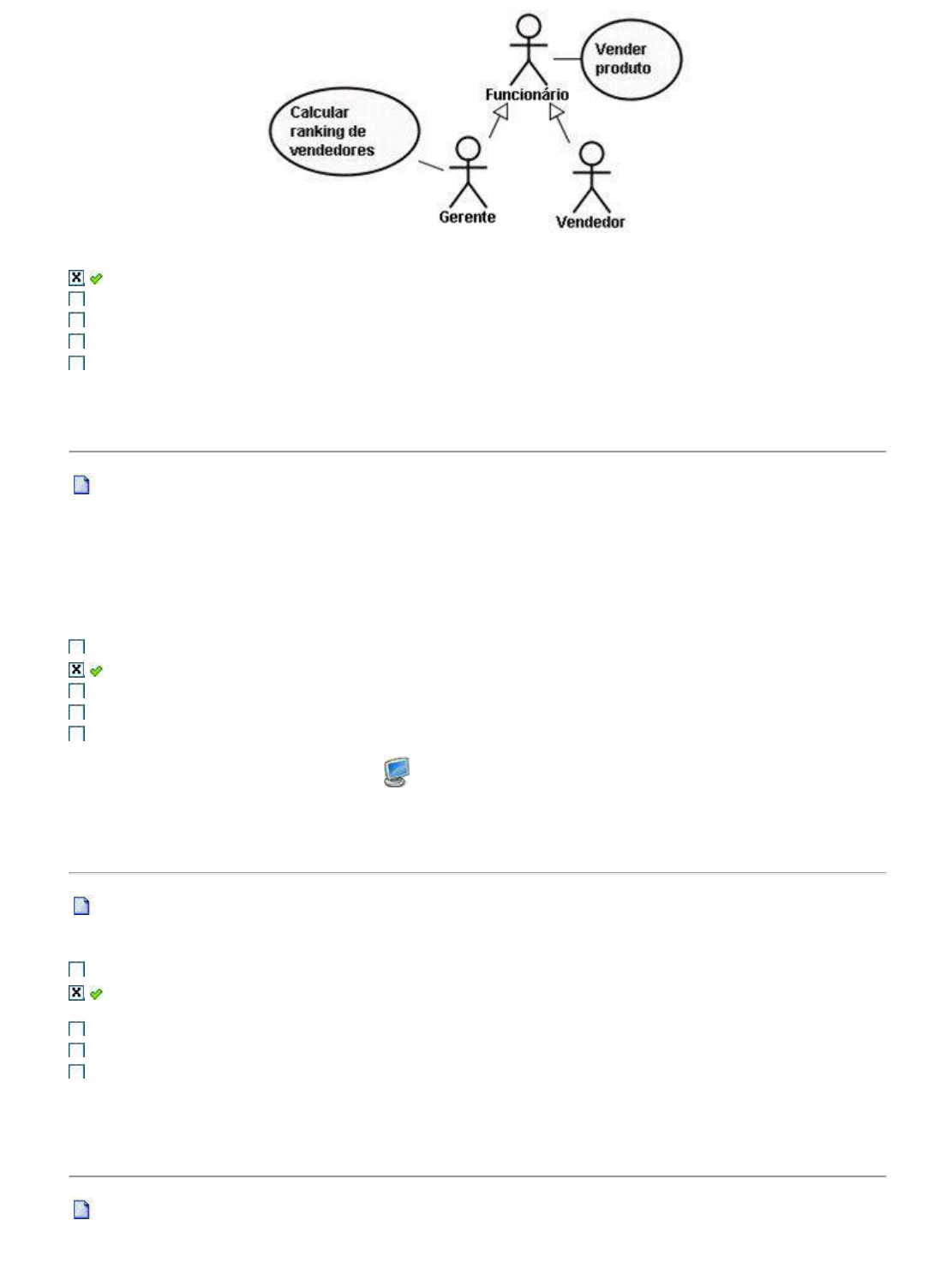 <p>Vendedor não pode realizar nenhum caso de uso.</p><p>Caso de uso "Calcular ranking de vendedores" pode ser realizado somente por Gerente.</p><p>Caso de uso "Vender produto" pode ser realizado tanto por Gerente quanto por Vendedor.</p><p>Gerente pode realizar tanto o caso de uso "Vender produto" quanto o "Calcular ranking de vendedores".</p><p>A representação é denominada de Generalização de Ator.</p><p>5a Questão (Ref.: 200807104173) Pontos: 1,0 / 1,0</p><p>Analisando o estudo de caso abaixo, marque a alternativa que indica o conceito empregado às informações</p><p>Nome e Estado de saúde.</p><p>"Um paciente se dirige a um posto de saúde e apresenta seu nome: "José da Silva" e descreve seu estado de</p><p>saúde: "Febre de 40º". O atendente anota o nome e o estado de saúde em uma ficha e o encaminha para o</p><p>médico, que o atende e registra na ficha os procedimentos adotados. No final do mês o médico contabiliza o</p><p>total de pacientes por queixa apresentada."</p><p>Objeto.</p><p>Atributo.</p><p>Associação.</p><p>Generalização.</p><p>Classe.</p><p>Gabarito Comentado.</p><p>6a Questão (Ref.: 200807104162) Pontos: 1,0 / 1,0</p><p>Marque a alternativa correta que define C lasse na modelagem orientada a objetos.</p><p>É a conexão física ou conceitual entre instâncias de objetos.</p><p>Descreve um grupo de objetos com propriedades semelhantes (atributos), o mesmo comportamento</p><p>(operações) e conseqüentemente a mesma semântica (Rumbaugh, 1994).</p><p>Descreve um conjunto de ligação com estrutura e semântica comuns.</p><p>É uma propriedade das ligações de uma associação.</p><p>É um conceito, uma abstração, algo com limites nítidos e significado em relação à realidade estudada</p><p>(Rumbaugh, 1994).</p><p>7a Questão (Ref.: 200807091305) Pontos: 1,0 / 1,0</p><p>No processo de desenvolvimento de software, todo software passa pelas fases de análise e projeto, associadas,</p><p>respectivamente, com o que deve ser feito e como deve ser feito. A partir dessa informação, avalie a opções</p><p>correta: (QUESTÃO 74 - ENADE 2008)</p><p>Na fase de projeto, dois níveis de projeto devem ser considerados: o projeto detalhado, que se</p><p>preocupa com uma transformação dos requisitos em um projeto de dados e arquitetural; e o projeto</p><p>preliminar, que se preocupa em aprimorar o projeto detalhado para que a implementação possa ser</p><p>realizada em seguida.</p><p>Na fase de análise, três modelos que devem ser considerados são: do domínio da informação, o</p><p>funcional e o comportamental.</p><p>O projeto arquitetural independe do paradigma de desenvolvimento.</p><p>Para lidar com a complexidade do software, pode-se aplicar o princípio do particionamento, quebrando o</p><p>problema em problemas menores. Esse princípio não é aplicado nas outras fases de desenvolvimento e</p><p>ele não causa impacto nos custos de desenvolvimento.</p><p>O objetivo do projeto arquitetural é desenvolver uma estrutura de programa e representar os diversos</p><p>fluxos de dados entre os módulos.</p><p>8a Questão (Ref.: 200807125543) Pontos: 0,0 / 1,0</p><p>Como parte das atividades para análise de requisitos temos o estudo de viabilidade, que é dividida em quatro</p><p>tipos, são elas:</p><p>Organizacional, Funcional, Financeira e de Requisitos</p><p>Organizacional, Operaciaonal, Funcional e Econômica</p><p>Técnica, Operaciaonal, Cronograma e Econômica</p><p>Técnica, Operaciaonal, Cronograma e Organizacional</p><p>Técnica, Funcional, Cronograma e Econômica</p><p>Gabarito Comentado.</p><p>9a Questão (Ref.: 200807129961)</p><p>Desenvolver software com qualidade é?</p><p>Sua Resposta: É realizar a entrega dentro do que foi planejado no escopo do projeto de software atendendo aos</p><p>prazos e custos.</p><p>Compare com a sua resposta: Utilizar um processo para construção de um produto de software primando por</p><p>todas as fases que envolvem essa atividade.</p><p>10a Questão (Ref.: 200807129960)</p><p>O que é desenvolver Adhoc?</p><p>Sua Resposta: É o desenvolvimento voltado para designar ciclos completos de construção de softwares que não</p><p>foram devidamente projectados em razão da necessidade de atender a uma demanda específica do usuário,</p><p>ligada a prazo, qualidade ou custo.</p><p>Compare com a sua resposta: Desenvolvimento sob demanda.</p><p>Voltar</p><p>Avaliação: CCT0194_AV_201202103961 » PROCESSOS DE DESENVOLVIMENTO DE SOFTWARE</p><p>Tipo de Avaliação: AV</p><p>Aluno:</p><p>Professor:</p><p>Turma:</p><p>Nota da Prova: 7,5 Nota de Partic.: 2 Data: 10/06/2014 07:25:54</p><p>1a Questão (Ref.: 201202172911) Pontos: 1,5 / 1,5</p><p>O que é desenvolver Adhoc?</p><p>Resposta: Desenvolvimento sob demanda.</p><p>Gabarito: Desenvolvimento sob demanda.</p><p>2a Questão (Ref.: 201202211529) Pontos: 1,5 / 1,5</p><p>O ciclo de vida tradicional de desenvolvimento de software compreende em geral as seguintes fases:</p><p>especificação de requisitos, análise, projeto, implementação e testes.</p><p>Descreva o objetivo de cada uma destas fases.</p><p>Resposta: Especificação de requisitos: Se resume em conhecer até mesmo em linguagem formal os problema</p><p>do cotidiano da empresa com base em informações que a mesma trabalha, verifica-se todas as viabilidades do</p><p>desenvolvimento do software: Viabilidade técnica, operacional, cronograma e economica. Análise:</p><p>Levantamento de problemas, por exemplo: Visita inlocco. Projeto: Desenvolvimento do projeto, já com SGBD,</p><p>interface e linguagem de programação definida. Implementação: Feita após cada finalização de cada parte do</p><p>sistema para validação do cliente, é verificado se esta nova parte atende a necessidade docliente e a</p><p>familiaridade com o mesmo. Testes: São feitos testes dos processos do software para encontrar possíveis bugs</p><p>no sistema.</p><p>Gabarito: A fase de especificação de requisitos é responsável por 