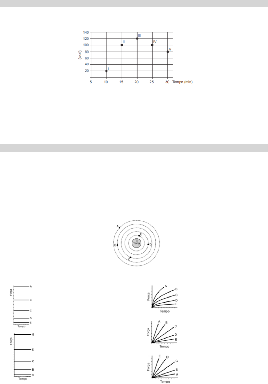 <p>QUESTÃO 9</p><p>Os exercícios físicos são recomendados para o bom funcionamento do organismo, pois aceleram o metabolismo e, em</p><p>consequência, elevam o consumo de calorias. No gráfico, estão registrados os valores calóricos, em kcal, gastos em</p><p>cinco diferentes atividades físicas, em função do tempo dedicado às atividades, contado em minuto.</p><p>Qual dessas atividades físicas proporciona o maior consumo de quilocalorias por minuto?</p><p>A I</p><p>B II</p><p>C III</p><p>D IV</p><p>E V</p><p>QUESTÃO 10</p><p>A Lei da Gravitação Universal, de Isaac Newton, estabelece a intensidade da força de atração entre duas massas. Ela</p><p>é representada pela expressão:</p><p>onde m1 e m2 correspondem às massas dos corpos, d à distância entre eles, G à constante universal da gravitação e</p><p>F à força que um corpo exerce sobre o outro.</p><p>O esquema representa as trajetórias circulares de cinco satélites, de mesma massa, orbitando a Terra.</p><p>Qual gráfico expressa as intensidades das forças que a Terra exerce sobre cada satélite em função do tempo?</p><p>A</p><p>B</p><p>C</p><p>D</p><p>E</p><p>F G</p><p>d</p><p>m m1 2</p><p>2=</p><p>QUESTÃO 11</p><p>O cruzamento da quantidade de horas estudadas com o desempenho no Programa Internacional de Avaliação de</p><p>Estudantes (Pisa) mostra que mais tempo na escola não é garantia de nota acima da média.</p><p>Dos países com notas abaixo da média nesse exame, aquele que apresenta maior quantidade de horas de estudo é</p><p>A Finlândia</p><p>B Holanda</p><p>C Israel</p><p>D México</p><p>E Rússia</p><p>QUESTÃO 12</p><p>Um investidor inicia um dia com x ações de uma empresa. No decorrer desse dia, ele efetua apenas dois tipos de</p><p>operações, comprar ou vender ações. Para realizar essas operações, ele segue estes critérios:</p><p>I. vende metade das ações que possui, assim que seu valor fica acima do valor ideal (Vi);</p><p>II. compra a mesma quantidade de ações que possui, assim que seu valor fica abaixo do valor mínimo (Vm);</p><p>III. vende todas as ações que possui, quando seu valor fica acima do valor ótimo (Vo).</p><p>O gráfico apresenta o período de operações e a variação do valor de cada ação, em reais, no decorrer daquele dia e a</p><p>indicação dos valores ideal, mínimo e ótimo.</p><p>Quantas operações o investidor fez naquele dia?</p><p>A 3</p><p>B 4</p><p>C 5</p><p>D 6</p><p>E 7</p><p>Gabarito interpretação</p><p>de gráficos</p><p>1 B</p><p>2 B</p><p>3 D</p><p>4 E</p><p>5 B</p><p>6 B</p><p>7 D</p><p>8 D</p><p>9 B</p><p>10 B</p><p>11 C</p><p>12 B</p><p>13 A</p><p>QUESTÃO 13</p><p>Um dos grandes desafios do Brasil é o gerenciamento dos seus recursos naturais, sobretudo os recursos hídricos.</p><p>Existe uma demanda crescente por água e o risco de racionamento não pode ser descartado. O nível de água de um</p><p>reservatório foi monitorado por um período, sendo o resultado mostrado no gráfico. Suponha que essa tendência linear</p><p>observada no monitoramento se prolongue pelos próximos meses.</p><p>Nas condições dadas, qual o tempo mínimo, após o sexto mês, para que o reservatório atinja o nível zero de sua</p><p>capacidade?</p><p>A 2 meses e meio.</p><p>B 3 meses e meio.</p><p>C 1 mês e meio.</p><p>D 4 meses.</p><p>E 1 mês.</p>