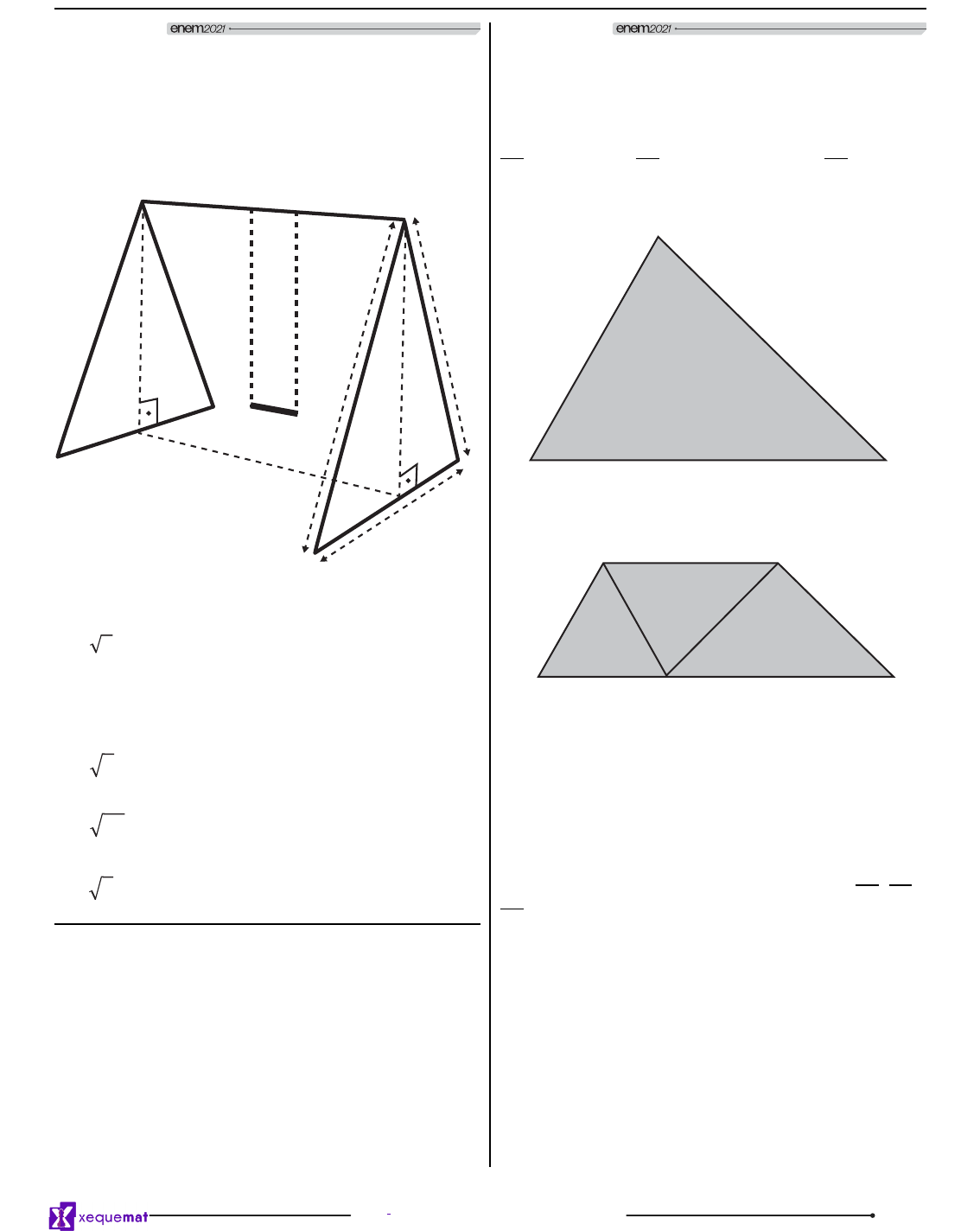 <p>enem2024</p><p>xequemat enem</p><p>8CN • 2º DIA • CADERNO 1 • xequemat enem • ROXO</p><p>20 MT - 2° dia | Caderno 7 - AZUL - 2ª Aplicação</p><p>*020325AZ20*</p><p>Questão 153</p><p>Um brinquedo muito comum em parques de</p><p>�����������������������������������������������������</p><p>�����������������������������������������������������</p><p>uso. Cada uma das correntes que o sustenta tem medida</p><p>do comprimento, em metro, indicada por x. A estrutura do</p><p>balanço é feita com barras de ferro, nas dimensões, em</p><p>������������������������</p><p>0,</p><p>5</p><p>m</p><p>3 m</p><p>2 m</p><p>3 m</p><p>x</p><p>Nessas condições, o valor, em metro, de x é igual a</p><p>A 2� 0,5</p><p>B 1,5</p><p>C 8� 0,5</p><p>D 10� 0,5</p><p>E 8</p><p>Questão 154</p><p>Uma indústria recortou uma placa de metal no</p><p>formato triangular ABC, conforme Figura 1, com lados</p><p>18, 14 e 12 cm.</p><p>Posteriormente, a peça triangular ABC foi dobrada,</p><p>de tal maneira que o vértice B� ������������� ���������</p><p>AC, e o segmento DE�����������������������AC, conforme</p><p>Figura 2.</p><p>A C</p><p>B</p><p>Figura 1</p><p>A</p><p>C</p><p>D E</p><p>B</p><p>Figura 2</p><p>�������������������������������������� é menor que</p><p>o ângulo CÂB e este é menor que o ângulo AB̂ C, e que</p><p>os cortes e dobraduras foram executados corretamente</p><p>pelas máquinas.</p><p>Nessas condições, qual é o valor da soma dos</p><p>comprimentos, em centímetro, dos segmentos DB, BE e</p><p>EC?</p><p>A 19</p><p>B 20</p><p>C 21</p><p>D 23</p><p>E 24</p><p>Azul CN MT 2 Dia P2.indb 20 10/09/2021 10:11:17</p><p>enem2024</p><p>xequemat enem</p><p>9CN • 2º DIA • CADERNO 1 • xequemat enem • ROXO</p><p>21MT - 2° dia | Caderno 7 - AZUL - 2ª Aplicação</p><p>*020325AZ21*</p><p>Questão 155</p><p>���������������������������������������������������</p><p>������������� ��������������� ������������������������</p><p>��������� �� ������� ��� ����������� ��� ��� ������������ ����</p><p>������������������������������������� �����������������</p><p>��������������������������������������������������������</p><p>������������������������������������������������������</p><p>pontos A e B.</p><p>°D (Delisle)</p><p>°C (Celsius)</p><p>150</p><p>100</p><p>A</p><p>B</p><p>0</p><p>�����������������������������������������������������������</p><p>��������������������������������������������������������</p><p>duas escalas?</p><p>A 2D � C � 100</p><p>B 2D � 3C � 150</p><p>C 3D � 2C � 300</p><p>D 2D � 3C � 300</p><p>E 3D � 2C � 450</p><p>Questão 156</p><p>Uma fórmula para calcular o Índice de Massa</p><p>Corporal (IMC) foi publicada pelo Departamento de</p><p>��������� ��� ������������� ��� ���� ������� �� �������</p><p>������� ���� �������� ������ ��� ����������� ��� �������</p><p>magros que, apesar de exibirem uma silhueta esguia,</p><p>apresentam altos níveis de gordura, e os falsos gordos,</p><p>que têm um IMC alto em decorrência de ganho de</p><p>���������������������������������</p><p>��������������������������������������������������</p><p>peso e da estatura. A fórmula é expressa pela soma do</p><p>triplo da massa (M), em quilograma, com o quádruplo do</p><p>percentual de gordura (G), tudo dividido pela altura (H),</p><p>em centímetro.</p><p>��������������������������������������������������������������������������������</p><p>�������������������������������������������������������</p><p>calcular o IMC é dada por</p><p>A �� � ��</p><p>�</p><p>B �� � ��</p><p>�</p><p>C</p><p>�</p><p>� ��� �</p><p>� � �</p><p>�</p><p>D � � � � ��</p><p>�</p><p>E � � �� � �</p><p>�</p><p>Questão 157</p><p>Um diretor esportivo organiza um campeonato no qual</p><p>haverá disputa de times em turno e returno, isto é, cada</p><p>time jogará duas vezes com todos os outros, totalizando</p><p>380 partidas a serem disputadas.</p><p>A quantidade de times (x) que faz parte desse campeonato</p><p>��������