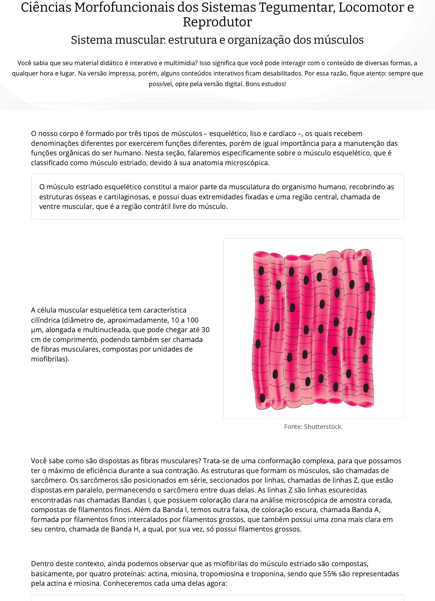 <p>O nosso corpo é formado por três tipos de músculos – esquelético, liso e cardíaco –, os quais recebem</p><p>denominações diferentes por exercerem funções diferentes, porém de igual importância para a manutenção das</p><p>funções orgânicas do ser humano. Nesta seção, falaremos especi�camente sobre o músculo esquelético, que é</p><p>classi�cado como músculo estriado, devido à sua anatomia microscópica.</p><p>O músculo estriado esquelético constitui a maior parte da musculatura do organismo humano, recobrindo as</p><p>estruturas ósseas e cartilaginosas, e possui duas extremidades �xadas e uma região central, chamada de</p><p>ventre muscular, que é a região contrátil livre do músculo.</p><p>A célula muscular esquelética tem característica</p><p>cilíndrica (diâmetro de, aproximadamente, 10 a 100</p><p>µm, alongada e multinucleada, que pode chegar até 30</p><p>cm de comprimento, podendo também ser chamada</p><p>de �bras musculares, compostas por unidades de</p><p>mio�brilas).</p><p>Fonte: Shutterstock.</p><p>Você sabe como são dispostas as �bras musculares? Trata-se de uma conformação complexa, para que possamos</p><p>ter o máximo de e�ciência durante a sua contração. As estruturas que formam os músculos, são chamadas de</p><p>sarcômero. Os sarcômeros são posicionados em série, seccionados por linhas, chamadas de linhas Z, que estão</p><p>dispostas em paralelo, permanecendo o sarcômero entre duas delas. As linhas Z são linhas escurecidas</p><p>encontradas nas chamadas Bandas I, que possuem coloração clara na análise microscópica de amostra corada,</p><p>compostas de �lamentos �nos. Além da Banda I, temos outra faixa, de coloração escura, chamada Banda A,</p><p>formada por �lamentos �nos intercalados por �lamentos grossos, que também possui uma zona mais clara em</p><p>seu centro, chamada de Banda H, a qual, por sua vez, só possui �lamentos grossos.</p><p>Dentro deste contexto, ainda podemos observar que as mio�brilas do músculo estriado são compostas,</p><p>basicamente, por quatro proteínas: actina, miosina, tropomiosina e troponina, sendo que 55% são representadas</p><p>pela actina e miosina. Conheceremos cada uma delas agora:</p><p>Ciências Morfofuncionais dos Sistemas Tegumentar, Locomotor e</p><p>Reprodutor</p><p>Sistema muscular: estrutura e organização dos músculos</p><p>Você sabia que seu material didático é interativo e multimídia? Isso signi�ca que você pode interagir com o conteúdo de diversas formas, a</p><p>qualquer hora e lugar. Na versão impressa, porém, alguns conteúdos interativos �cam desabilitados. Por essa razão, �que atento: sempre que</p><p>possível, opte pela versão digital. Bons estudos!</p><p>Actina</p><p>Sua estrutura é formada por uma dupla hélice de duas cadeias de monômeros globulares, torcidas uma</p><p>sobre a outra, de comprimento assimétrico. Após serem polimerizadas, a actina que era chamada de actina G</p><p>torna-se a actina F, tornando um �lamento único.</p><p>Tropomiosina</p><p>Uma molécula de tropomiosina tem sua estrutura longa e �na e se estende por sete monômeros de actina. É</p><p>constituída por duas cadeias polipeptídicas enroladas entre si, que se ligam à actina através de sulcos</p><p>existentes entre seus �lamentos.</p><p>Troponina</p><p>Trata-se da estrutura que se ligará à tropomiosina através de três subunidades: TnT (possui atração pela</p><p>tropomiosina), TnC (possui atração pelos íons de Ca2+) e TnI (possui atração pela actina, inibindo sua ligação</p><p>à miosina).</p><p>Miosina II</p><p>Formada por duas cadeias em hélice, tem formato de bastão, com uma extremidade �nalizada com uma</p><p>saliência globular, responsável pela combinação com a adenosina trifostato (ATP). Para que ocorra a</p><p>contração, é necessária a utilização de energia proveniente desta molécula de ATP, que, ao ser hidrolisada,</p><p>permite a ligação da miosina com actina.</p><p>Contração do músculo estriado</p><p>esquelético</p><p>Sempre que ocorre a contração muscular de um</p><p>determinado músculo, a principal alteração é o</p><p>comprimento dele, porém não são observadas</p><p>mudanças nos mio�lamentos. O que proporcina a</p><p>redução do comprimento muscular é o deslizamento</p><p>da actina e da miosina, uma sob a outra, em diração ao</p><p>centro do sarcômero.</p><p>Em resumo, a redução de comprimento ocorre no</p><p>sarcômero, e não nos �lamentos de actina e</p><p>miosina em si, e todo esse processo envolve</p><p>diversas etapas, as quais devem ser</p><p>compreendidas para que possamos também</p><p>entender a �siopatologia de diversas doenças</p><p>neuromusculares.</p><p>A junção neuromuscular é considerada uma sinapse especí�ca do neurônio motor com uma célula</p><p>musculoesquelética, na qual o neurônio é ativado para a realização da contração muscular, ou seja, é o espaço</p><p>compreendido entre o neurônio e a célula muscular, onde os neurotransmissores e as enzimas</p><p>acetilcolinesterases são liberados.</p><p>Podemos entender que o processo de contração</p><p>muscular ocorre em passos que envolvem todos os</p><p>aspectos descritos nesta webaula, sempre de forma</p><p>rápida e dependente de toda uma �siologia celular.</p><p>Dentro deste contexto, conseguimos</p><p>compreender a �siologia da contração muscular,</p><p>quais os processos envolvidos e, é claro, realizar a</p><p>aplicação da teoria nas patologias que</p><p>apresentam disfunções na contração muscular.</p>