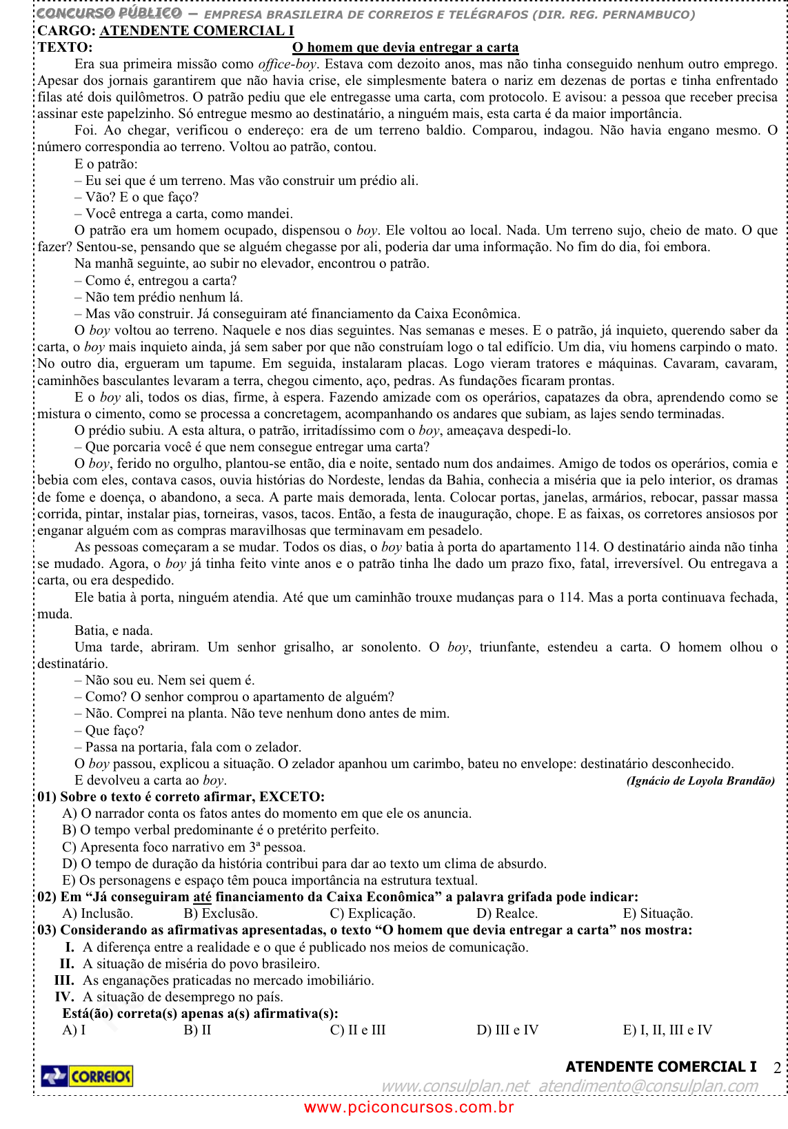 <p>pcimarkpci MDAwMDowMDAwOjAwMDA6MDAwMDowMDAwOmZmZmY6YjM2YzpkYTU5:VHVlLCAyNyBBdWcgMjAyNCAxODo1MDoyNiAtMDMwMA==</p><p>www.pciconcursos.com.br</p><p>CCCOOONNNCCCUUURRRSSSOOO PPPÚÚÚBBBLLLIIICCCOOO EMPRESA BRASILEIRA DE CORREIOS E TELÉGRAFOS (DIR. REG. PERNAMBUCO)</p><p>ATENDENTE COMERCIAL I</p><p>www.consulplan.net atendimento@consulplan.com</p><p>2</p><p>CARGO: ATENDENTE COMERCIAL I</p><p>TEXTO: O homem que devia entregar a carta</p><p>Era sua primeira missão como office-boy. Estava com dezoito anos, mas não tinha conseguido nenhum outro emprego.</p><p>Apesar dos jornais garantirem que não havia crise, ele simplesmente batera o nariz em dezenas de portas e tinha enfrentado</p><p>filas até dois quilômetros. O patrão pediu que ele entregasse uma carta, com protocolo. E avisou: a pessoa que receber precisa</p><p>assinar este papelzinho. Só entregue mesmo ao destinatário, a ninguém mais, esta carta é da maior importância.</p><p>Foi. Ao chegar, verificou o endereço: era de um terreno baldio. Comparou, indagou. Não havia engano mesmo. O</p><p>número correspondia ao terreno. Voltou ao patrão, contou.</p><p>E o patrão:</p><p>– Eu sei que é um terreno. Mas vão construir um prédio ali.</p><p>– Vão? E o que faço?</p><p>– Você entrega a carta, como mandei.</p><p>O patrão era um homem ocupado, dispensou o boy. Ele voltou ao local. Nada. Um terreno sujo, cheio de mato. O que</p><p>fazer? Sentou-se, pensando que se alguém chegasse por ali, poderia dar uma informação. No fim do dia, foi embora.</p><p>Na manhã seguinte, ao subir no elevador, encontrou o patrão.</p><p>– Como é, entregou a carta?</p><p>– Não tem prédio nenhum lá.</p><p>– Mas vão construir. Já conseguiram até financiamento da Caixa Econômica.</p><p>O boy voltou ao terreno. Naquele e nos dias seguintes. Nas semanas e meses. E o patrão, já inquieto, querendo saber da</p><p>carta, o boy mais inquieto ainda, já sem saber por que não construíam logo o tal edifício. Um dia, viu homens carpindo o mato.</p><p>No outro dia, ergueram um tapume. Em seguida, instalaram placas. Logo vieram tratores e máquinas. Cavaram, cavaram,</p><p>caminhões basculantes levaram a terra, chegou cimento, aço, pedras. As fundações ficaram prontas.</p><p>E o boy ali, todos os dias, firme, à espera. Fazendo amizade com os operários, capatazes da obra, aprendendo como se</p><p>mistura o cimento, como se processa a concretagem, acompanhando os andares que subiam, as lajes sendo terminadas.</p><p>O prédio subiu. A esta altura, o patrão, irritadíssimo com o boy, ameaçava despedi-lo.</p><p>– Que porcaria você é que nem consegue entregar uma carta?</p><p>O boy, ferido no orgulho, plantou-se então, dia e noite, sentado num dos andaimes. Amigo de todos os operários, comia e</p><p>bebia com eles, contava casos, ouvia histórias do Nordeste, lendas da Bahia, conhecia a miséria que ia pelo interior, os dramas</p><p>de fome e doença, o abandono, a seca. A parte mais demorada, lenta. Colocar portas, janelas, armários, rebocar, passar massa</p><p>corrida, pintar, instalar pias, torneiras, vasos, tacos. Então, a festa de inauguração, chope. E as faixas, os corretores ansiosos por</p><p>enganar alguém com as compras maravilhosas que terminavam em pesadelo.</p><p>As pessoas começaram a se mudar. Todos os dias, o boy batia à porta do apartamento 114. O destinatário ainda não tinha</p><p>se mudado. Agora, o boy já tinha feito vinte anos e o patrão tinha lhe dado um prazo fixo, fatal, irreversível. Ou entregava a</p><p>carta, ou era despedido.</p><p>Ele batia à porta, ninguém atendia. Até que um caminhão trouxe mudanças para o 114. Mas a porta continuava fechada,</p><p>muda.</p><p>Batia, e nada.</p><p>Uma tarde, abriram. Um senhor grisalho, ar sonolento. O boy, triunfante, estendeu a carta. O homem olhou o</p><p>destinatário.</p><p>– Não sou eu. Nem sei quem é.</p><p>– Como? O senhor comprou o apartamento de alguém?</p><p>– Não. Comprei na planta. Não teve nenhum dono antes de mim.</p><p>– Que faço?</p><p>– Passa na portaria, fala com o zelador.</p><p>O boy passou, explicou a situação. O zelador apanhou um carimbo, bateu no envelope: destinatário desconhecido.</p><p>E devolveu a carta ao boy. (Ignácio de Loyola Brandão)</p><p>01) Sobre o texto é correto afirmar, EXCETO:</p><p>A) O narrador conta os fatos antes do momento em que ele os anuncia.</p><p>B) O tempo verbal predominante é o pretérito perfeito.</p><p>C) Apresenta foco narrativo em 3ª pessoa.</p><p>D) O tempo de duração da história contribui para dar ao texto um clima de absurdo.</p><p>E) Os personagens e espaço têm pouca importância na estrutura textual.</p><p>02) Em “Já conseguiram até financiamento da Caixa Econômica” a palavra grifada pode indicar:</p><p>A) Inclusão. B) Exclusão. C) Explicação. D) Realce. E) Situação.</p><p>03) Considerando as afirmativas apresentadas, o texto “O homem que devia entregar a carta” nos mostra:</p><p>I. A diferença entre a realidade e o que é publicado nos meios de comunicação.</p><p>II. A situação de miséria do povo brasileiro.</p><p>III. As enganações praticadas no mercado imobiliário.</p><p>IV. A situação de desemprego no país.</p><p>Está(ão) correta(s) apenas a(s) afirmativa(s):</p><p>A) I B) II C) II e III D) III e IV E) I, II, III e IV</p><p>www.pciconcursos.com.br</p><p>www.pciconcursos.com.br</p><p>pcimarkpci MDAwMDowMDAwOjAwMDA6MDAwMDowMDAwOmZmZmY6YjM2YzpkYTU5:VHVlLCAyNyBBdWcgMjAyNCAxODo1MDoyNiAtMDMwMA==</p><p>www.pciconcursos.com.br</p><p>CCCOOONNNCCCUUURRRSSSOOO PPPÚÚÚBBBLLLIIICCCOOO EMPRESA BRASILEIRA DE CORREIOS E TELÉGRAFOS (DIR. REG. PERNAMBUCO)</p><p>ATENDENTE COMERCIAL I</p><p>www.consulplan.net atendimento@consulplan.com</p><p>3</p><p>04) O texto “O homem que devia entregar a carta”, pode ser classificado como:</p><p>A) Argumentativo opinativo. D) Argumentativo polêmico.</p><p>B) Narrativo moralizante. E) Expositivo did