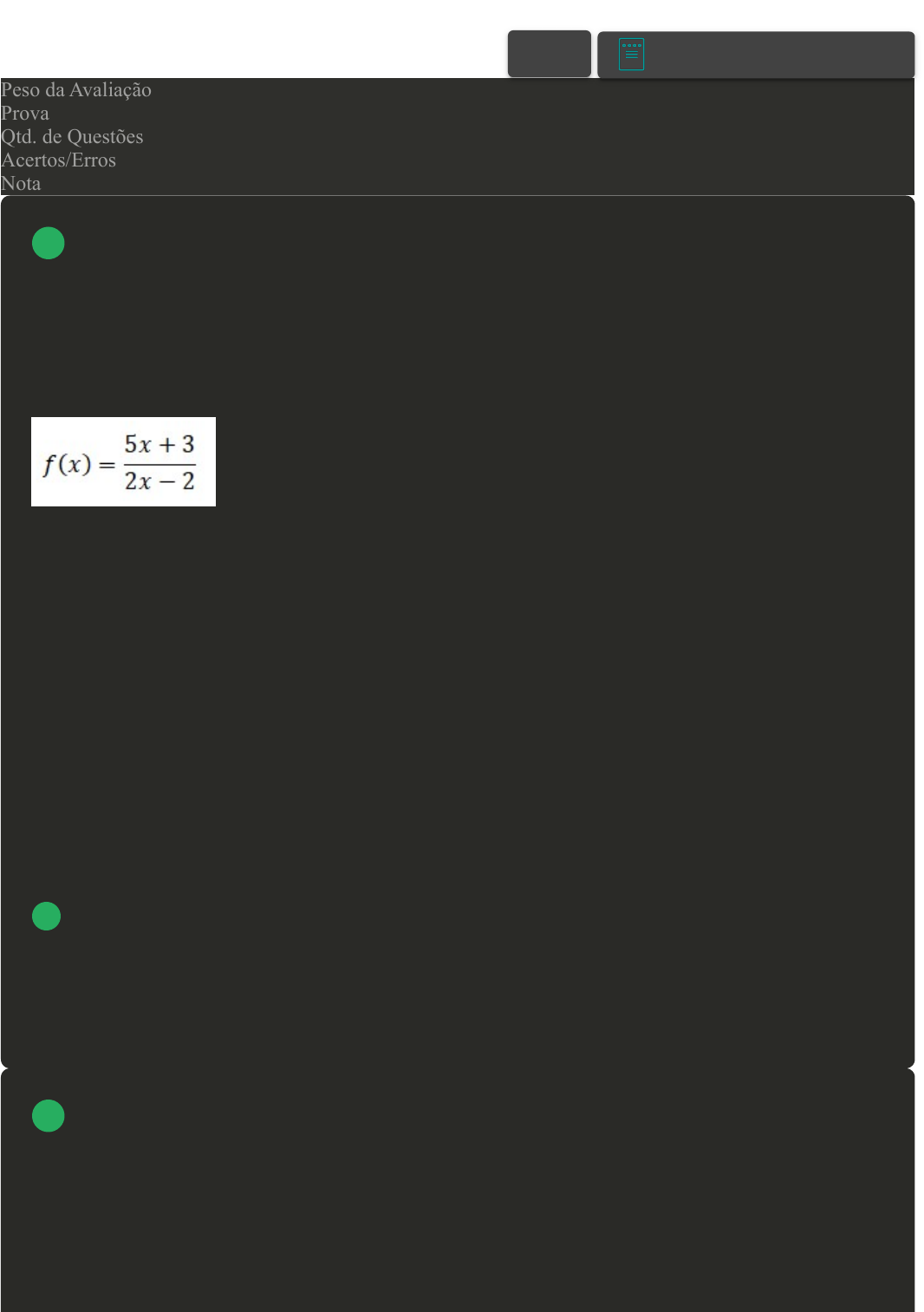 <p>Prova Impressa</p><p>GABARITO | Avaliação II - Individual (Cod.:986942)</p><p>Peso da Avaliação 2,00</p><p>Prova 89366353</p><p>Qtd. de Questões 10</p><p>Acertos/Erros 10/0</p><p>Nota 10,00</p><p>O conceito de limite é muito utilizado para analisar funções, principalmente quando a função não</p><p>pode ser calculada para algum valor de x. Nesta condição, ou fazemos uma manipulação na função ou</p><p>aplicamos os limites laterais e avaliamos o comportamento da função.</p><p>Dada a função:</p><p>Analise as afirmativas apresentadas a seguir:</p><p>I. O limite lateral à esquerda para x tendendo a 1 tem como resultado o número -397.</p><p>II. O limite lateral à direita para x tendendo a 1 tem como resultado ∞ (infinito positivo).</p><p>III. O limite da função para x tendendo a 1 é infinito positivo.</p><p>É correto o que se afirma em:</p><p>A II e III, apenas.</p><p>B I e II, apenas.</p><p>C II, apenas.</p><p>D I, II e III.</p><p>O princípio de Pascal que diz que uma variação da pressão aplicada a um fluido incompressível</p><p>contido em um recipiente é transmitida integralmente a todas as partes do fluido e às paredes do</p><p>recipiente.</p><p>VOLTAR</p><p>A+ Alterar modo de visualização</p><p>1</p><p>2</p><p>16/10/24, 09:59 Avaliação II - Individual</p><p>about:blank 1/6</p><p>Esse princípio se aplica ao funcionamento do sistema de freios a disco de um carro cuja força</p><p>aplicada a partir da pisada do freio ao êmbolo de um pistão de determinada área se multiplica no outro</p><p>pistão que pressiona a pastilha de freio contra um disco preso à roda do carro, fazendo o mesmo</p><p>diminuir sua velocidade.</p><p>Sob esse contexto, determine a relação entre a força aplicada pelo motorista e a força aplicada à</p><p>pastilha de freio, considerando o raio do segundo pistão duas vezes maior que o raio do primeiro:</p><p>A ½.</p><p>B 1.</p><p>C 2.</p><p>D ¼.</p><p>Um grupo de biólogos está estudando o desenvolvimento de uma determinada colônia de bactérias e</p><p>descobriu que sob condições ideais, o número de bactérias pode ser encontrado através da expressão</p><p>N(t) = 2000 . 20,5t, sendo t em horas.</p><p>Considerando essas condições, quanto tempo após o início da observação, o número de bactérias será</p><p>igual a 8192000?</p><p>A Após 24h.</p><p>B Após 12h.</p><p>C Após 18h</p><p>D Após 36h.</p><p>O custo médio de um determinado produto pode ser calculado dividindo-se a função pela quantidade</p><p>de produtos fabricados ou pela variável que representa esta quantidade.</p><p>Se a fabricação de peças automotivas de uma montadora apresentar como função custo médio a</p><p>seguinte expressão:</p><p>3</p><p>4</p><p>16/10/24, 09:59 Avaliação II - Individual</p><p>about:blank 2/6</p><p>Avalie o custo médio deste produto quando a produção for de uma grande quantidade de peças (x</p><p>tendendo a infinito) e assinale a alternativa com o valor deste custo m:</p><p>A R$ 1.300,00.</p><p>B R$ 46.300,00.</p><p>C R$ 45.000,00.</p><p>D R$ 1.800,00.</p><p>A produtividade de uma empresa pode ser determinada por meio de uma função de produção, P(x),</p><p>sendo x a mão de obra ou horas-máquina, por exemplo. Definida a função de produção, pode-se</p><p>determinar a produtividade marginal (Pmg), que é a derivada da função de produção, útil para</p><p>determinar o ganho de produtividade ao aumentar uma unidade de x.</p><p>Em uma empresa há duas máquinas que processam farinha de ossos, denominadas A e B, cujas</p><p>funções de produção são: P(x)A = 13,2x0,7e P(x)B = 7,5x0,8. Avalie a produtividade marginal de cada</p><p>uma destas máquinas, considerando x as horas de trabalho das máquinas e P(x) a produtividade em kg</p><p>de farinha de ossos. Para 1200h de trabalho das máquinas, assinale a alternativa que apresenta a</p><p>produtividade marginal de cada uma:</p><p>A Pmg(1200)A = 0,9 e Pmg(1200)B = 0,26.</p><p>B Pmg(1200)A = 1,10 e Pmg(1200)B = 1,45.</p><p>C Pmg(1200)A = 1,35 e Pmg(1200)B = 1,09.</p><p>D Pmg(1200)A = 0,09 e Pmg(1200)B = 0,026.</p><p>5</p><p>16/10/24, 09:59 Avaliação II - Individual</p><p>about:blank 3/6</p><p>Reconhecer os diferentes componentes elétricos existentes no mercado, bem como conhecer suas</p><p>características e o que as mesmas significam, é requisito para que se possa trabalhar com os mesmos</p><p>e, assim, usufruir de suas funcionalidades.</p><p>Sob esse contexto, estabeleça a correspondência entre cada componente e sua respectiva descrição:</p><p>I-</p><p>Capacitor.</p><p>II-</p><p>Resistor.</p><p>III-</p><p>Condutor.</p><p>( ) Objeto formado por um fio resistivo enrolado em um material não condutor como,</p><p>por exemplo, a cerâmica, e cuja característica indica a resistência ao movimento das</p><p>cargas elétricas.</p><p>( ) Objeto formado por dois condutores separados por um isolante ou imerso no vácuo e</p><p>cuja característica representa a medida da capacidade de armazenar carga elétrica e</p><p>energia potencial elétrica.</p><p>( ) Objeto, geralmente retilíneo, constituído de material pouco resistente à passagem da</p><p>corrente elétrica e cuja característica indica a facilidade para o movimento das cargas</p><p>elétricas.</p><p>A sequência correta dessa classificação é:</p><p>A II - III - I.</p><p>B II - I - III.</p><p>C III - I - II.</p><p>D I - II - III.</p><p>Do trapiche da vila do Mosqueiro, Maria observou um caboclo pescando em uma canoa.</p><p>A explicação para o fato de a canoa flutuar é que o empuxo recebido pela canoa é:</p><p>A igual ao volume deslocado</p><p>B maior que o peso da canoa</p><p>C menor que o peso da canoa</p><p>6</p><p>7</p><p>16/10/24, 09:59 Avaliação II - Individual</p><p>about:blank 4/6</p><p>D igual ao peso da canoa</p><p>Dada uma função f: A → B, com relação às propriedades de função, analise as afirmativas a seguir:</p><p>I. A função f é dita injetora quando cada ele