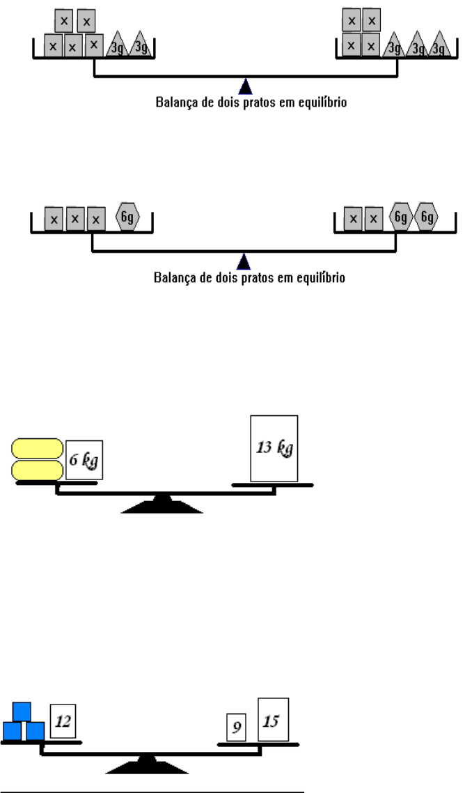 <p>Atividade de Matemática Equações</p><p>1°). Resolva as equações:</p><p>a)</p><p>b)</p><p>c)</p><p>d)</p><p>e)</p><p>f)</p><p>g)</p><p>h)</p><p>2°) Escreva a equação que relaciona os dois lados da balança e determine o valor do X.</p><p>a)</p><p>b)</p><p>3°) Em uma balança de dois pratos estão equilibrados dois queijos de pesos iguais e seis</p><p>quilos. No outro prato estão equilibrados 13 quilos. Qual é o peso dos dois queijos?</p><p>4°) Equilibre na balança em um dos pratos três pesos iguais desconhecidos mais sete quilos. No outro prato</p><p>equilibre 42 kg e 34 kg. Qual o peso de cada um dos pesos desconhecidos?</p><p>5°) Esta balança está equilibrada. Escreva a equação que corresponde a figurae encontre o valor de x.</p><p>6°). Observe as balanças; Qual é a equação do 1º grau que cada balança representa? Qual é o valor de ?</p><p>a)</p><p>b)</p><p>c)</p><p>d)</p><p>e)</p><p>f)</p><p>7°) Para cada item, escreva a equação do 1º grau que cada balança representa, determine o valor de x.</p><p>a)</p><p>c)</p><p>b) d)</p>