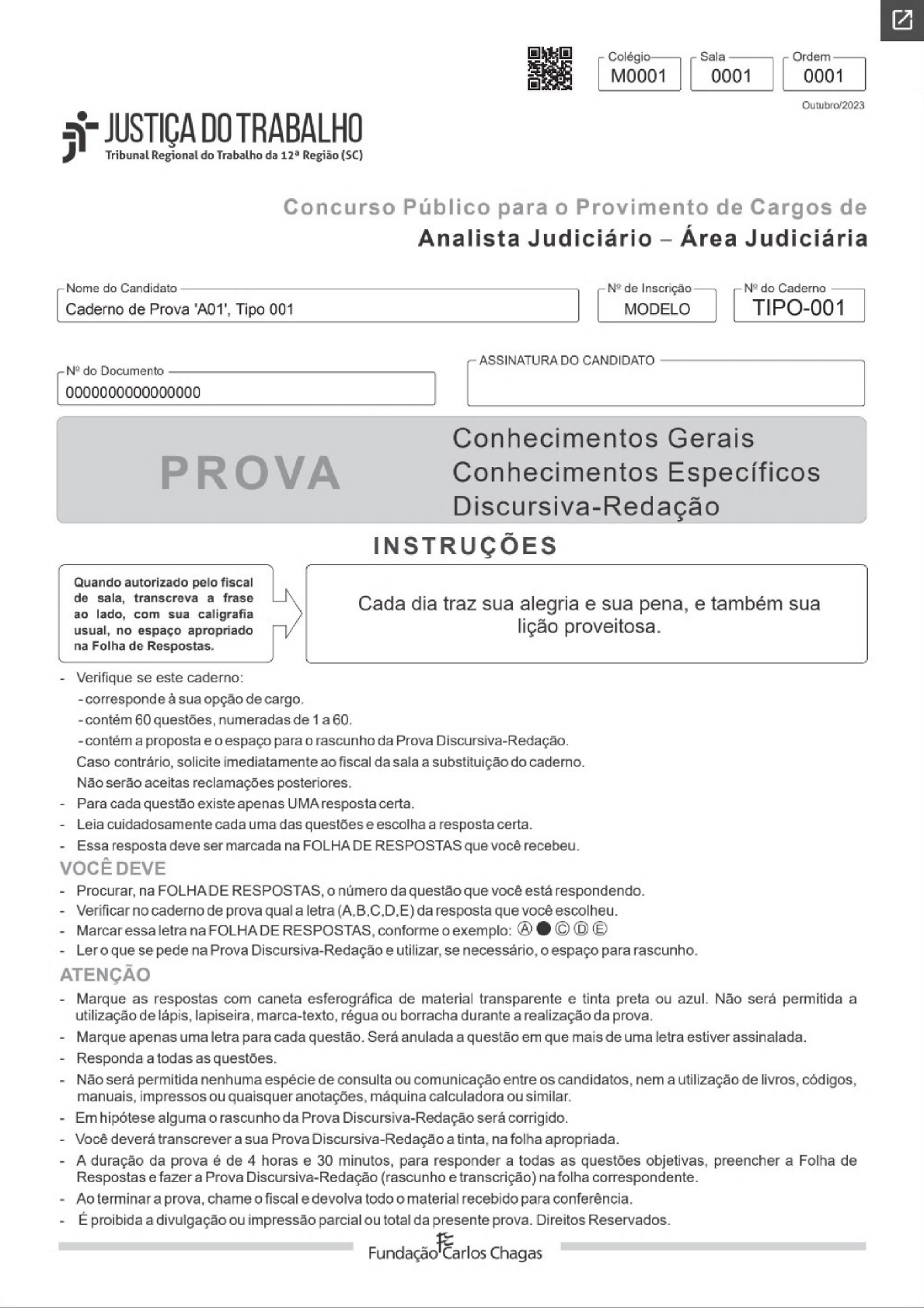 <p>[lhts[m] Colégio Sala Ordem</p><p>SRS | MO0O1 || 0001 || 0001</p><p>Outubro/2023</p><p>E = JUSTICA DO TRABALHO</p><p>Tribunal Regional do Trabalho da 12º Região (SC)</p><p>Concurso Público para o Provimento de Cargos de</p><p>Analista Judiciário - Área Judiciária</p><p>Nome do Candidato e de Inscrição E do Caderno</p><p>| Caderno de Prova 'AO1', Tipo 001 | | MODELO | | TIPO-001</p><p>E do Documento à</p><p>ASSINATURA DO CANDIDATO</p><p>0000000000000000 | |</p><p>Conhecimentos Gerais</p><p>[é R OVA Conhecimentos Específicos</p><p>Discursiva-Redação</p><p>INSTRUÇÕES</p><p>Quando autorizado pelo fiscal</p><p>do nata; tranecraia à frase Cada dia traz sua alegria e sua pena, e também sua</p><p>ao lado, com sua caligrafia</p><p>usual, no espaço apropriado lição proveitosa.</p><p>na Folha de Respostas.</p><p>- Verifique se este caderno:</p><p>- corresponde à sua opção de cargo.</p><p>- contém 60 questões, numeradas de 1 a 60.</p><p>- contém a proposta e 0 espaço para o rascunho da Prova Discursiva-Redação.</p><p>Caso contrário, solicite imediatamente ao fiscal da sala a substituição do caderno.</p><p>Não serão aceitas reclamações posteriores.</p><p>- Para cada questão existe apenas UMA resposta certa.</p><p>- Leia cuidadosamente cada uma das questões e escolha a resposta certa.</p><p>- Essaresposta deve ser marcada na FOLHA DE RESPOSTAS que você recebeu.</p><p>VOCÊ DEVE</p><p>Procurar, na FOLHADE RESPOSTAS, o número da questão que você está respondendo.</p><p>Verificar no caderno de prova quala letra (A,B,C,D,E) da resposta que você escolheu.</p><p>- Marcar essaletra na FOLHADE RESPOSTAS, conforme o exemplo: AO OD É</p><p>- Leroque se pede na Prova Discursiva-Redação e utilizar, se necessário, 0 espaço para rascunho.</p><p>ATENÇÃO</p><p>- Marque as respostas com caneta esferográfica de material transparente e tinta preta ou azul. Não será permitida a</p><p>utilização de lápis, lapiseira, marca-texto, rêgua ou borracha durante a realização da prova.</p><p>- Marque apenas uma letra para cada questão. Será anulada a questão em que mais de uma letra estiver assinalada.</p><p>- Responda a todas as questões.</p><p>- Não será permitida nenhuma espécie de consulta ou comunicação entre os candidatos, nem a utilização de livros, códigos,</p><p>manuais, impressos ou quaisquer anotações, máquina calculadora ou similar.</p><p>- Embhipótese alguma o rascunho da Prova Discursiva-Redação será corrigido.</p><p>- Você deverá transcrever a sua Prova Discursiva-Redação a tinta, na folha apropriada.</p><p>- À duração da prova é de 4 horas e 30 minutos, para responder a todas as questões objetivas, preencher a Folha de</p><p>Respostas e fazer a Prova Discursiva-Redação (rascunho e transcrição) na folha correspondente.</p><p>- Aoterminara prova, chame o fiscal e devolva todo o material recebido para conferência.</p><p>- Éproibidaa divulgação ou impressão parcial ou total da presente prova. Direitos Reservados.</p><p>FúindaçsolCarics Chagas</p><p>AM cagemo de Prova 'A0t!, Tipo 001</p><p>CONHECIMENTOS GERAIS</p><p>Língua Portuguesa</p><p>Atenção: Para responder às questões de números 1 a 5, baseie-se no texto abaixo.</p><p>O gavião</p><p>Gente olhando para o céu: não é mais disco voador. Disco voador perdeu o cartaz com tanto satélite beirando o sol e a lua.</p><p>Olhamos todos para o céu em busca de algo mais sensacional e comovente — o gavião malvado, que mata pombas.</p><p>Retornamos assim à contemplação de um drama bem antigo. e há o partido das pombas e o partido do gavião. Os pombistas</p><p>ou pombeiros (qualquer palavra é melhor que “columbófilo”) querem matar o gavião. Os amigos deste dizem que ele não é malvado;</p><p>na verdade come a sua pombinha com a mesma inocência com que a pomba come seu grão de milho.</p><p>Não tomarei partido: admiro a túrgida” inocência das pombas e também o lance magnífico em que o gavião se despenca sobre</p><p>uma delas. Comer pombas é, como diria Saint-Exupéry”, “a verdade do gavião”, mas matar um gavião no ar com um belo tiro pode</p><p>também ser a verdade do caçador.</p><p>Que o gavião mate a pomba e o homem mate alegremente o gavião; ao homem, se não houver outro bicho que o mate, pode</p><p>lhe suceder que ele encontre seu gavião em outro homem. A vida é rapina. A verdade é que não posso mais falar de aves: dei os meus</p><p>passarinhos. Perdi os cantos do meu canário e os assovios do meu sofré; meu coração está mais triste, mas está mais leve também.</p><p>* túrgida = intumescida, dilatada, cheia.</p><p>* Antoine de Saint-Exupéry, escritor francês.</p><p>(Adaptado de: BRAGA, Rubem. Ai de ti, Copacabana. Rio de Janeiro: Editora do Autor, 1960, p. 1683-164)</p><p>4. Ao tratar de gaviões e pombas, o autor do texto os vê</p><p>(A) no contexto de uma disputa natural cujo resultado previsível lhe parece injustificável.</p><p>(B) como elementos de uma aguda polarização que se manifesta em seus observadores.</p><p>(C) na condição de agentes de uma mesma violência que tem partidários de ambos os lados.</p><p>(D) como personagens rivais cuja mútua hostilidade anima as pessoas de índole selvagem.</p><p>(E) na situação dramática de criaturas cuja luta pela sobrevivência nos inspira a todos.</p><p>2. Ho afirmar, no contexto do último parágrafo, que a vida é rapina, o autor</p><p>(A) pretende estabelecer um marco divisório entre as criaturas pacíficas e as belicosas.</p><p>(B) considera o fato de que nos momentos de conciliação costuma ocultar-se um crime.</p><p>(C) evoca a justificativa de que a própria natureza nos fornece os meios para nos entendermos.</p><p>(D) estende à humanidade o princípio de que a violência é determinante entre os animais.</p><p>(E) mostra como é que tentamos justificar como atributo da natureza a violência que é só nossa.</p><p>3. Considerando-se o contexto, t