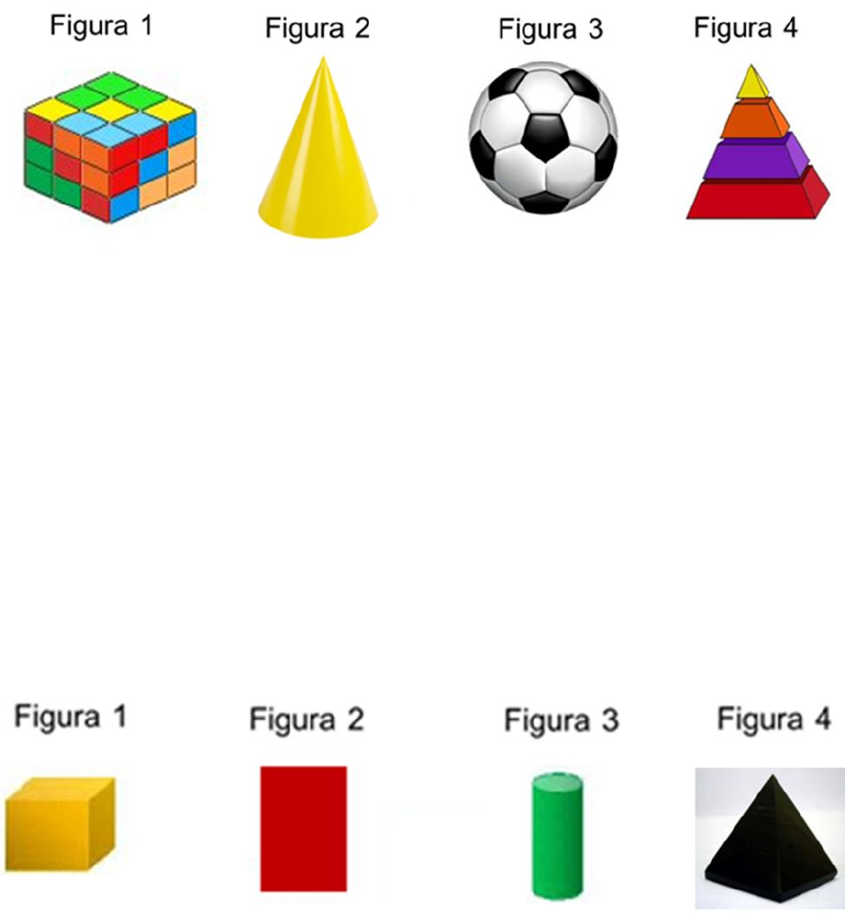 <p>Figuras geométricas planas e espaciais.</p><p>Questão 1</p><p>Qual das figuras acima representa uma esfera?</p><p>A) Figura 1;</p><p>B) Figura 2;</p><p>C) Figura 3;</p><p>D) Figura 4</p><p>Questão 2</p><p>Observando as figuras acima qual delas indica uma figura geométrica plana?</p><p>A) Figura 1;</p><p>B) Figura 2;</p><p>C) Figura 3;</p><p>D) Figura 4;</p><p>Questão 3</p><p>Aline costuma passar as férias escolares na casa de sua avó que mora em Minas Gerais, porém durante a viagem o</p><p>ônibus que ela estava quebrou e a viagem foi interrompida durante algumas horas, ela aproveitou e tirou uma foto</p><p>com sua câmera:</p><p>Observando a sinalização utilizada para indicar o ônibus quebrado, que formas geométricas você identifica?</p><p>A) Cilindro e cone;</p><p>B) Cilindro e triângulo;</p><p>C) Cone e retângulo;</p><p>D) Cone e triângulo.</p><p>Questão 4</p><p>Identifique abaixo a única figura que não é uma figura geométrica espacial:</p><p>A) Bola de futebol;</p><p>B) Chapéu de aniversário;</p><p>C) Dados;</p><p>D) Triângulo.</p><p>Questão 5</p><p>Observe atentamente a figura que representa uma das “vistas” de uma construção.</p><p>Marque a opção que apresenta uma peça que, ao ser “encaixada” na construção apresentada, modifica sua forma,</p><p>transformando-a em forma de um bloco retangular.</p><p>A) Figura 1;</p><p>B) Figura 2;</p><p>C) Figura 3;</p><p>D) Figura 4.</p><p>Questão 6</p><p>Agora que você já sabe o que são poliedros e corpos redondos, observe a figura abaixo:</p><p>Identifique quantos poliedros e quantos corpos redondos estão representados acima:</p><p>A) 2 corpos redondos e 3 poliedros;</p><p>B) 3 corpos redondos e 2 poliedros;</p><p>C) 4 corpos redondos e 5 poliedros;</p><p>D) 5 corpos redondos e 4 poliedros.</p>