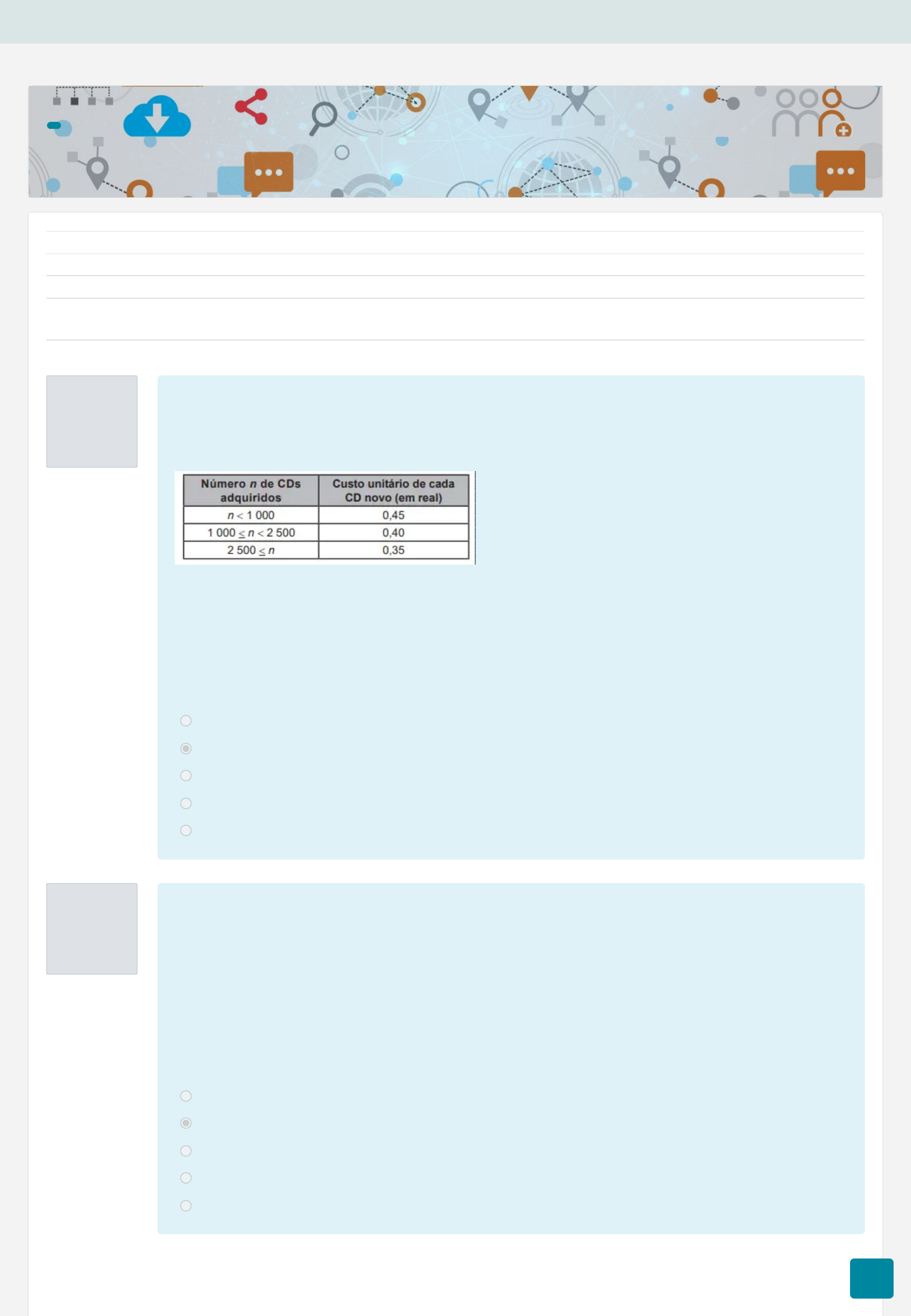 <p>31/08/2024 17:57 SIMULADO II: 30 pontos</p><p>https://virtual2.ifnmg.edu.br/mod/quiz/review.php?attempt=496624&cmid=258828 1/28</p><p>Painel / Meus cursos / FIC / Oferta Própria / Diamantina / Oferta 2024 / Descomplicando a matemática, física e biologia no ENEM</p><p>/ DIA-FIC-2024-MATTEC / 26/08/2024 a 31/08/2024 SIMULADO II: 30 pontos / SIMULADO II: 30 pontos</p><p>Questão 1</p><p>Completo</p><p>Atingiu 0,70 de</p><p>0,70</p><p>Questão 2</p><p>Completo</p><p>Atingiu 0,60 de</p><p>0,60</p><p>Iniciado em sábado, 31 ago 2024, 16:24</p><p>Estado Finalizada</p><p>Concluída em sábado, 31 ago 2024, 17:57</p><p>Tempo</p><p>empregado</p><p>1 hora 32 minutos</p><p>Avaliar 28,60 de um máximo de 30,00(95%)</p><p>Admita que um grupo musical deseja produzir seu próprio CD. Para tanto, adquire um pequeno equipamento para</p><p>gravar CDs ao valor de R$ 252,00, e vários CDs novos, sendo esses os únicos gastos realizados na produção dos CDs.</p><p>Sabe-se que o custo total na compra do equipamento e dos CDs totalizou o valor de R$ 1 008,00, e que o custo</p><p>unitário de cada CD novo, em real, varia de acordo com o número n de CDs adquiridos, segundo o quadro.</p><p>Nessas condições, o número de CDs adquiridos pelo grupo musical é igual a</p><p>Escolha uma opção:</p><p>a. 2 520</p><p>b. 1890</p><p>c. 2 880</p><p>d. 2 160</p><p>e. 1680</p><p>A meta de uma concessionária de automóveis é vender, pelo menos, 104 carros por mês. Sabe-se que, em média,</p><p>em dias em que não são oferecidos descontos, são vendidos 3 carros por dia; em dias em que há o desconto</p><p>mínimo, são vendidos 4 carros por dia; e, em dias em que há o desconto máximo, são vendidos 5 carros por dia.</p><p>No mês atual, até o fim do expediente do sexto dia em que a concessionária abriu, não foram oferecidos descontos,</p><p>tendo sido vendidos 18 carros, conforme indicava a média. Ela ainda abrirá por mais 20 dias neste mês.</p><p>A menor quantidade de dias em que será necessário oferecer o desconto máximo, de modo que ainda seja possível</p><p>a concessionária alcançar sua meta de vendas para o mês, é</p><p>Escolha uma opção:</p><p>a. 10</p><p>b. 6</p><p>c. 18</p><p>d. 11</p><p>e. 13</p><p></p><p>https://virtual2.ifnmg.edu.br/course/view.php?id=4866</p><p>https://virtual2.ifnmg.edu.br/my/</p><p>https://virtual2.ifnmg.edu.br/course/index.php?categoryid=38</p><p>https://virtual2.ifnmg.edu.br/course/index.php?categoryid=99</p><p>https://virtual2.ifnmg.edu.br/course/index.php?categoryid=424</p><p>https://virtual2.ifnmg.edu.br/course/index.php?categoryid=1502</p><p>https://virtual2.ifnmg.edu.br/course/index.php?categoryid=1587</p><p>https://virtual2.ifnmg.edu.br/course/view.php?id=4866</p><p>https://virtual2.ifnmg.edu.br/course/view.php?id=4866#section-18</p><p>https://virtual2.ifnmg.edu.br/mod/quiz/view.php?id=258828</p><p>31/08/2024 17:57 SIMULADO II: 30 pontos</p><p>https://virtual2.ifnmg.edu.br/mod/quiz/review.php?attempt=496624&cmid=258828 2/28</p><p>Questão 3</p><p>Completo</p><p>Atingiu 0,70 de</p><p>0,70</p><p>Questão 4</p><p>Completo</p><p>Atingiu 0,60 de</p><p>0,60</p><p>Aplicativos que gerenciam serviços de hospedagem têm ganhado espaço no Brasil e no mundo por oferecer opções</p><p>diferenciadas em termos de localização e valores de hospedagem. Em um desses aplicativos, o preço P a ser pago</p><p>pela hospedagem é calculado considerando um preço por diária d, acrescido de uma taxa fixa de limpeza L e de</p><p>uma taxa de serviço. Essa taxa de serviço é um valor percentual s calculado sobre o valor pago pelo total das diárias.</p><p>Nessa situação, o preço a ser pago ao aplicativo para uma hospedagem de n diárias pode ser obtido pela expressão</p><p>Escolha uma opção:</p><p>a. P = d·n + L + d·n·s</p><p>b. P = d·n + L + d·s</p><p>c. P = d·n + L + s</p><p>d. P = d + L + s</p><p>e. P = a·d·n·s + L</p><p>Uma fatura mensal de água é composta por uma taxa fixa, independentemente do gasto, mais uma parte relativa ao</p><p>consumo de água, em metro cúbico. O gráfico relaciona o valor da fatura com o volume de água gasto em uma</p><p>residência no mês de novembro, representando uma semirreta.</p><p>Observa-se que, nesse mês, houve um consumo de 7 m³ de água. Sabe-se que, em dezembro, o consumo de água</p><p>nessa residência, em metro cúbico, dobrou em relação ao mês anterior.</p><p>O valor da fatura referente ao consumo no mês de dezembro nessa residência foi</p><p>Escolha uma opção:</p><p>a. Superior a R$ 90,00 e inferior a R$ 95,00.</p><p>b. Superior a R$ 95,00.</p><p>c. Superior a R$ 65,00 e inferior a R$ 70,00.</p><p>d. Inferior a R$ 55,00.</p><p>e. Superior a R$ 80,00 e inferior a R$ 85,00.</p><p></p><p>31/08/2024 17:57 SIMULADO II: 30 pontos</p><p>https://virtual2.ifnmg.edu.br/mod/quiz/review.php?attempt=496624&cmid=258828 3/28</p><p>Questão 5</p><p>Completo</p><p>Atingiu 0,70 de</p><p>0,70</p><p>Questão 6</p><p>Completo</p><p>Atingiu 0,60 de</p><p>0,60</p><p>Segundo indicação de um veterinário, um cão de pequeno porte, nos dois primeiros meses de vida, deverá ser</p><p>alimentado diariamente com 50 g de suplemento e tomar banho quatro vezes por mês. O dono de um cão de</p><p>pequeno porte, seguindo orientações desse veterinário, utilizou no primeiro mês os produtos/serviços de um</p><p>determinado pet shop, em que os preços estão apresentados no quadro.</p><p>No mês subsequente, o fabricante reajustou o preço do suplemento, que, nesse pet shop, passou a custar R$ 9,00</p><p>cada pacote de 500 g. Visando manter o mesmo gasto mensal para o dono do cão, o gerente do pet shop decidiu</p><p>reduzir o preço unitário do banho. Para efeito de cálculos, considere o mês comercial de 30 dias.</p><p>Disponível em: http://carodinheiro.blogfolha.uol.com.br. Acesso em: 20 jan. 2015 (adaptado).</p><p>Nessas condições, o valor unitário do banho, em real, passou a ser</p><p>Escolha uma opção:</p><p>a. 29,75</