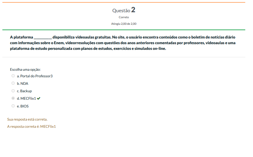 <p>Questão 2 Correto Atingiu 2.00 de 2,00 A plataforma disponibiliza videoaulas gratuitas. No site, usuário encontra conteudos como boletim de notícias diário com informações sobre o Enem, videorresoluções com questões dos anos anteriores comentadas por professores, videoaulas e uma plataforma de estudo personalizada com planos de estudos, exercícios e simulados on-line. Escolha uma opção: a. Portal do Professor3 b. NDA C. Backup d. MECFlix1 e. BIOS Sua resposta está correta. A resposta correta é: MECFlix1</p>