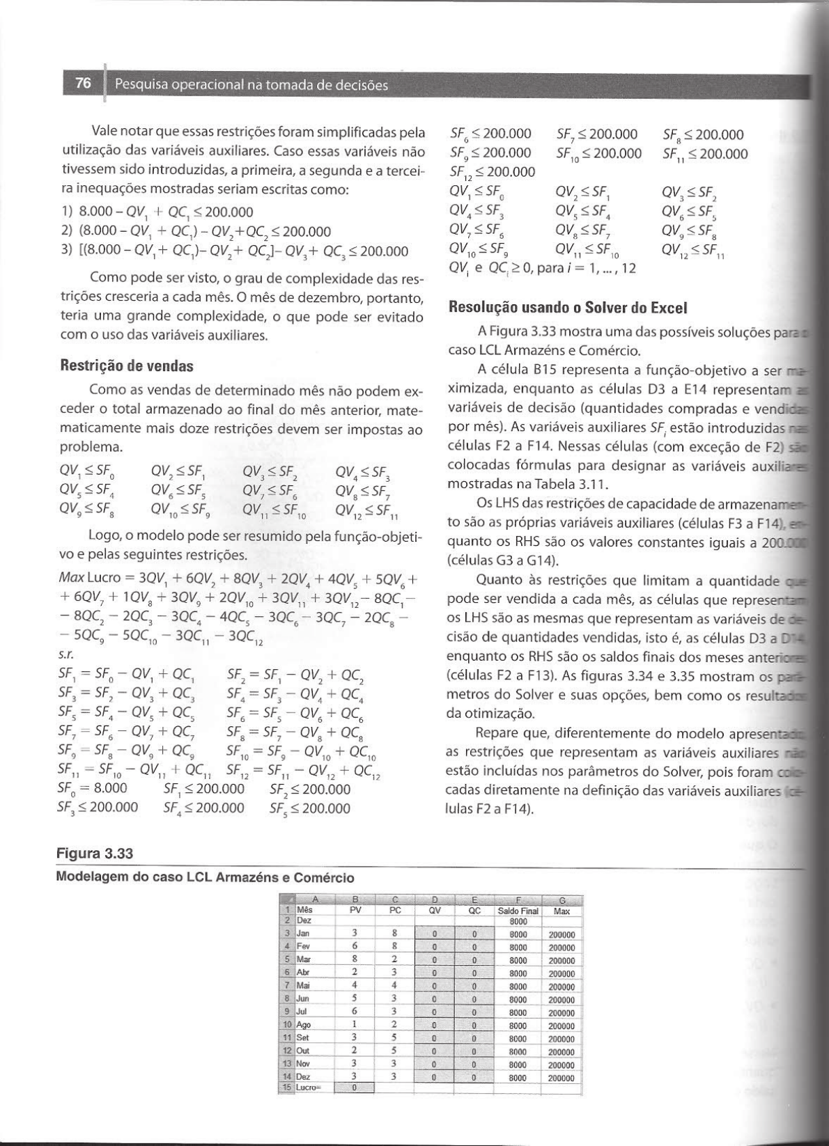 <p>76 Pesquisa operacional na tomada de decisões Vale notar que essas restrições foram simplificadas pela utilização das variáveis auxiliares. Caso essas variáveis não 200.000 tivessem sido introduzidas, a primeira, a segunda e a tercei- SF ra inequações mostradas seriam escritas como: QV, 1) 8.000 + QC, 200.000 2) (8.000 QV, 200.000 3) [(8.000 200.000 para i = 12 Como pode ser visto, o grau de complexidade das res- trições cresceria a cada mês. mês de dezembro, portanto, Resolução usando Solver do Excel teria uma grande complexidade, o que pode ser evitado com o uso das variáveis auxiliares. A Figura 3.33 mostra uma das possíveis soluções para caso LCL Armazéns e Restrição de vendas A célula B15 representa a função-objetivo a ser ma Como as vendas de determinado mês não podem ex- ximizada, enquanto as células D3 a E14 representam ceder o total armazenado ao final do mês anterior, mate- variáveis de decisão (quantidades compradas e vendidas maticamente mais doze restrições devem ser impostas ao por mês). As variáveis auxiliares SF, estão introduzidas nas problema. células F2 a F14. Nessas células (com exceção de F2) são colocadas fórmulas para designar as variáveis auxiliares mostradas na Tabela 3.11. Os LHS das restrições de capacidade de to são as próprias variáveis auxiliares (células F3 a F14), Logo, o modelo pode ser resumido pela função-objeti- quanto os RHS são os valores constantes iguais a e pelas seguintes restrições. (células G3 a G14). Max Lucro = 3QV, + 6QV, + + + + Quanto às restrições que limitam a quantidade + + + + + 8QC,- pode ser vendida a cada mês, as células que representam - os LHS são as mesmas que representam as variáveis de cisão de quantidades vendidas, isto é, as células D3 a D14 s.r. enquanto os RHS são os saldos finais dos meses anteriores (células F2 a F13). As figuras 3.34 e 3.35 mostram os = QC3 metros do Solver e suas opções, bem como os resultados = QC6 da otimização. Repare que, diferentemente do modelo apresentad = as restrições que representam as variáveis auxiliares estão incluídas nos parâmetros do Solver, pois foram SF, cadas diretamente na definição das variáveis auxiliares SF, lulas F2 a F14). Figura 3.33 Modelagem do caso LCL Armazéns e Comércio A B C D E F G 1 Mês PV PC QV QC Saldo Final Max 2 Dez 8000 3 Jan 3 8 0 0 8000 200000 4 Fev 6 8 0 0 8000 200000 5 Mar 8 2 0 0 8000 200000 6 Abr 2 3 0 0 8000 200000 7 Mai 4 4 0 0 8000 200000 8 Jun 5 3 0 0 8000 200000 9 Jul 6 3 0 0 8000 200000 10 Ago 1 2 0 0 8000 200000 11 Set 3 5 0 0 8000 200000 12 Out 2 5 0 0 8000 200000 13 Nov 3 3 0 0 8000 200000 14 Dez 3 3 0 0 8000 200000 15 Lucro- 0</p><p>Utilização de programação linear no mundo real 77 Tabela 3.11 utilizadas para definir as variáveis auxiliares auxiliar Célula Fórmula Saldo final de dezembro F2 =8.000 Saldo final de janeiro F3 =F2 D3 + E3 Saldo final de fevereiro F4 =F3 D4 + E4 Saldo final de março F5 =F4 D5 + E5 Saldo final de abril F6 =F5 D6 + E6 Saldo final de maio F7 =F6 D7 + E7 Saldo final de junho F8 =F7 D8 + E8 Saldo final de julho F9 =F8 D9 + E9 Saldo final de agosto F10 =F9 D10 + E10 Saldo final de setembro F11 =F10 D11 + E11 Saldo final de outubro F12 =F11 D12 + E12 Saldo final de novembro F13 =F12 D13 + E13 Saldo final de dezembro F14 =F13 D14 + E14 Figura 3.34 e opções do Solver do caso LCL Armazéns e Comércio Parâmetros do Solver Opções do Solver Definir célula de destino: $8$15 Tempo máximo: 100 segundos OK Igual a: Máx Min Va Células variáveis: Iterações: 100 Cancelar $D$3:$E$14 Predsão: 0,000001 Carregar modelo Submeter às restrições: Tolerância: 5 % Salvar modelo $D$3:$D$14</p><p>78 Pesquisa operacional na tomada de decisões 3.2.6 Fluxo de caixa multiperíodo para o pagamento da obra. Esse total será todo invest do em uma das aplicações disponíveis no início do Caso LCL Restaurantes Ltda. 1, já que não temos que fazer nenhum adiantamenti à construtora. Logo, nossa função-objetivo pode A LCL Restaurantes Ltda. está construindo um novo matematicamente traduzida pela soma das restaurante que integrará a sua cadeia no próximo verão. no início do mês 1 (já que não vamos deixar Para tal, necessita de um total R$ 500.000,00 que serão pagos à construtora em duas parcelas de R$ 150.000,00 centavo sem ser aplicado), isto é: ao final do segundo e quinto meses, e uma parcela de Min ao término da construção, no fim do sétimo 4) Com que restrições? Nesse caso, as restrições mês. A empresa dispõe de quatro tipos de investimentos tes são relativas apenas ao valor disponível para page (Tabela 3.12), que podem ser utilizados a fim de gerar mento da obra, além, naturalmente, das restrições caixa para quitar a construção de maneira a reduzir a ne- não-negatividade das variáveis de cessidade total de caixa. Modele o problema de maneira a determinar quando Restrição de fluxo de caixa e quais tipos de investimento devem ser realizados a fim Queremos minimizar a alocação de recursos na data de minimizar o total que deve ser alocado no início da isto é, o total alocado adicionado aos juros recebidos deve construção. igualar as diversas parcelas de pagamentos existentes. Tabela 3.12 temos uma opção de investimento disponível para Informações referentes aos tipos de investimentos em todos os períodos com retorno no período seguinte, tal líquido estará sempre aplicado. Portanto, a soma do Aplicação Meses de Retorno ao dos investimentos de um mês (capital mais juros) subtraído disponível no Investimento duração da final do início dos valor total a ser reinvestido em uma das opções de aplicação investimento meses to deve igualar ao total de pagamentos do mês. Matematica 1, 2. 3, 4, 5. mente, podemos representar as sete restrições como se Tipo A 1 6,7 (considere i, = 0,015, = 0,045 0,09 e Tipo B 2 3,2% de um mês igual ao final do mês anterior): Tipo C 1,4 3 4,5% (final do mês) Tip