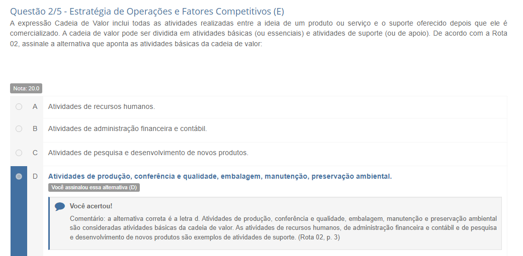<p>Questão 2/5 - Estratégia de Operações e Fatores Competitivos (E) A expressão de Valor inclui todas as atividades realizadas entre a ideia de um produto ou serviço e suporte oferecido depois que ele é comercializado. A de valor pode ser dividida em atividades básicas (ou essenciais) e atividades de suporte (ou de apoio). De acordo com a Rota 02. assinale a alternativa que aponta as atividades básicas da cadeia de Nota: A Atividades de recursos B Atividades de administração financeira e C Atividades de pesquisa e desenvolvimento de novos produtos. D Atividades de produção, conferência e qualidade, embalagem, manutenção, preservação Você assinalou essa (D) Você acertou! Comentário: a alternativa correta é a letra d. Atividades de conferência e qualidade, embalagem, manutenção e preservação ambiental são consideradas atividades básicas da cadeia de valor. As atividades de recursos de administração financeira e contábil e de pesquisa e desenvolvimento de novos produtos são exemplos de atividades de suporte. (Rota 02. p. 3)</p>