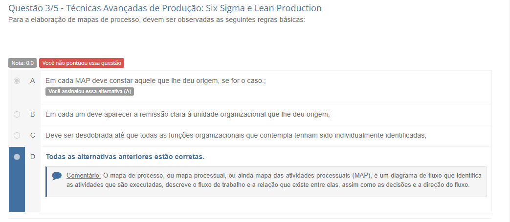 <p>Questão 3/5 - Técnicas Avançadas de Produção: Six Sigma e Lean Production Para a elaboração de mapas de processo, devem ser observadas as seguintes regras Nota: 0.0 Você não pontuou essa questão A Em cada MAP deve constar aquele que deu origem, se for Você assinalou essa alternativa (A) B Em cada um deve aparecer a remissão clara à unidade organizacional que deu origem; C Deve ser desdobrada até que todas as funções organizacionais que contempla tenham sido individualmente D Todas as alternativas anteriores estão Comentário: mapa de processo, ou mapa ou ainda mapa das atividades processuais (MAP), é um diagrama de fluxo que identifica as atividades que são descreve 0 fluxo de trabalho e a relação que existe entre assim como as decisões e a direção do fluxo.</p>
