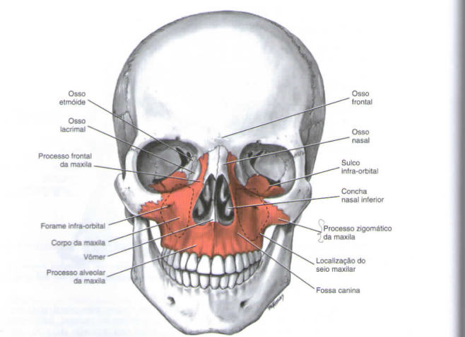 <p>Osso Osso etmóide frontal Osso lacrimal Osso nasal Processo frontal da maxila Sulco infra-orbital Concha nasal inferior Forame infra-orbital Processo da maxila Corpo da maxila Localização do Processo alveolar seio maxilar da maxila Fossa canina</p>