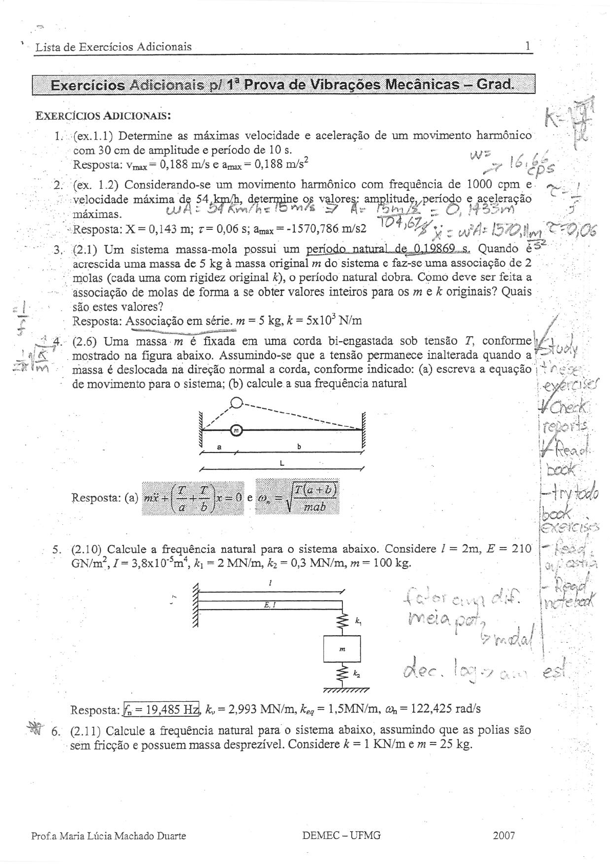 <p>Lista de Exercícios Adicionais 1 Exercícios Adicionais p/ Prova de Vibrações Mecânicas Grad. EXERCÍCIOS ADICIONAIS: 1. (ex.1.1) Determine as máximas velocidade e aceleração de um movimento harmônico com 30 cm de amplitude e período de 10 S. Resposta: e amax = 0,188 m/s2 cps 2. (ex. 1.2) Considerando-se um movimento harmônico com frequência de 1000 cpm e velocidade máxima de 54 km/h, determine os valores: amplitude período e aceleração máximas. WA= 54 A= = 0,1433m Resposta: X 0,143 m; amax m/s2 T=0,06 = = - 3. (2.1) Um sistema massa-mola possui um período natural de 0,19869 S. Quando acrescida uma massa de 5 kg à massa original m do sistema e faz-se uma associação de 2 molas (cada uma com rigidez original k), o período natural dobra. Como deve ser feita a associação de molas de forma a se obter valores inteiros para os m e k originais? Quais são estes valores? Resposta: Associação em série. m = 5 kg, k = N/m 4. (2.6) Uma massa m é fixada em uma corda bi-engastada sob tensão T, conforme mostrado na figura abaixo. Assumindo-se que a tensão permanece inalterada quando a massa é deslocada na direção normal a corda, conforme indicado: (a) escreva a equação these de movimento para o sistema; (b) calcule a sua frequência natural exercises m reports a b KRead L book Resposta: (a) mx + - mab -trytodo book exercises 5. (2.10) Calcule a frequência natural para o sistema abaixo. Considere = 2m, E = 210 - I = = 2 MN/m, k2 = 0,3 MN/m, m = 100 kg. - Read notebeck meia m dec. est Resposta: = = 2,993 MN/m, = 1,5MN/m, On = 122,425 rad/s 6. (2.11) Calcule a frequência natural para o sistema abaixo, assumindo que as polias são sem fricção e possuem massa desprezível. Considere k=1 Prof.a Maria Lúcia Machado Duarte DEMEC - UFMG 2007</p><p>Lista de Exercícios Adicionais 3 amplitude máxima, 3) a amplitude do sistema considerando um tempo de 2,85 S, 4) o tempo necessário para que a amplitude de resposta do sistema seja sempre inferior a 1 cm. Considere: (a) sistema sem amortecimento; (b) sistema sub-amortecido (para = 0,25); (c) sistema criticamente amortecido; (d) sistema super-amortecido (para e (e) sistema infinitamente amortecido, Comente os resultados encontrados. Resposta: a) sem b) c) infin. amort. amort. 1) Xmax 792,15 cm 581.42 m 328,18 m 188.55 m 50 cm 2) para Xmax 0,477 S S S S Todos 3) x(2,85s) 270,98 cm cm 0,93 cm 34,27 cm 50 cm 4) para Não existe > + 4td > 8,25 Não existe De forma genérica, escreva a equação de movimento para o sistema mostrado na figura abaixo utilizando a coordenada para sua solução. A barra está submetida a uma carga harmônica no seu vão central e um momento na sua extremidade direita, conforme indicados na figura. Assumindo agora que a = 95 rad/s, M = 25 kg; = 50 N.s/m; k=0,5 MN/m; L = 2,5 m; = 100 N e calcule qual será a amplitude de regime permanente da barra para esta coordenada. M T L/2 L/4 L/4 k Resposta: 48 16 = 11. (3.2) Para o sistema mostrado na figura abaixo, determine: (a) a equação de movimento para o sistema utilizando a coordenada x como coordenada generalizada para o problema, (b) a amplitude em regime permanente do bloco. (c) a frequência onde ocorrerá a máxima amplitude e o valor desta amplitude; (d) o valor da amplitude na ressonância. Considere para isto: m = 25 kg; I = r = 2,5 cm; k = 1 MN/m; = 1 KN.s/m; = 350 rad/s. k 2r m k Resposta: (a) (b) X = 2,416 mm; (c) fmax = 12,047 Hz e (d) Xres = 45,969 mm. Prof.a Maria Lúcia Machado Duarte UFMG 2007</p><p>/ / IS in = 1000 kg a = 0,6582 + 22,22 = 1,481 14,141 m Wm 16,882 Wm=14,141 K Wm 1. = 92.196 14,141 2,2 35,13 m= 100 kg K= 103 W= 314,16 + Kee= tilibra</p><p>In = 20 A = In CW = 3002 Wa 4.106 100 f= n=w = 75,4 100 (cw)2 Xa= = m=50kg K=?</p><p>/ 3.5 F=Fo x + 1 0,58 I = = = 0,40 0.0 V t 01 W= 104,721 = = 919869 0,00099K, T = K2 =) / Serie m, 26,</p><p>/ / QUESTAS 04 = a b Ix Tx Tx, & a + a b m K = 2,993 = M K2 = 122,425 m - H. 06 = - ask - K Ky 24</p>