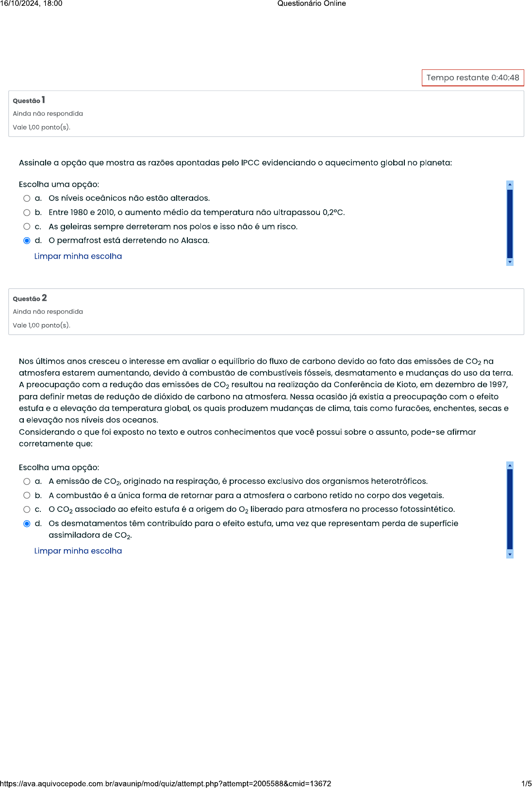 <p>16/10/2024, 18:00 Questionário Online Tempo restante 0:40:48 Questão 1 Ainda não respondida Vale 1,00 ponto(s). Assingle a opção que mostra as razões apontadas pelo IPCC evidenciando o aquecimento global no planeta: Escolha uma opção: a. Os níveis oceânicos não estão alterados. b. Entre 1980 e 2010, o aumento médio da temperatura não ultrapassou 0,2°C. C. As geleiras sempre derreteram nos polos e isso não é um risco. d. permafrost está derretendo no Alasca. Limpar minha escolha Questão 2 Ainda não respondida Vale 1,00 ponto(s). Nos últimos anos cresceu interesse em o equilíbrio do fluxo de carbono devido ao fato das emissões de CO2 na atmosfera estarem aumentando, devido à combustão de combustíveis fósseis, desmatamento e mudanças do uso da terra. A preocupação com a redução das emissões de CO2 resultou na realização da Conferência de Kioto, em dezembro de 1997, para definir metas de redução de dióxido de carbono na Nessa ocasião já existia a preocupação com efeito estufa e a elevação da temperatura global, os quais produzem mudanças de clima, tais como enchentes, secas e a elevação nos níveis dos oceanos. Considerando que foi exposto no texto e outros conhecimentos que você possui sobre assunto, pode-se afirmar corretamente que: Escolha uma opção: a. A emissão de originado na respiração, é processo exclusivo dos organismos heterotróficos. b. A combustão é a única forma de retornar para a atmosfera o carbono retido no corpo dos vegetais. C. CO2 associado ao efeito estufa é a origem do O2 liberado para atmosfera no processo fotossintético. d. Os desmatamentos têm contribuído para o efeito estufa, uma vez que representam perda de superfície assimiladora de CO2. Limpar minha escolha 1/5</p><p>16/10/2024, 18:00 Questionário Online Questão 3 Ainda não respondido Vale 1,00 ponto(s). Dióxido de carbono, óxido nitroso e metano são gases que aumentam efeito estufa no planeta. As principais atividades humanas emissoras desses gases são: I. e queima de combustíveis fósseis e desmatamentos. II. e desmatamento e queima de campos e florestas. III. utilização de fertilizantes inorgânicos. Estão corretas as afirmativas: Escolha uma opção: a. III. b. I, e III. Limpar minha escolha Questão 4 Ainda não respondida Vale 1,00 ponto(s). A definição de desenvolvimento sustentável mais usualmente utilizada é a que procura atender às necessidades atuais sem comprometer a capacidade das gerações futuras. mundo assiste a um questionamento crescente de paradigmas estabelecidos na economia e também na cultura política. A crise ambiental no planeta, quando traduzida na mudança climática, é uma ameaça real ao pleno desenvolvimento das potencialidades dos países. Brasil está em uma posição privilegiada para enfrentar os enormes desafios que se acumulam. Abriga elementos fundamentais para desenvolvimento: parte significativa da biodiversidade e da água doce existente no planeta, grande extensão de terras cultiváveis, diversidade étnica e cultural e rica variedade de reservas naturais. campo do desenvolvimento sustentável pode ser conceitualmente dividido em três componentes: sustentabilidade ambiental, sustentabilidade econômica e sustentabilidade sociopolítica. Nesse contexto, o desenvolvimento sustentável Escolha uma opção: a. reconhecimento de que, apesar de os recursos naturais serem ilimitados, deve ser traçado um novo modelo de desenvolvimento econômico para a humanidade. b. Redefinição de critérios e instrumentos de avaliação de custo-benefício que reflitam os efeitos socioeconômicos e os valores reais do consumo e da preservação. C. A redução do consumo das reservas naturais com a consequente estagnação do desenvolvimento econômico e tecnológico. d. A preservação do equilíbrio global e do valor das reservas de capital natural, o que não justifica a desaceleração do desenvolvimento econômico e político de uma Limpar minha escolha 2/5</p><p>16/10/2024, 18:00 Questionário Online Questão 5 Ainda não respondida Vale 1,00 ponto(s). Sobre os períodos glaciais e interglaciais, analise as afirmativas: I. Vivemos em um período interglacial há 12 mil anos. II. Períodos glaciais congelaram o planeta. III. planeta apresenta um efeito estufa natural. Estão corretas as afirmativas: Escolha uma opção: a. III. b. II. d. e III. Limpar minha escolha Questão 6 Ainda não respondida Vale 1,00 ponto(s). Com relação à interferência humana no meio ambiente, a afirmativa correta: Escolha uma opção: a. poluente óxido nitroso, liberado na queima de combustíveis fosseis, contribui para a acentuação do efeito estufa. b. A poluição marinha por vazamento de óleo contribui para os autotróficos absorverem a radiação solar. C. Quando queima combustíveis fósseis, homem interfere no ciclo de nitrogênio da natureza, propiciando, principalmente, a produção de nitritos e, em menor escala, de nitratos. d. Embora se constitua no principal fator do aumento da concentração de gás carbônico atmosférico, a queima de florestas não compromete o equilíbrio ecológico. Limpar minha escolha Questão 7 Ainda não respondida Vale 1,00 ponto(s). efeito estufa é um processo que faz com que a temperatura da Terra seja maior do que a que existiria na ausência de atmosfera e é, dentro de uma determinada faixa, de vital importância, pois, sem ele, a vida não poderia existir. que se pode tornar catastrófico é um agravamento do efeito estufa que desestabilize o equilíbrio energético no planeta e origine um maior aquecimento global. Com relação ao referido tema, marque a alternativa falsa. Escolha uma opção: a. Na natureza, os principais sequestradores de CO2 são os organismos fotossintetizantes. b. Os únicos componentes atmosféricos responsáveis pelo efeito estufa são gás carbônico, o metano e dióxido de nitrogênio. C. superaquecimento das regiões tropicais e subtropicais con