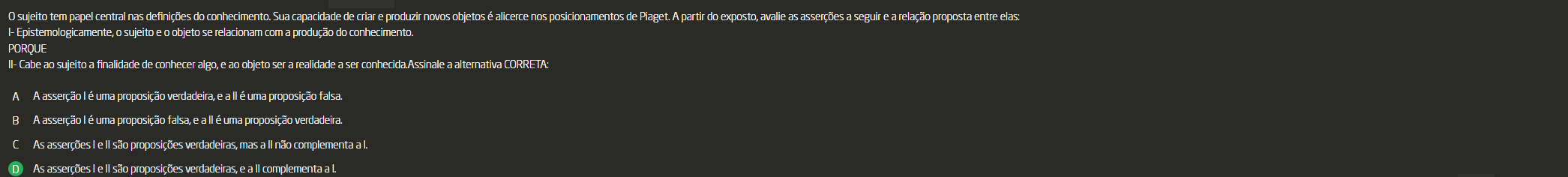 sujeito tem papel central nas definições do conhecimento. Sua capacidade de criar e produzir novos objetos é alicerce nos posicionamentos de Piaget A partir do exposto, avalie as asserções a seguir e a relação proposta entre elas: Epistemologicamente, sujeito e objeto se relacionam com a produção do conhecimento. ORQUE Cabe ao sujeito a finalidade de conhecer algo, e ao objeto ser a realidade a ser conhecida.Assinale a alternativa CORRETA: A asserção é uma proposição verdadeira, e all é uma proposição falsa. A asserção é uma proposição falsa. e allé uma proposição verdadeira. As asserções e II são proposições verdadeiras, mas a não complementa As asserções II são proposições verdadeiras, e all complementa al.