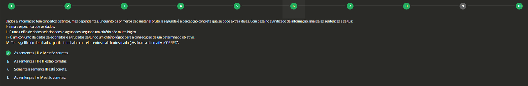 1 2 3 5 6 7 8 g Dados e informação têm conceitos distintos, mas dependentes Enquanto os primeiros são material bruto, a segunda é a percepção concreta que se pode extrair deles. Com base no significado de informação, analise as sentenças a seguir: É mais específica que os É uma união de dados selecionados e agrupados segundo um critério não muito lógico. É um conjunto de dados selecionados e agrupados segundo um critério lógico para a consecução de um determinado objetivo. Tem significado detalhado a partir do trabalho com elementos mais brutos a alternativa CORRETA: As sentenças I, IV estão : As sentenças I, III estão corretas. Somente a sentença III está correta. As sentenças IV estão