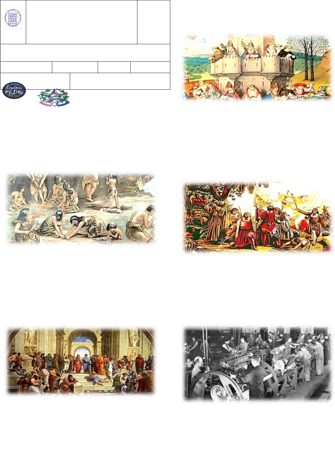 <p>GOVERNO DO ESTADO DO ESPÍRITO SANTO</p><p>SECRETARIA DE ESTADO DA EDUCAÇÃO</p><p>SUPERINTENDÊNCIA REGIONAL DE EDUCAÇÃO CARIACICA</p><p>EEEFM HUNNEY EVEREST PIOVESAN</p><p>ALUNO/A:_________________________________________________</p><p>SÉRIE/TURMA:</p><p>DATA:__/__/__</p><p>VALOR:</p><p>NOTA: _________</p><p>COMPONENTE: HISTÓRIA</p><p>Prof. VINICIUS DE PAULA FERREIRA</p><p>PERÍODOS HISTÓRICOS</p><p>As marcações dos períodos históricos foram determinadas pelos historiadores em 1900, quando escolheram os marcos temporais com base nos eventos considerados os mais importantes da história.</p><p>PRÉ-HISTÓRIA</p><p>Foi o período do surgimento da humanidade até aproximadamente 4000 a. C., quando surgiu a escrita. Nessa época, o homem passou pelo processo de adaptação ao seu ambiente para obter condições de sobrevivência.</p><p>IDADE ANTIGA</p><p>Esse período teve como marco importante o surgimento da escrita por volta de 4000 a. C. até 476 d. C., época do enfraquecimento e queda do Império Romano do Ocidente. Muitos povos se fixaram, desenvolveram a agricultura, o pastoreio, a metalurgia e o comércio. Surgiram também diversas civilizações, como a egípcia e a fenícia</p><p>IDADE MÉDIA</p><p>Período que se estendeu de 476 a 1453, quando Constantinopla foi tomada por muçulmanos. Na Europa, a economia baseava-se na agricultura e no servilismo dos camponeses aos senhores feudais, que eram os donos das terras.</p><p>IDADE MODERNA</p><p>Período de 1453 a 1789. Foi marcada pela revolução francesa e o enfraquecimento do regime monárquico na França. Houve uma grande expansão da Europa para várias partes do mundo, como Ásia, África e América.</p><p>IDADE CONTEMPORÂNEA</p><p>Período de 1789 até a atualidade. Teve seu início com a queda da Bastilha. As manufaturas e fábricas se expandiram e adotaram novos recursos para o aumento de produção. Grande parte da população deixou os campos para viver nas cidades.</p><p>ATIVIDADES DE FIXAÇÃO</p><p>1. A história está dividida em quantos períodos? Quais são eles?</p><p>_______________________________________________________________________________________________________________</p><p>2. Em 1453, Constantinopla foi tomada pelos</p><p>a) portugueses.</p><p>b) camponeses.</p><p>c) muçulmanos.</p><p>d) senhores feudais.</p><p>3. Quem denominou as marcações do período histórico? Isso aconteceu em que ano?</p><p>____________________________________________________________________</p><p>4. Associe os períodos históricos aos seus acontecimentos marcantes.</p><p>(1) Pré-história</p><p>(2) Idade antiga</p><p>(3) Idade média</p><p>(4) Idade moderna</p><p>(5) Idade contemporânea</p><p>( ) Expansão industrial</p><p>( ) Avanço da agricultura e comércio.</p><p>( ) Revolução Francesa</p><p>( ) Início da humanidade.</p><p>( ) Feudalismo</p><p>5. Marque a alternativa cuja imagem se refere ao período da Idade Antiga.</p><p>6. Que acontecimento importante marcou o início da Idade Antiga?</p><p>____________________________________________________________________</p><p>7. Conforme a leitura, podemos perceber que estamos vivendo no período histórico da</p><p>a) Idade Média.</p><p>b) Idade Antiga.</p><p>c) Idade Moderna.</p><p>d) Idade Contemporânea.</p><p>8. Em que período histórico boa parte da população deixou de viver na zona rural e passou a ocupar as cidades em busca de melhores condições financeiras?</p><p>a) Pré-história.</p><p>b) Idade Contemporânea.</p><p>c) Idade Moderna.</p><p>d) Idade Média.</p><p>9. Observe a imagem e responda à questão:</p><p>Qual período histórico a imagem está representando?</p><p>_________________________________</p><p>10. A idade contemporânea iniciou-se devido a um acontecimento que ocorreu em 1789. Qual foi ele?</p><p>a) Queda da Bastilha.</p><p>b) Revolução francesa.</p><p>c) Aumento na produção e economia.</p><p>d) Surgimento das fábricas e manufaturas.</p><p>image5.jpeg</p><p>image6.jpeg</p><p>image7.jpeg</p><p>image8.jpeg</p><p>image9.jpeg</p><p>image10.jpeg</p><p>image1.png</p><p>image2.png</p><p>image3.png</p><p>image4.jpeg</p>